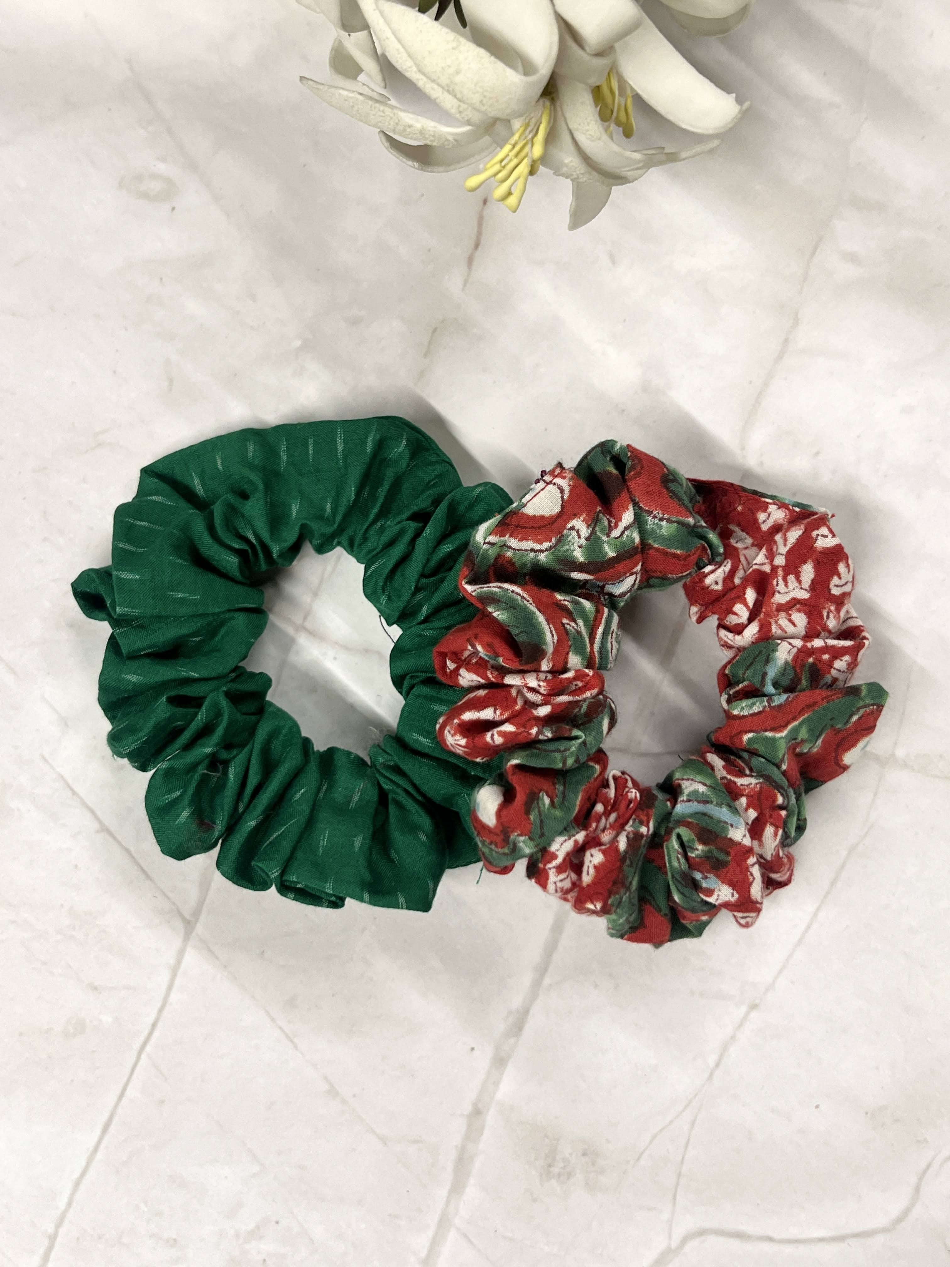 - Handloom fabrics upcycled into a pair of colourful hair ties/scrunchies.