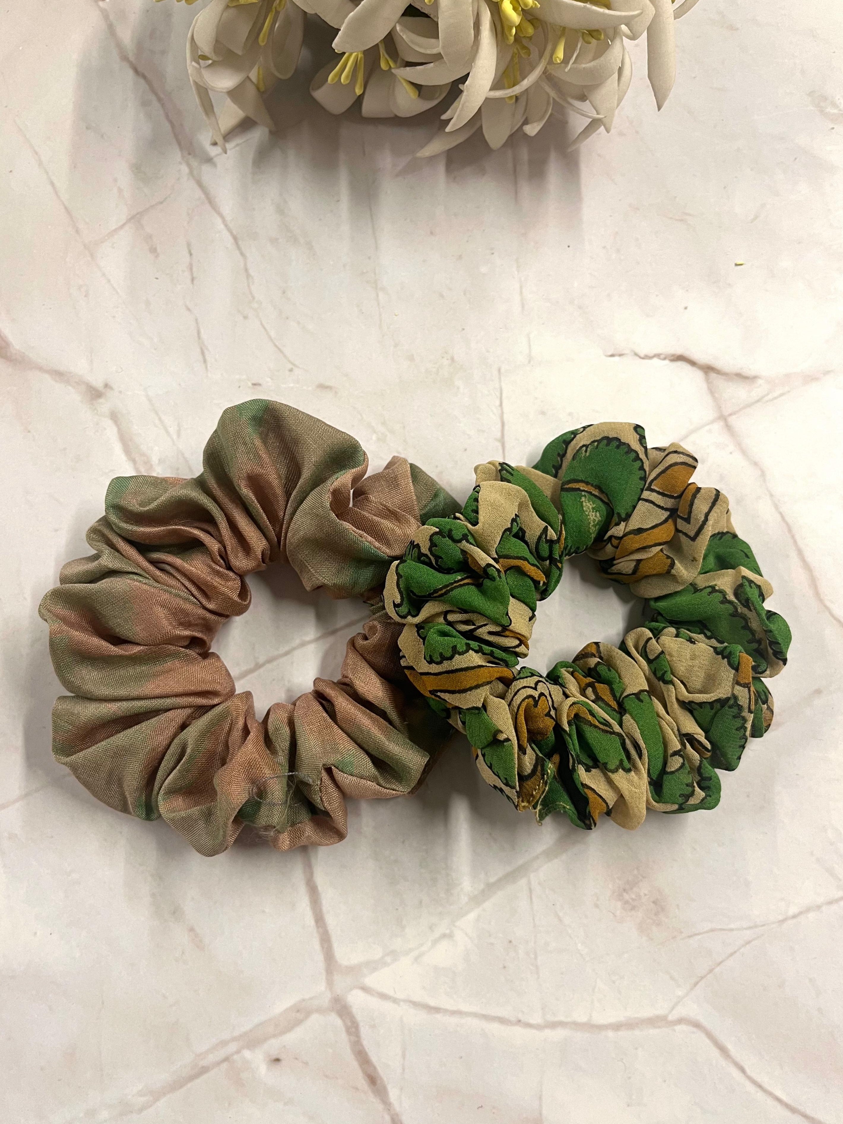 • Handloom fabrics upcycled into a pair of colourful hair ties/scrunchies.