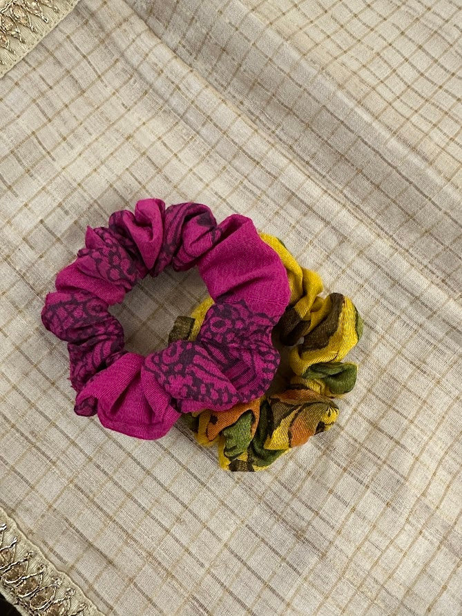 Handloom fabrics upcycled into a pair of colourful hair ties/scrunchies