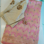 Light pink handwoven pure silk saree with all over floral pattern in pure gold zari enhanced with teal and pink in Benaras weave. The border of the saree has unique floral and geometric pattern in gold zari. The pallu of the saree is woven in light pink with geometric pattern in gold zari. Blouse :Light pink silk with zari border It can be paired with any silver jewelry and ready to wear blouse to add more shine and colour and the same can be purchased from the Accessories and Ready to wear section respectively. Note : The tailored blouse featured is only for reference. more