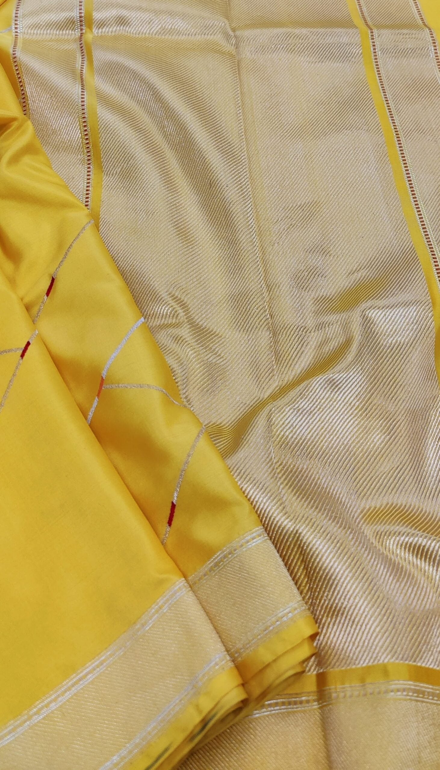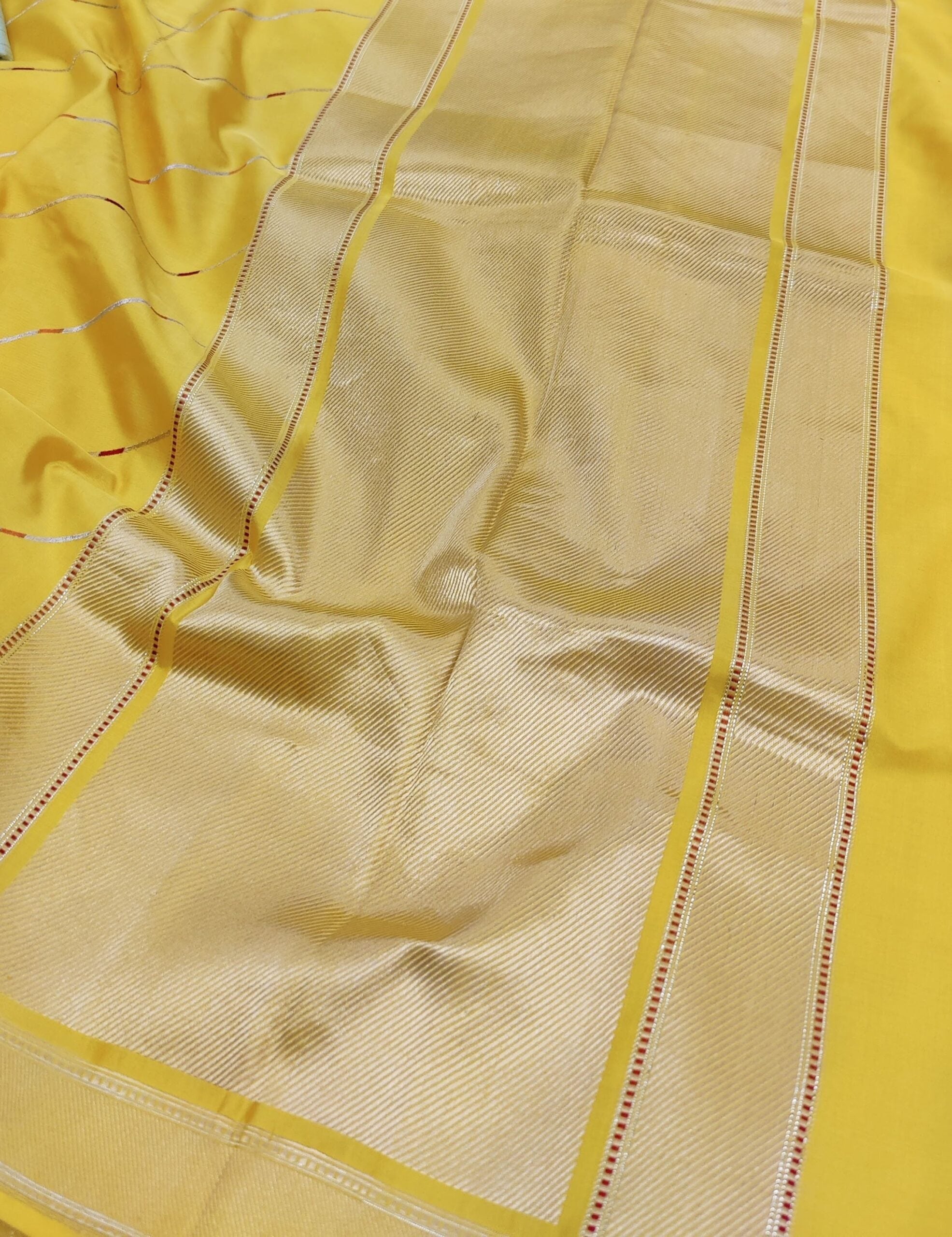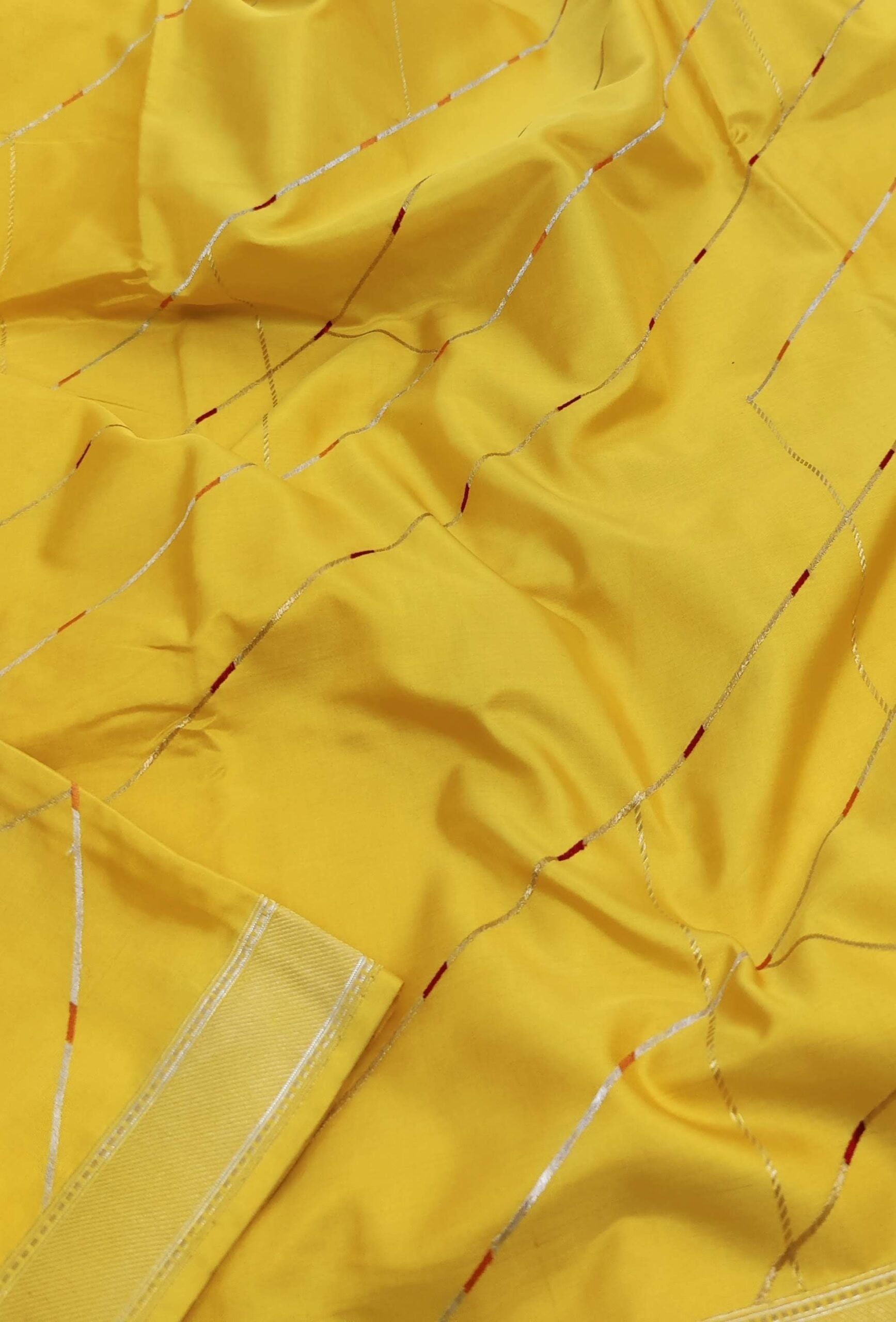 Yellow handwoven pure silk saree with geometric stripes all over the body in Benaras weave. The border of the saree has diagonal stripes in gold zari. The pallu of the saree is woven in yellow with diagonal stripes in gold zari.