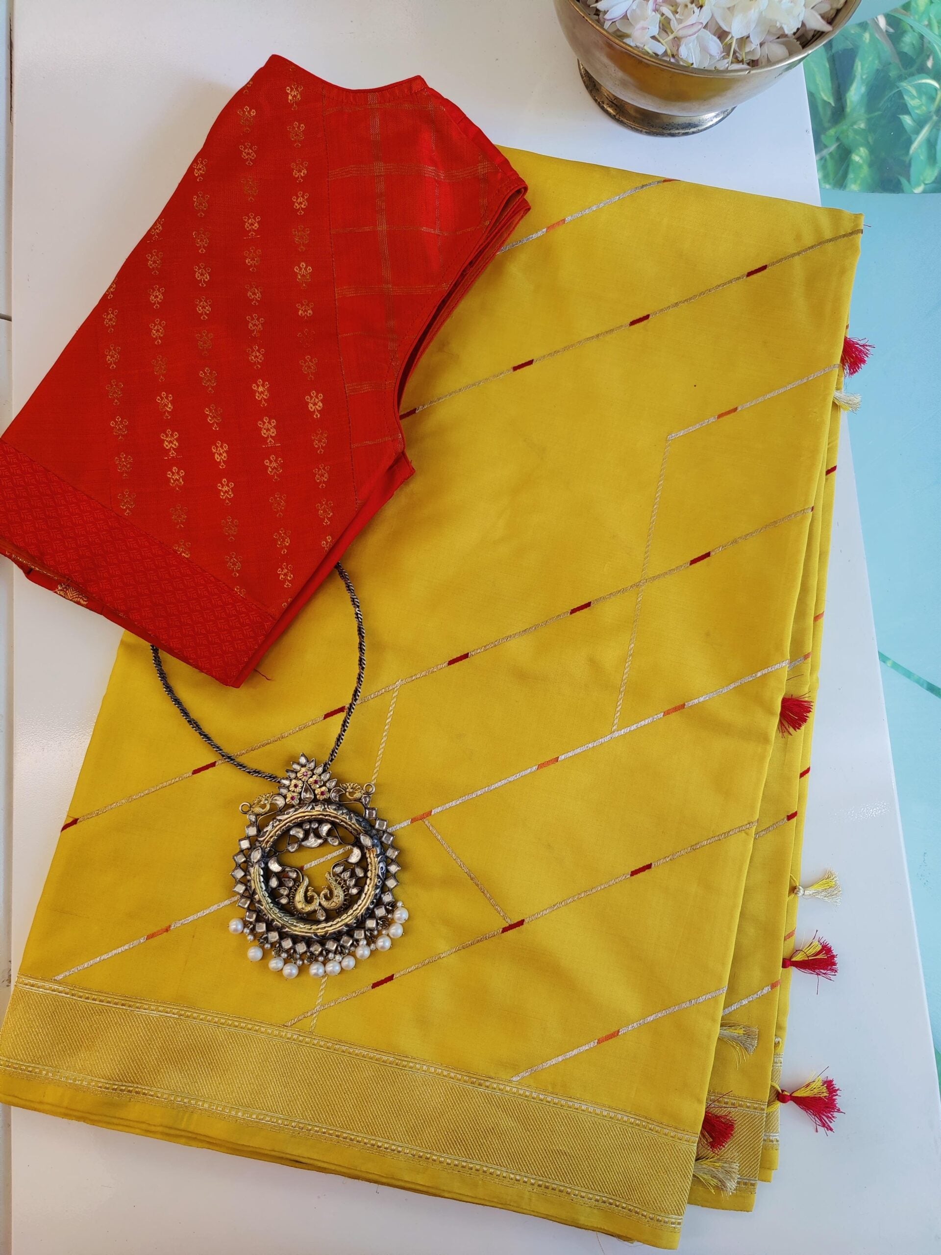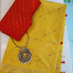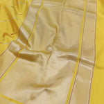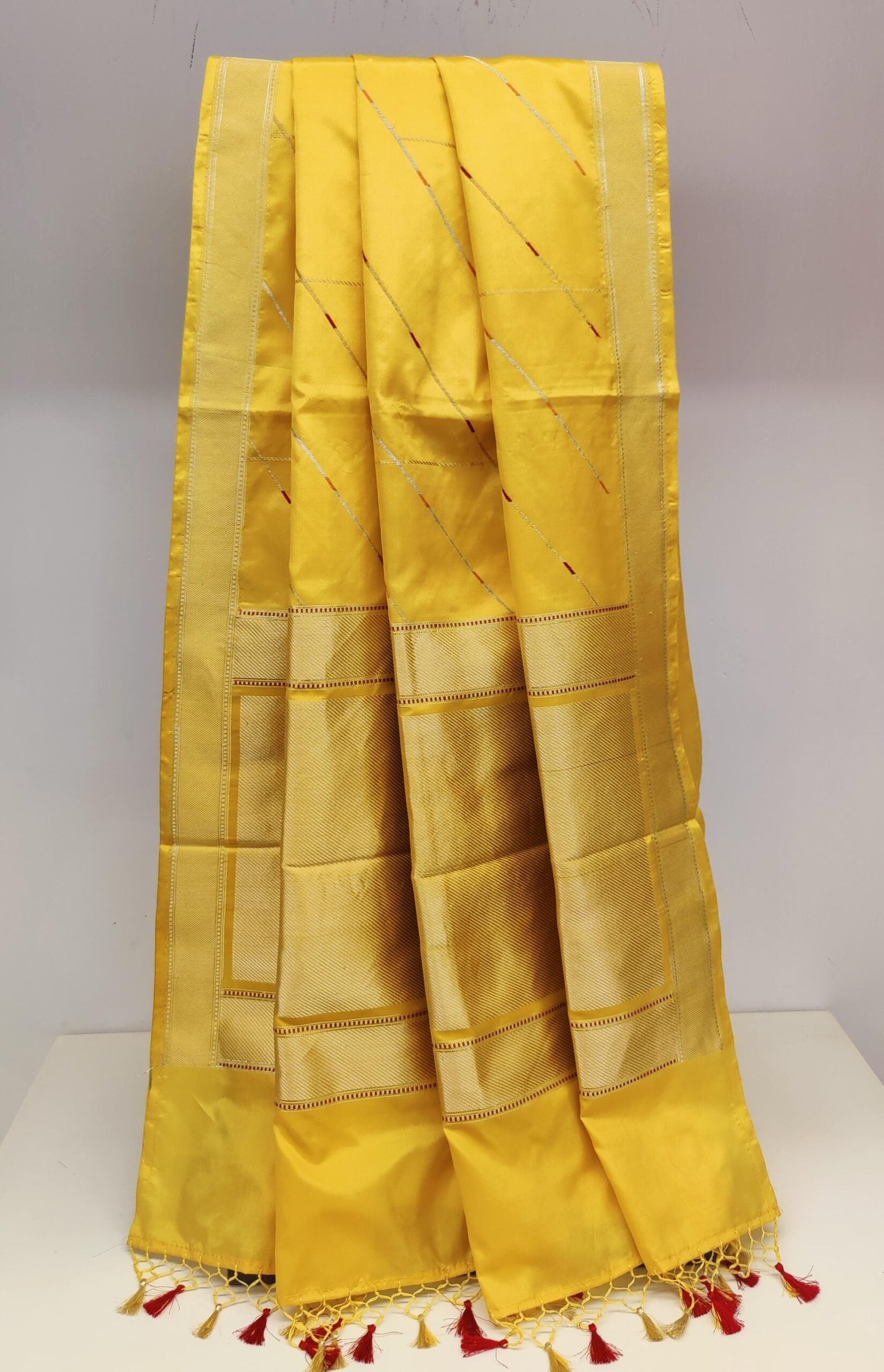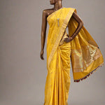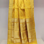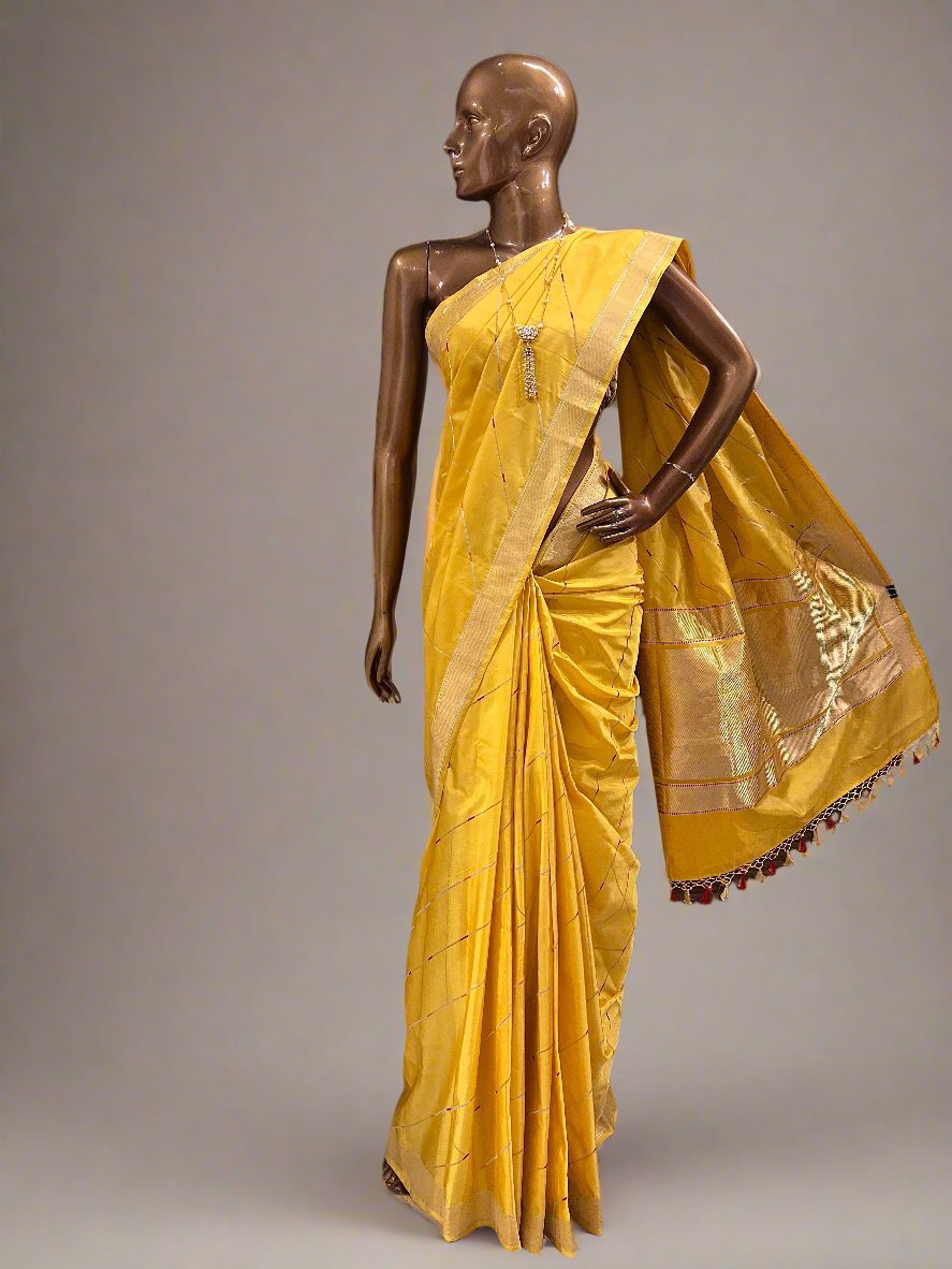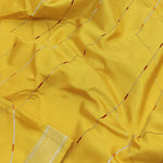 Yellow handwoven pure silk saree with geometric stripes all over the body in Benaras weave. The border of the saree has diagonal stripes in gold zari. The pallu of the saree is woven in yellow with diagonal stripes in gold zari.
