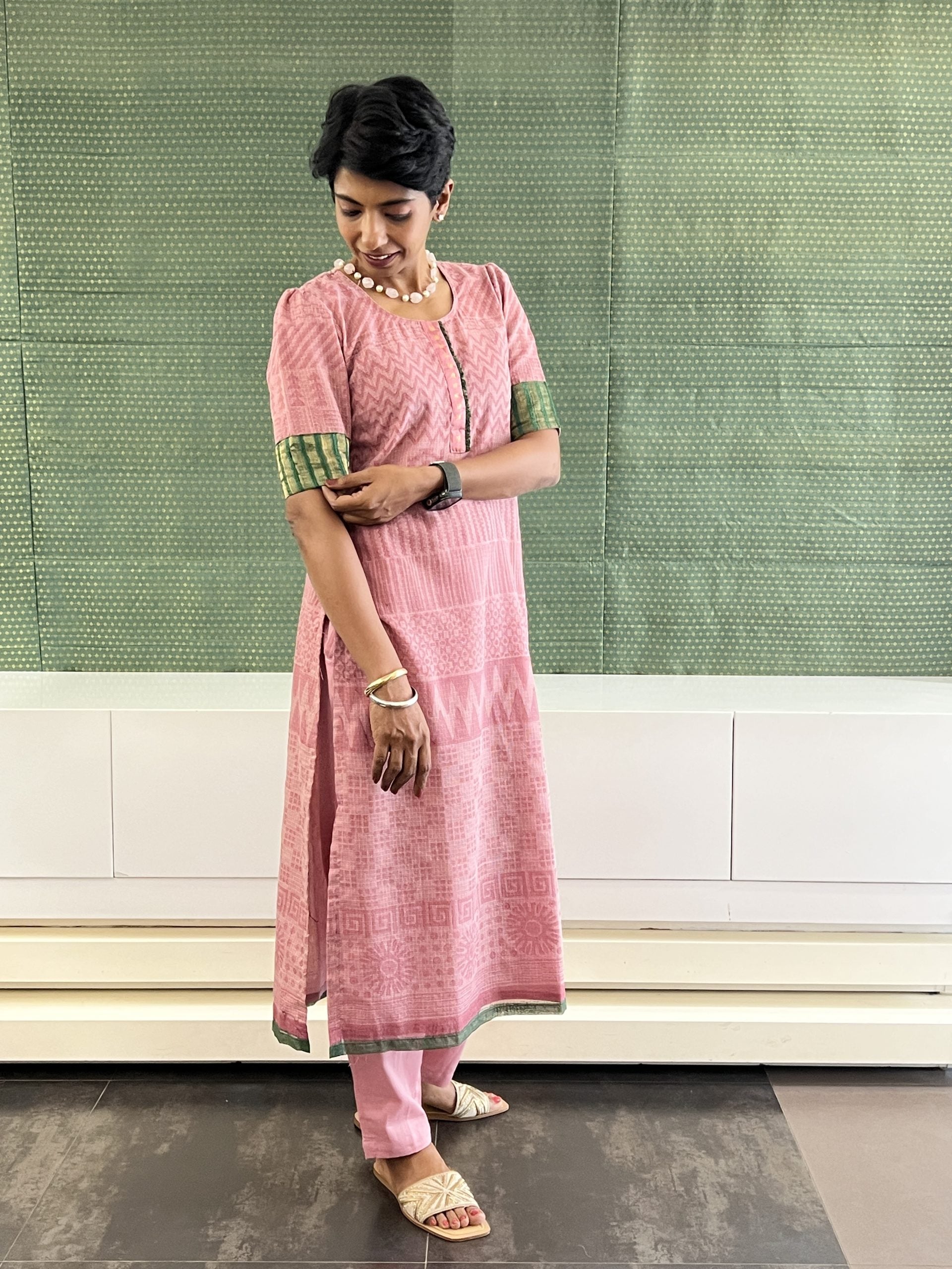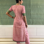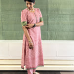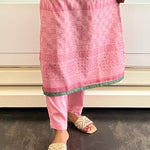 Dusty pink soft cotton straight pants with elastic at the back and band and drawstring at the front with side pockets.