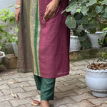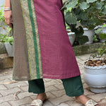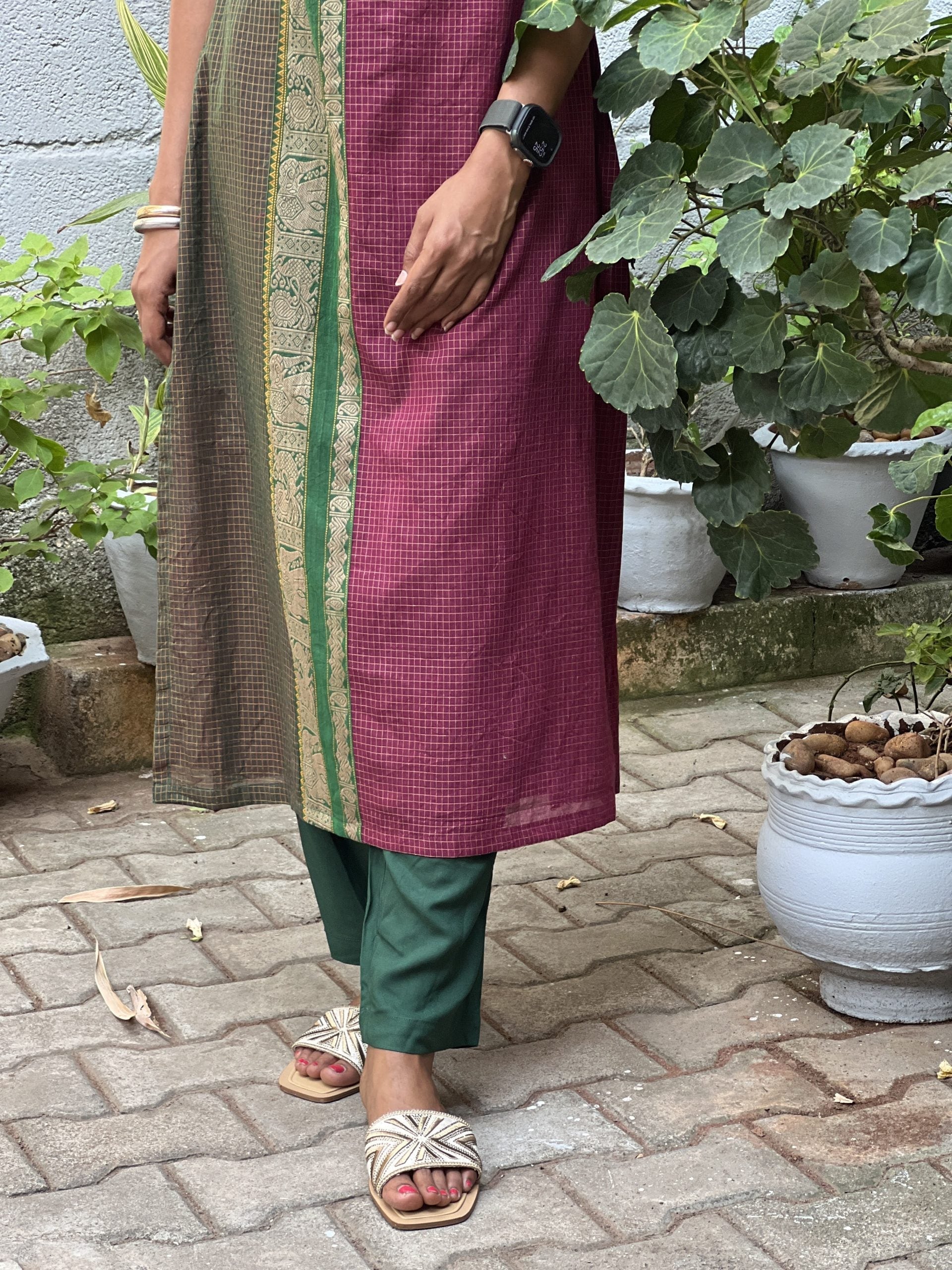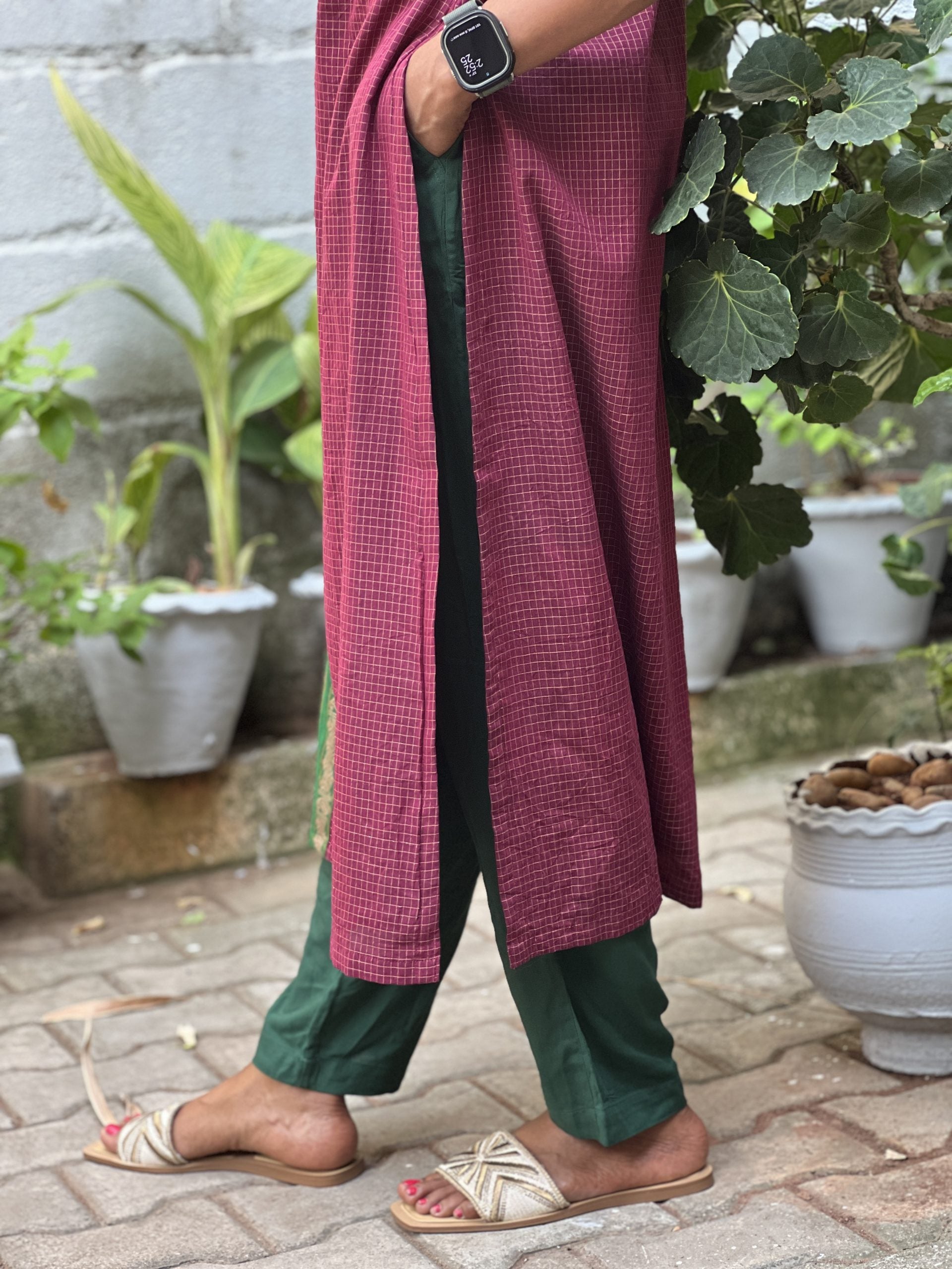 Green soft cotton straight pants with elastic at the back and band and drawstring at the front with side pockets.