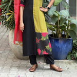 Black soft cotton straight pants with elastic at the back and band and drawstring at the front with side pockets.