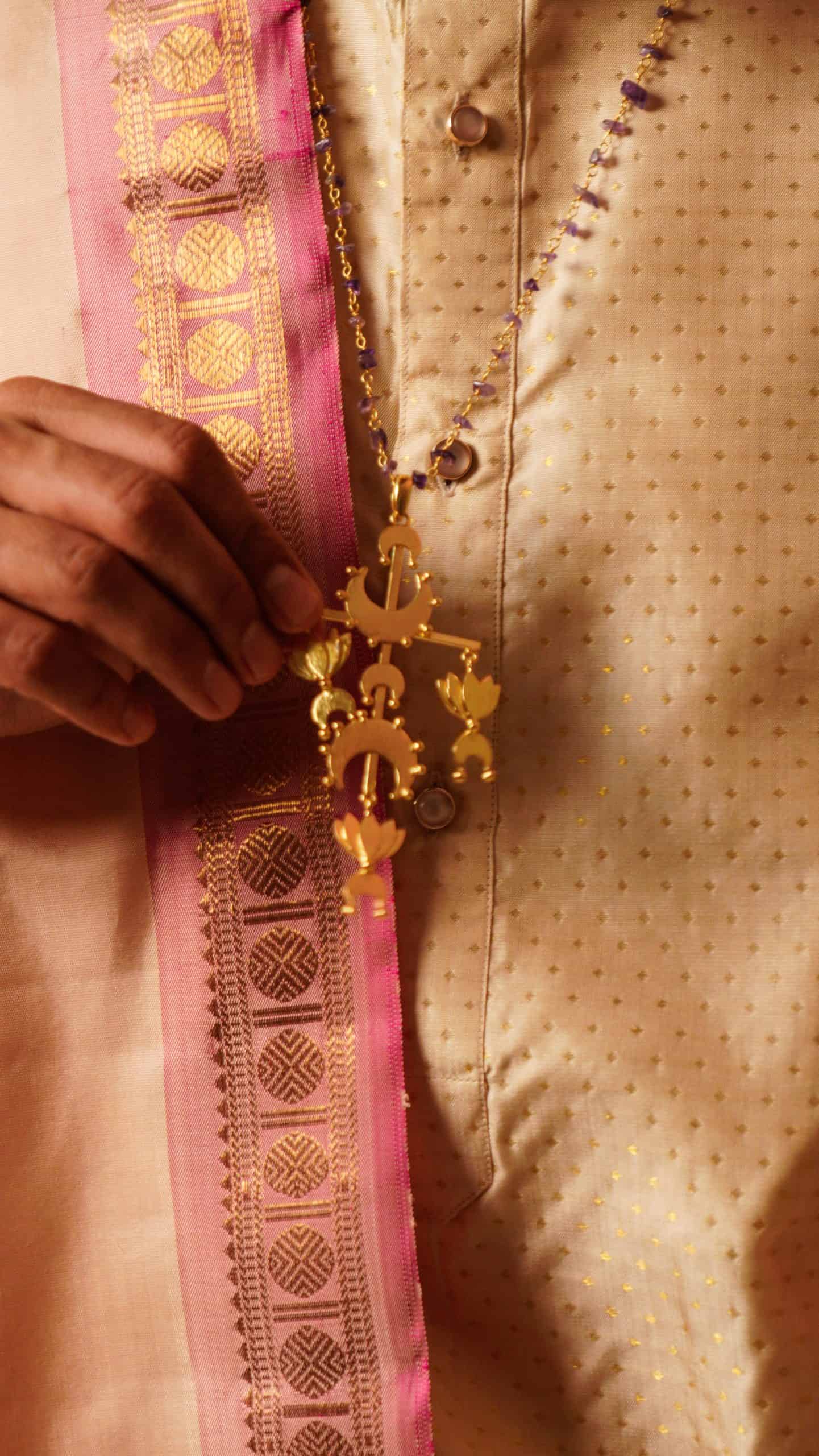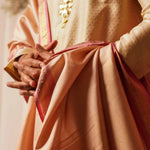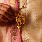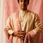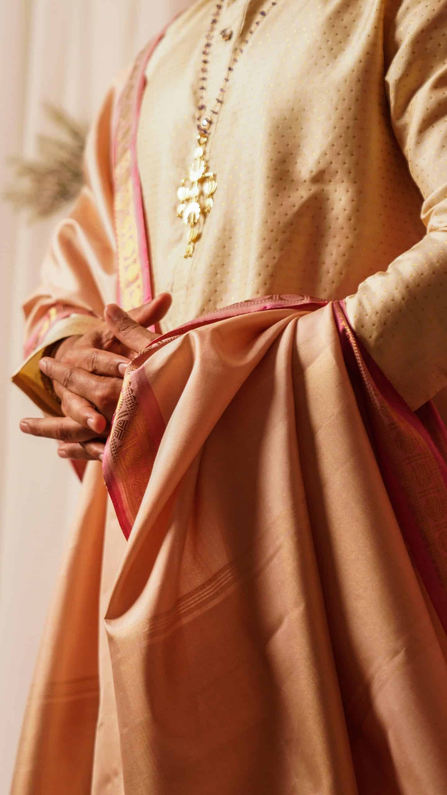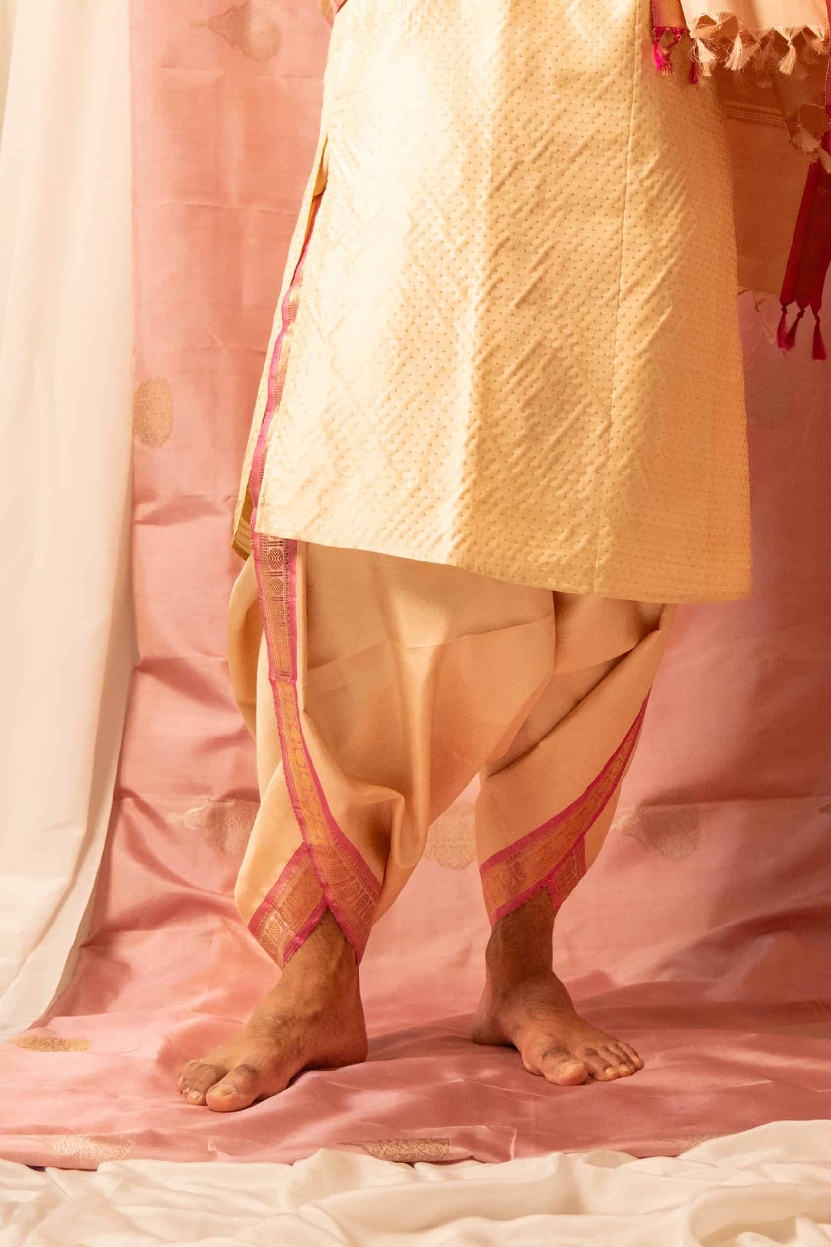 Breaking the mould for men's traditional wear, we bring to you this pure Kanchipuram silk veshti that marries the traditional motifs and weaves with a contemporary colour palette and style. The subtle pastel pink border with board rudraksham motifs woven in pure zari broadens the horizon for men's bridal and festive styling by leaps. Opt for a demure yet classy look by pairing it with our Sah-A beige pure Kanchipuram silk kurta, or embrace the colour and pair it with our Sah-A pure tissue tussar kurta in pink—perfect for those who wish to match with their bride!