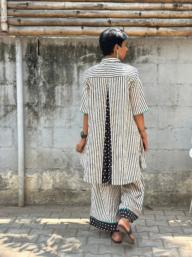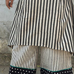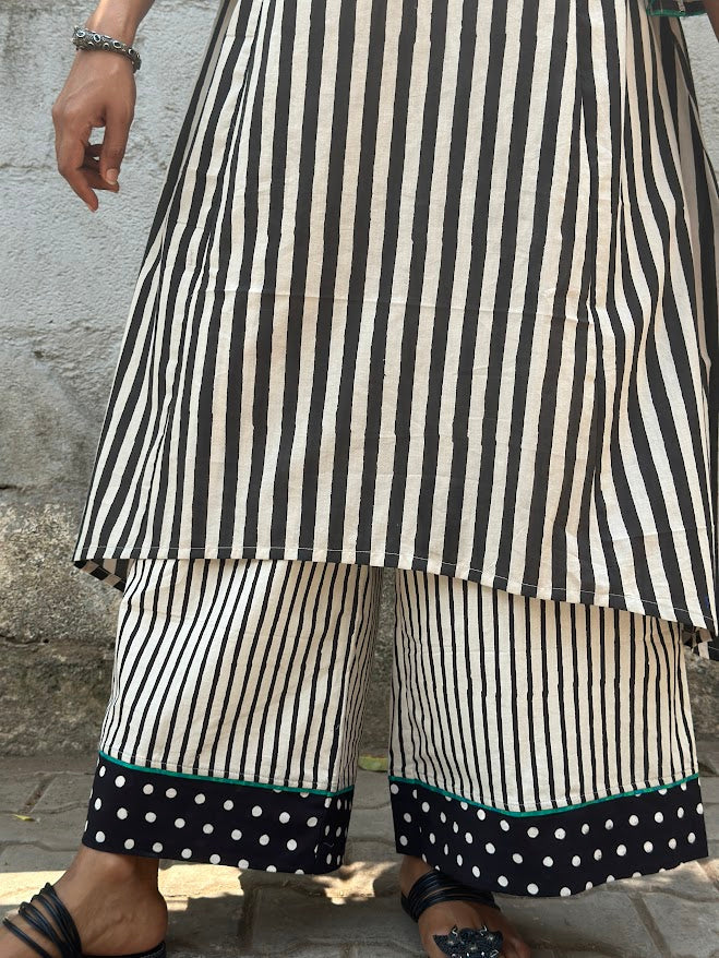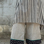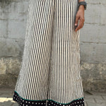 Black white striped cotton pants -As summer sizzles in the tropics, we've got your style and comfort covered. Introducing our chic and contemporary cotton bold black and white stripe pants with playful polka dotted fabric edging. Stay cool and stylish all season long with this must have and explore its versatility by pairing it with kurtas and shirts from your own collection or with our matching shirt tunic or kurta for some coord inspirations. To view more outfits in cottons, click onhttps://aavaranaa.com/cotton-ready-to-wear-outfits/ Print medium has been one of our favourite way to embelish sarees & yardages. Over the years we have dabbled in bagh, bagru, dabu, ajrak, sanganeri, discharge & screen prints. We have consciously worked with various hand-printed forms and we particularly love block prints. We work with both traditional motifs as well as contemporary prints. For instance, with our range of silk and Madras Margarita, we have experimented a fair bit with new age florals. We also like to revisit traditional bagru & dabu prints on our kotas and enhance them with our surface embelishments. Hand-prints are mixed with applique, embroidery & cutwork to further enhance the designs.Black white striped cotton pants is the cotton variant and most comfortable for summers