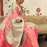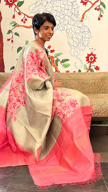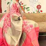 Grey and pink handwoven Kanchipuram silk dupatta with hand block print. The body features large floral in the middle and pallu has simple gold zari lines.