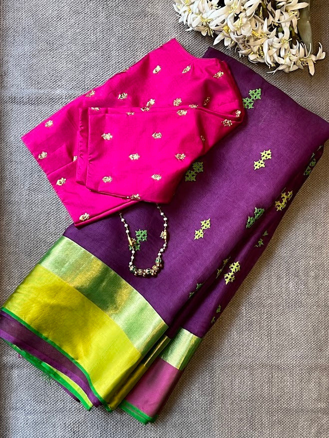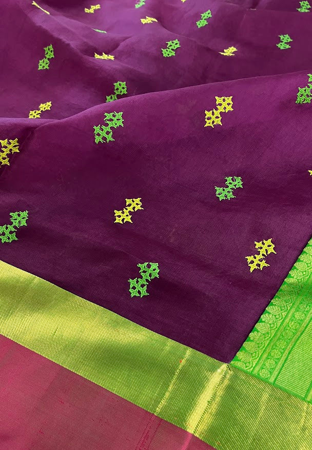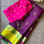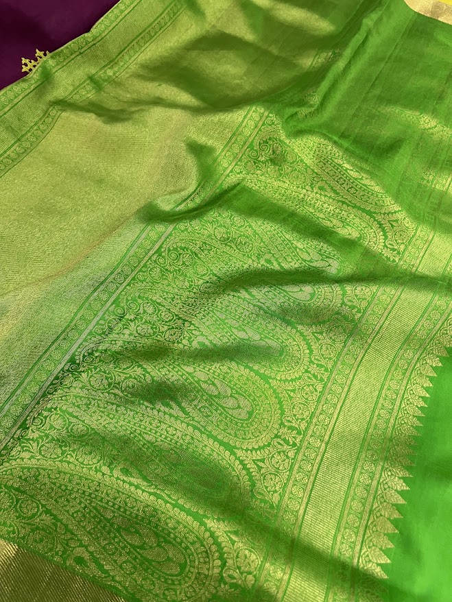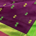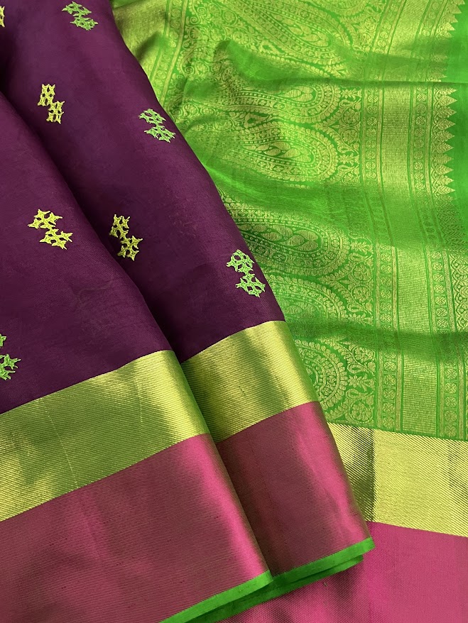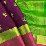 This enchanting Mishrita features a stunning body crafted from a gorgeous aubergine pure silk organza handembroidered with delightful ombre green kutch butties. The border, in vivid green and purple pure kanchipuram silk, showcases exquisite twill-woven pure zari work, complementing the aubergine shade perfectly. The pallu, also in the same captivating green, has intricately woven pure zari motifs. Like all Mishritas, this piece offers a versatile and distinctive option for festive occasions, diverging from the conventional Kanchipuram choices.
