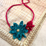 Blue and red crafted flowers Gajra neatly tucked on to the silk Dori with tassels. Note: It Can be used as hair accessory, a bracelet or even as a neck choker