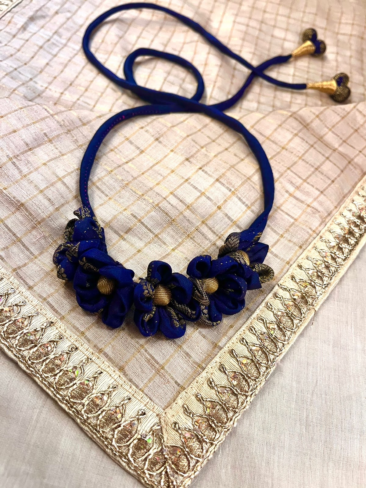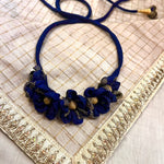 Royal Blue crafted flowers Gajra neatly tucked on to the silk Dori with tassels. Note: It Can be used as hair accessory, a bracelet or even as a neck choker