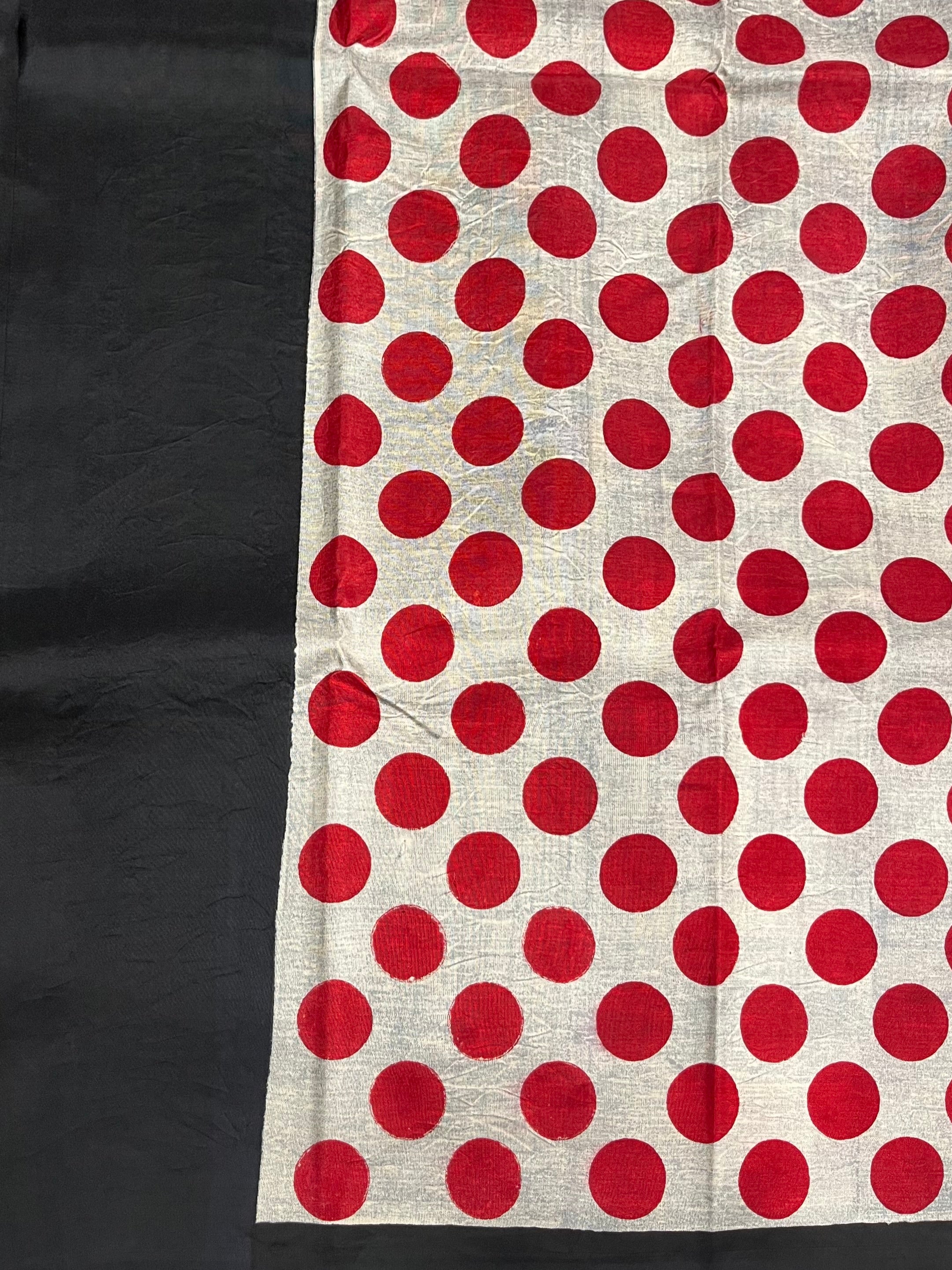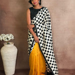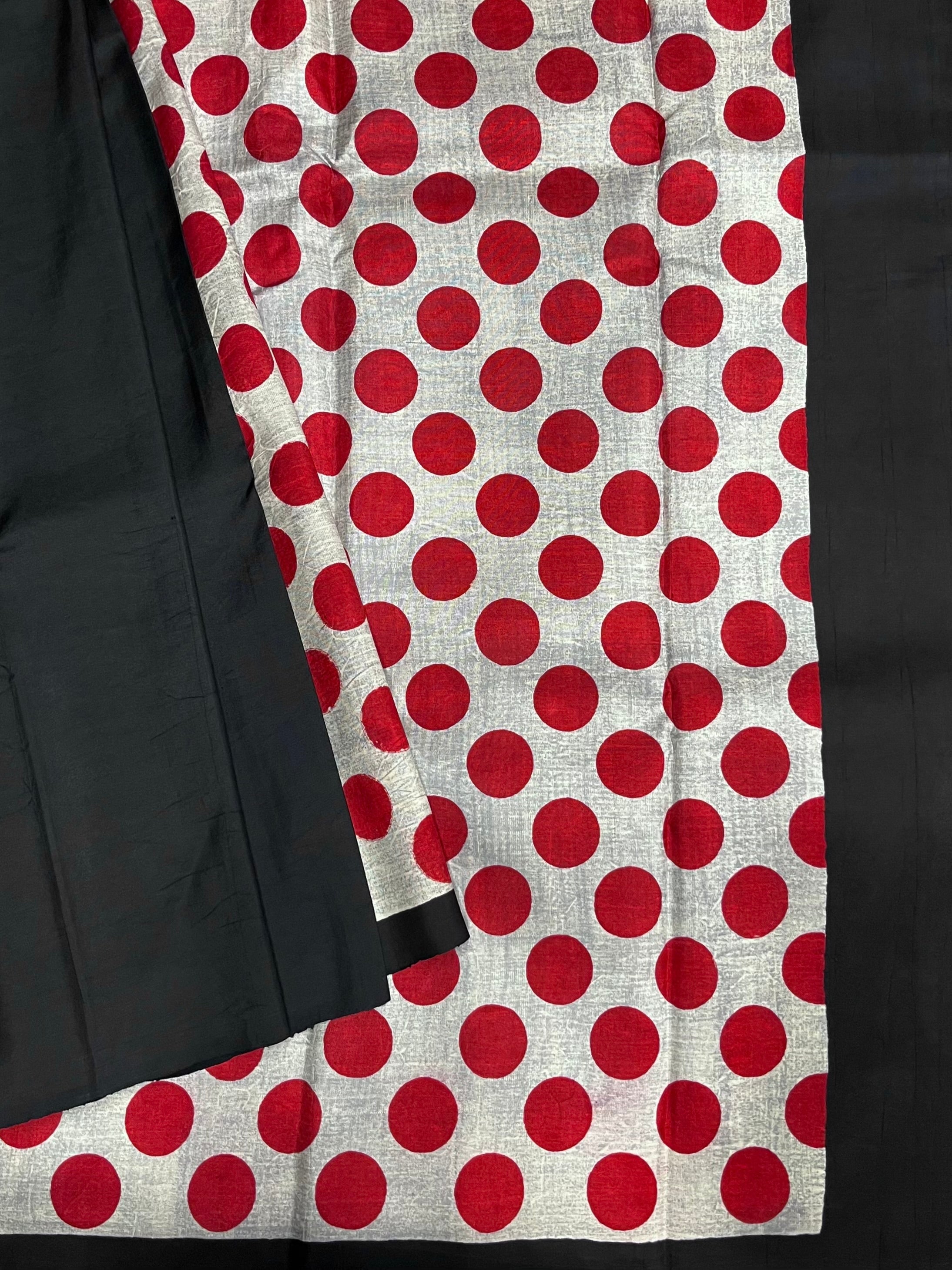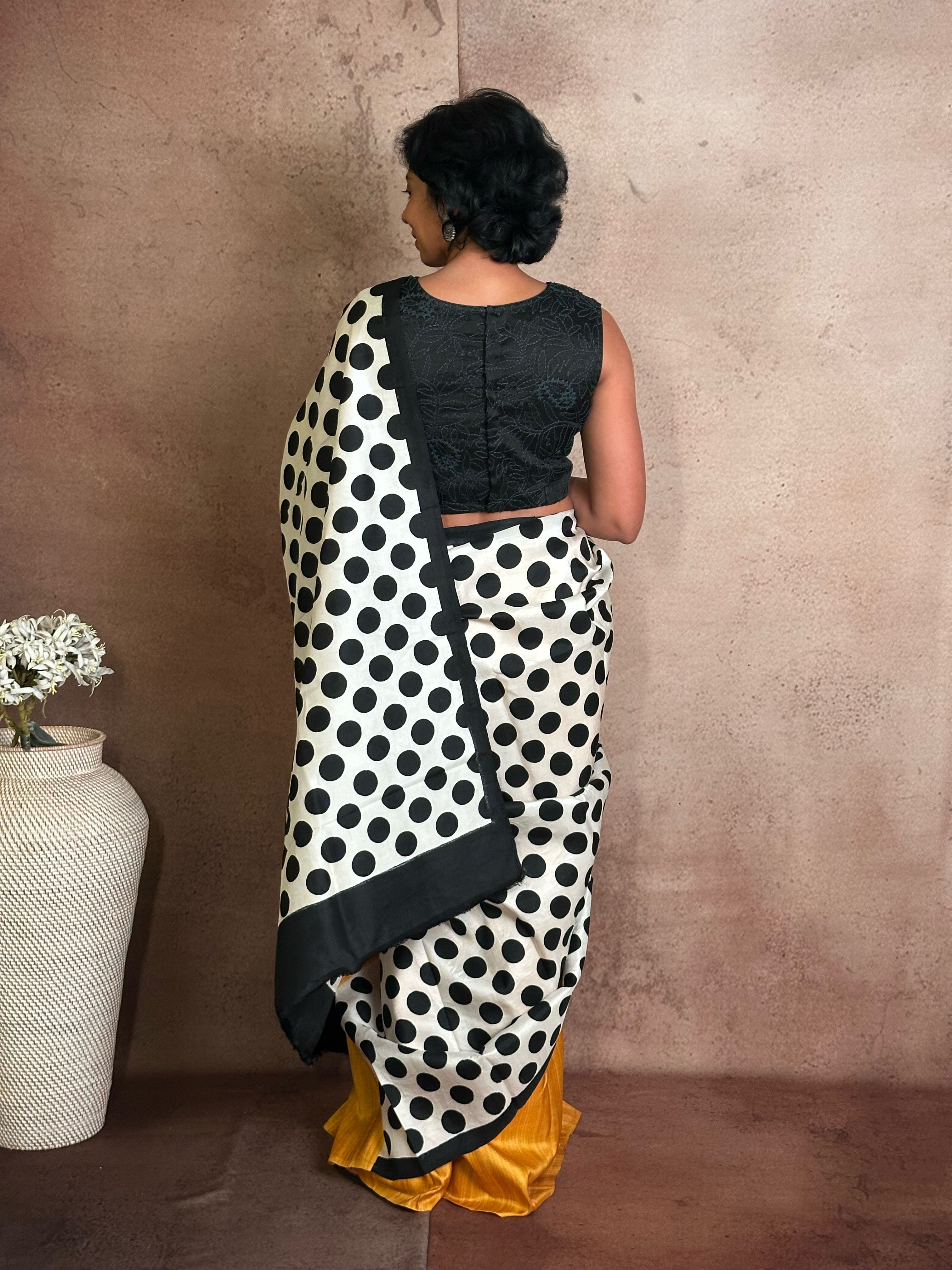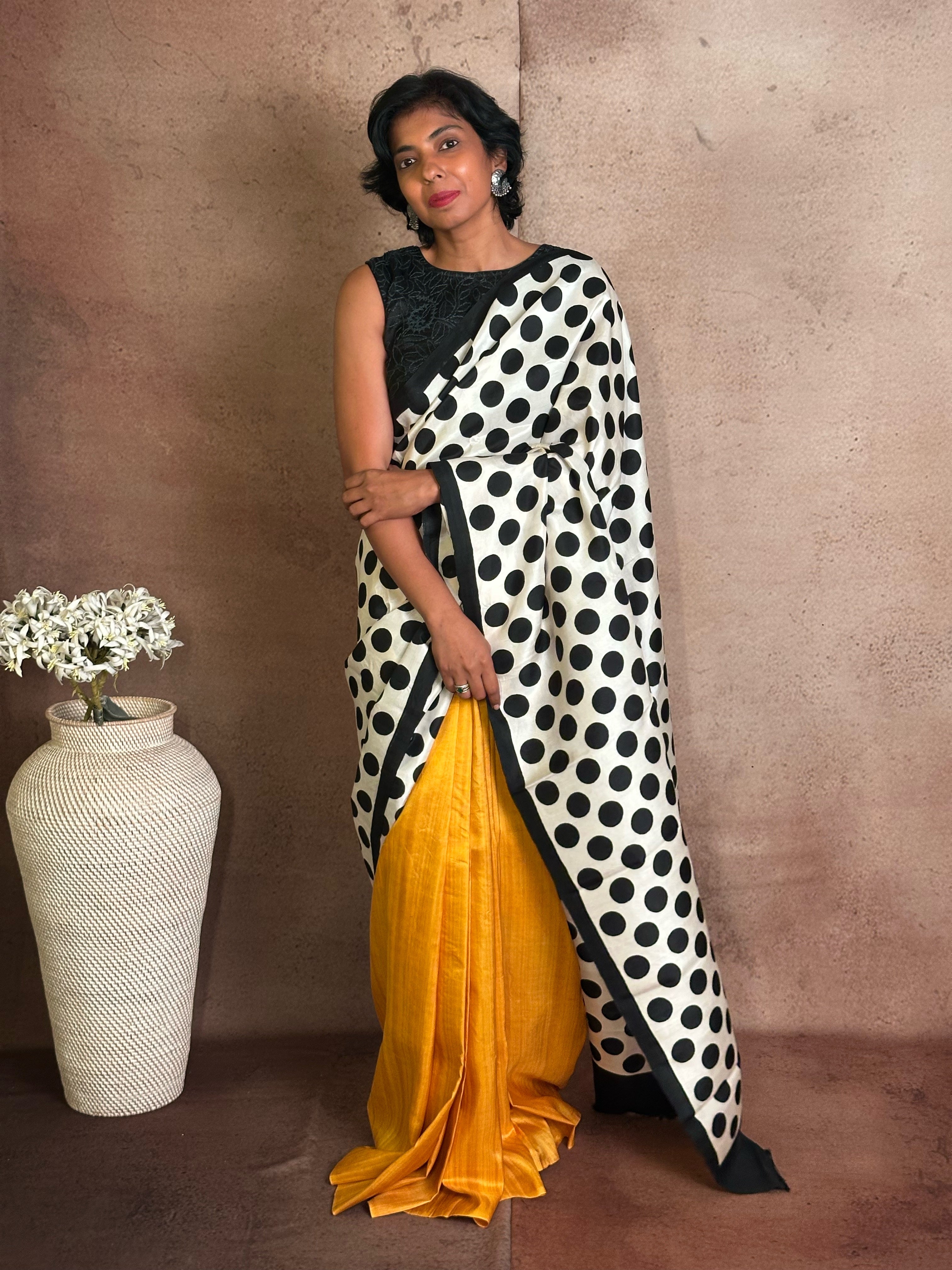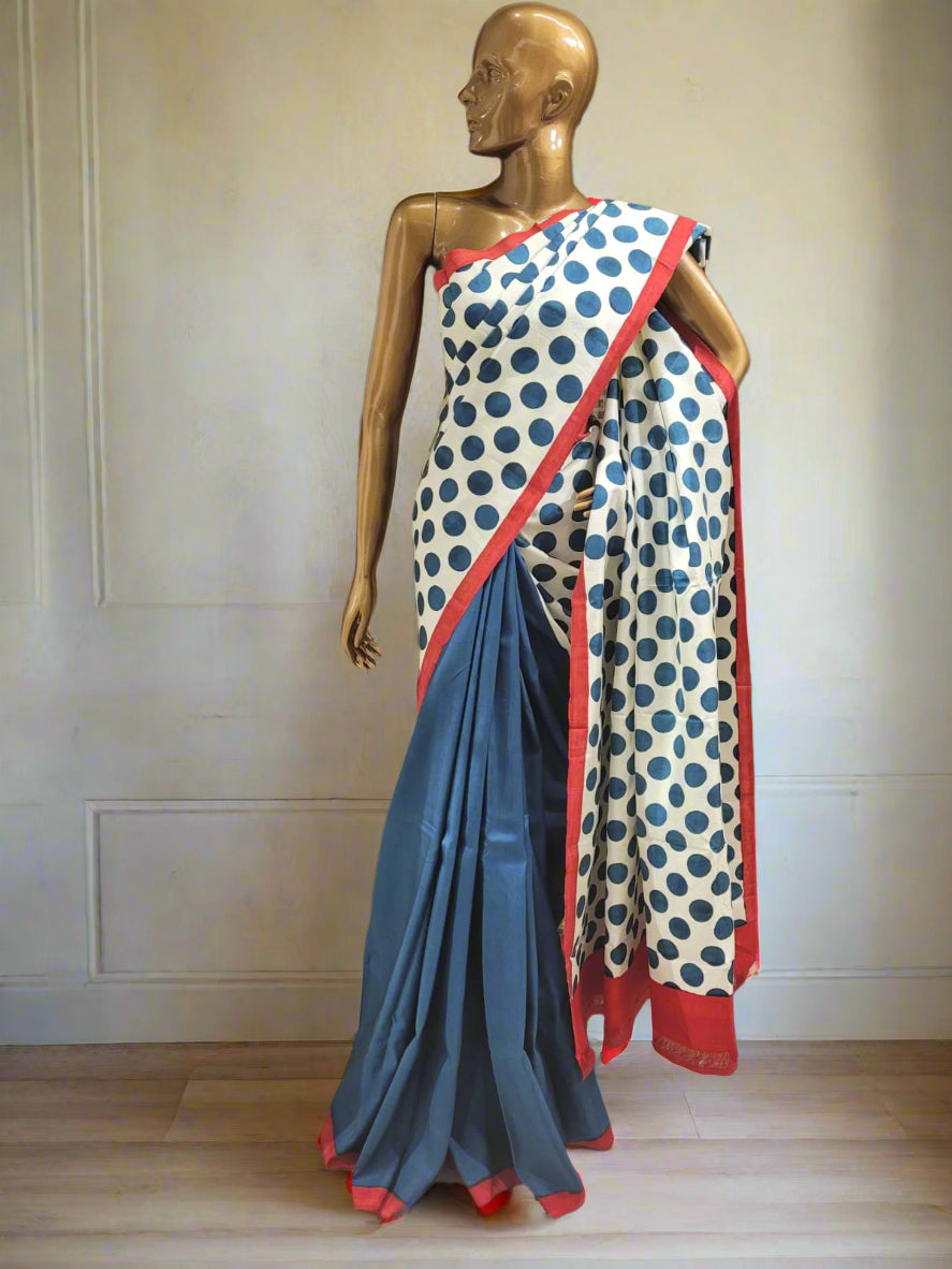 - Half the saree is plain solid colour ,while the other half is polka dots