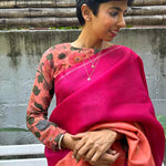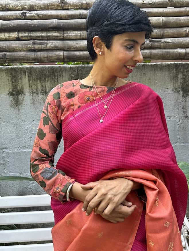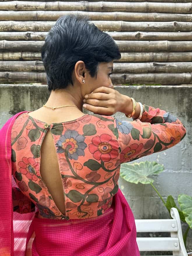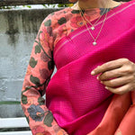 We challenge ourselves with being unique and versatile with our blouses and the outcome of that pursuit has never disappointed. What is so special about this Lasya blouse is its one of a kind peach soda colour that then became the perfect canvas for our artisans' exquisite kalamkari work. This padded blouse is made of pure chiffon fabric and has a full sleeve with a peekaboo back slit.