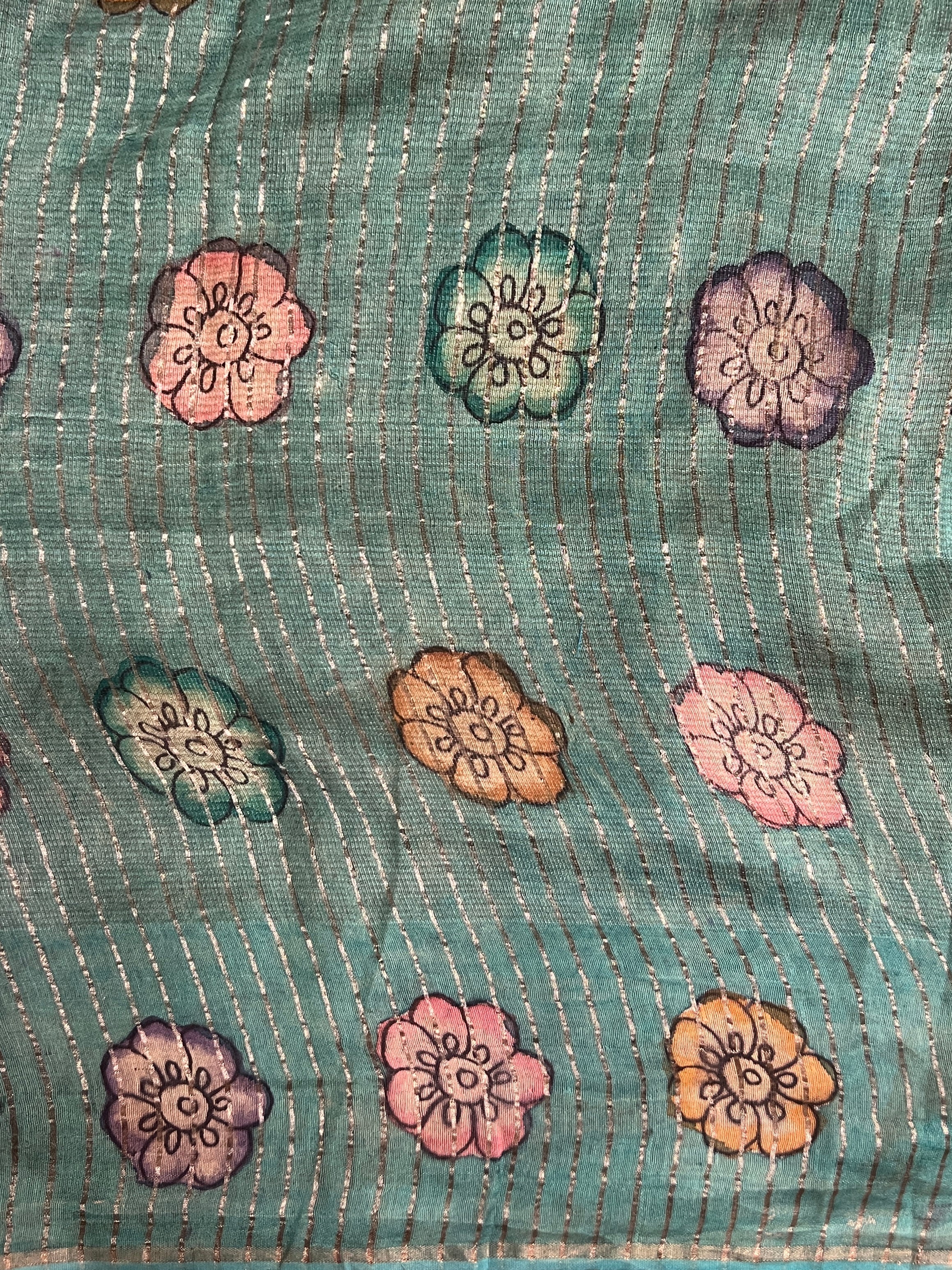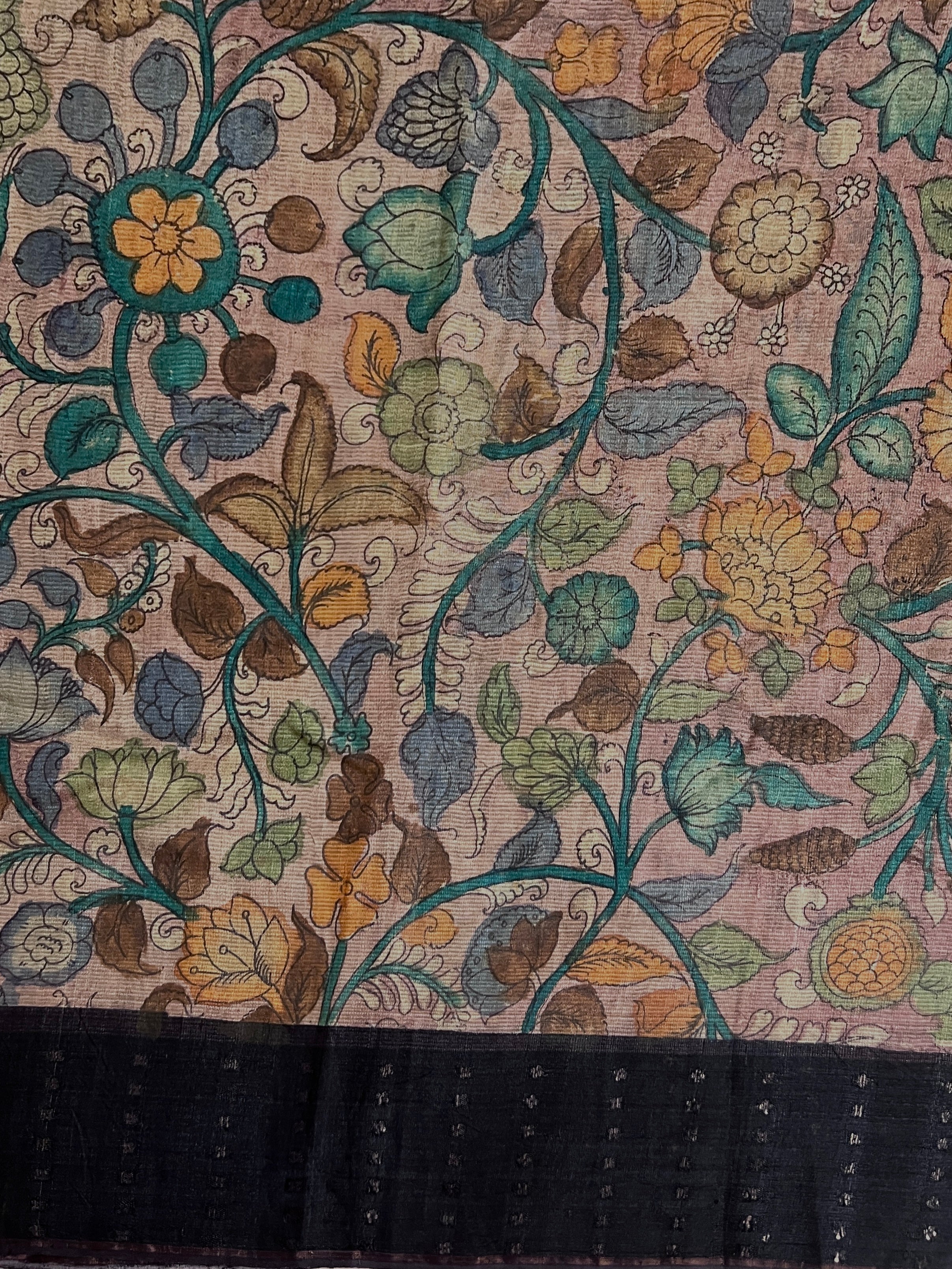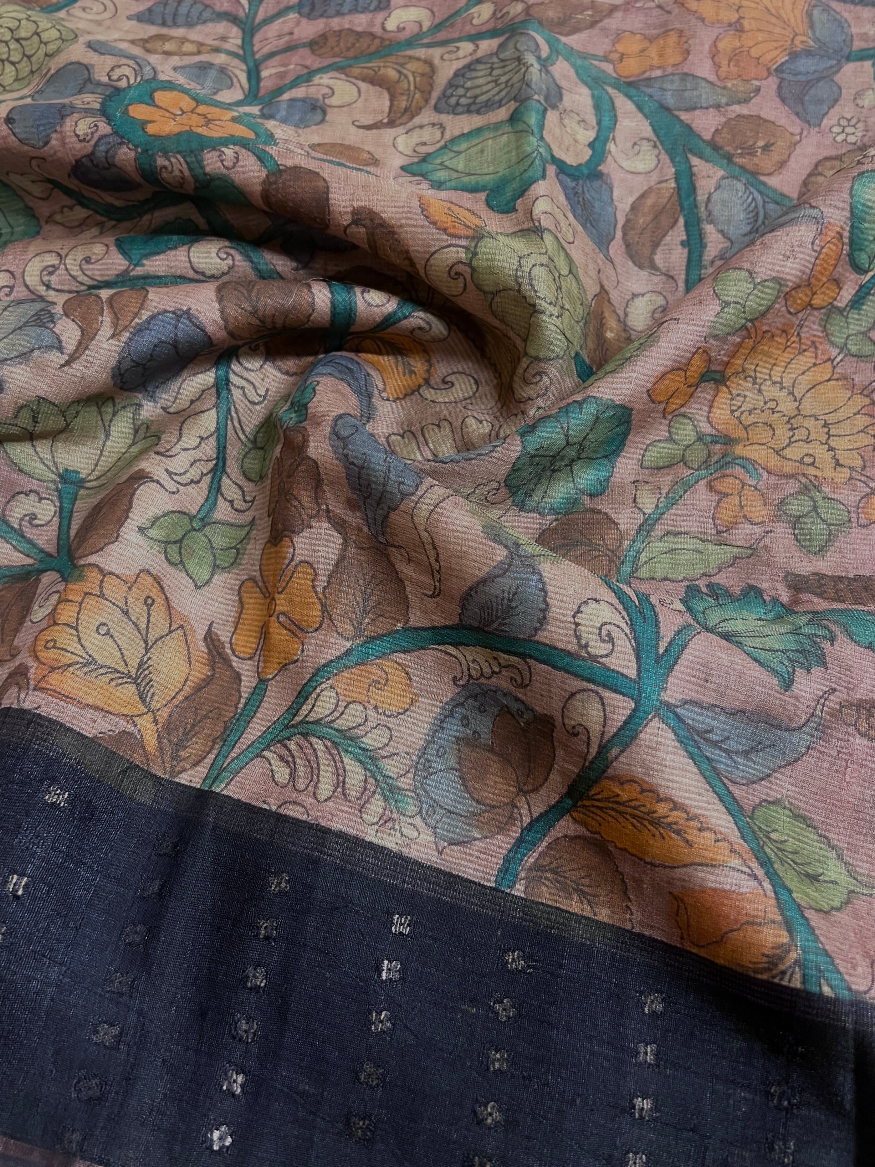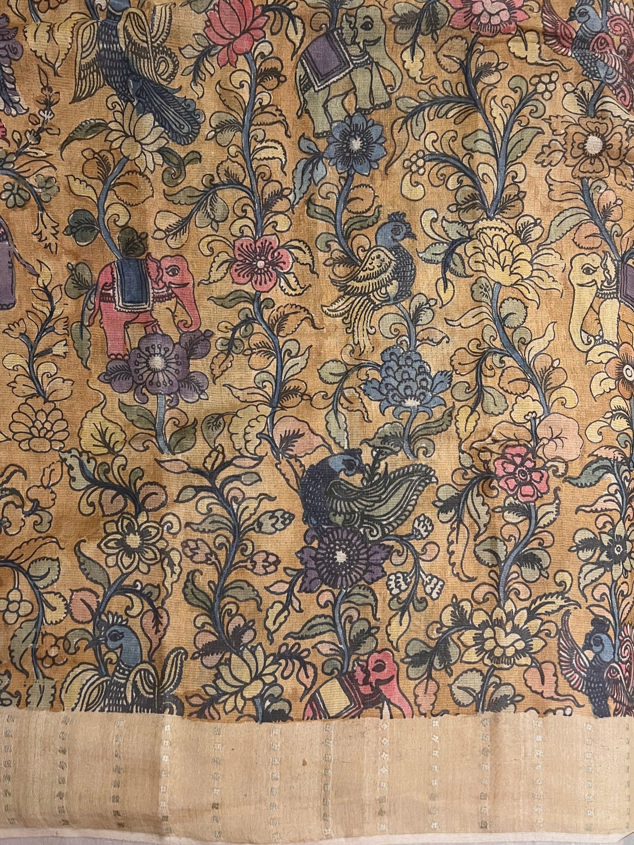 Saree is a beautifully handwoven Tussar with sequins woven along the border. The pallu is thread woven too. The saree is hand painted using natural dyes , in kalahasti, by skilled Kalamkari artisans. Sarees have an attached blouse piece and can be worn for small gatherings, office meetings , etc