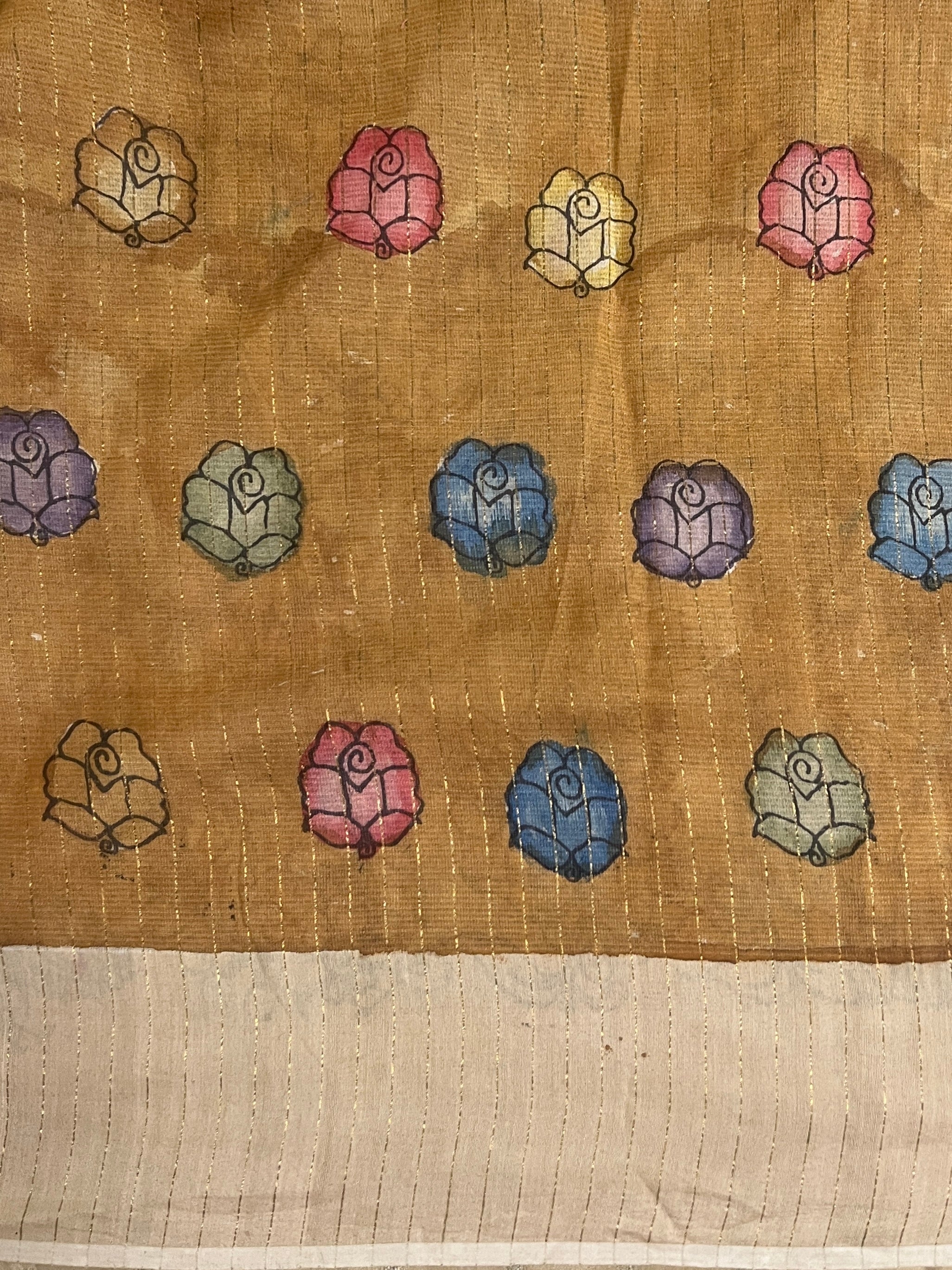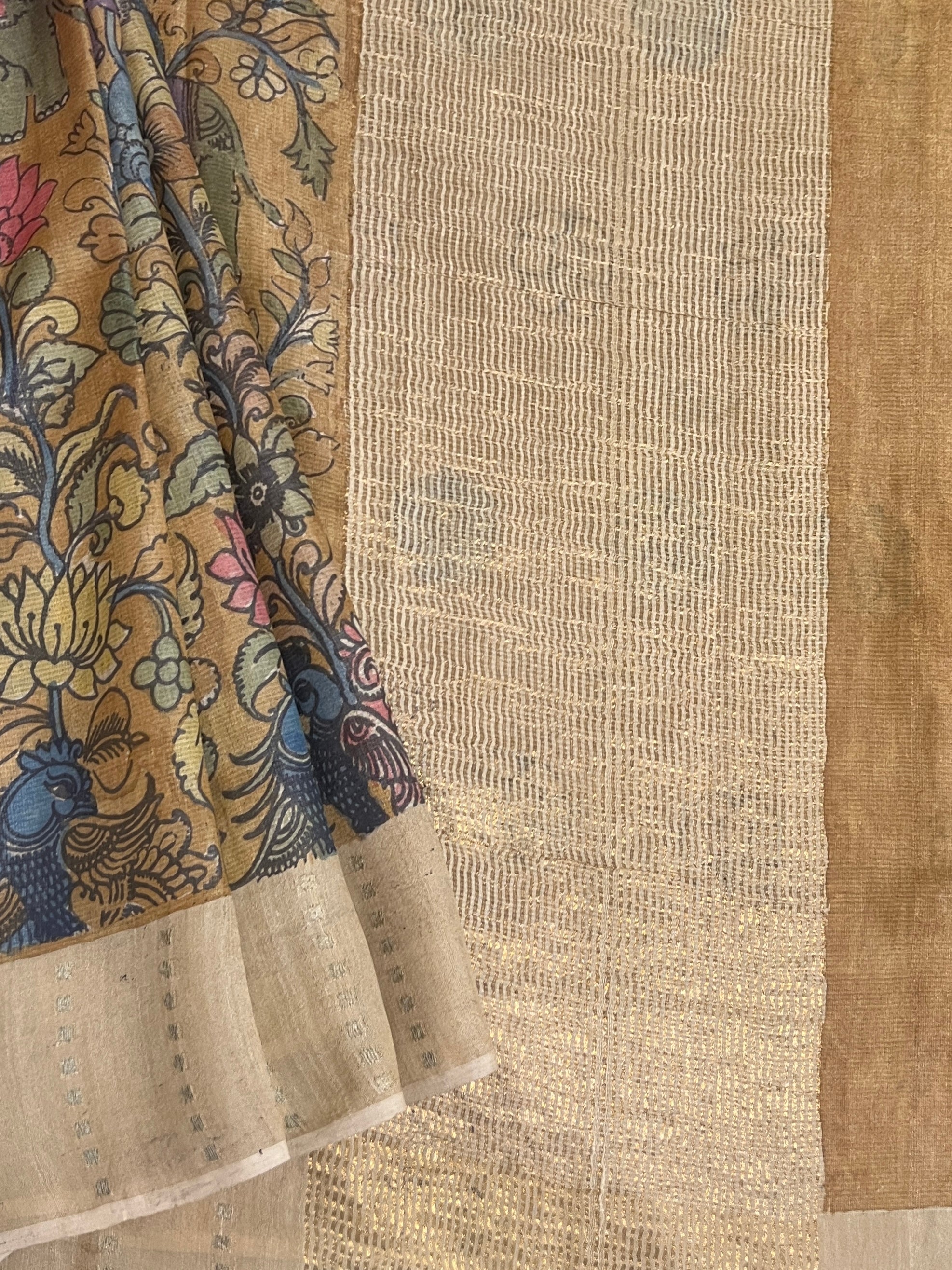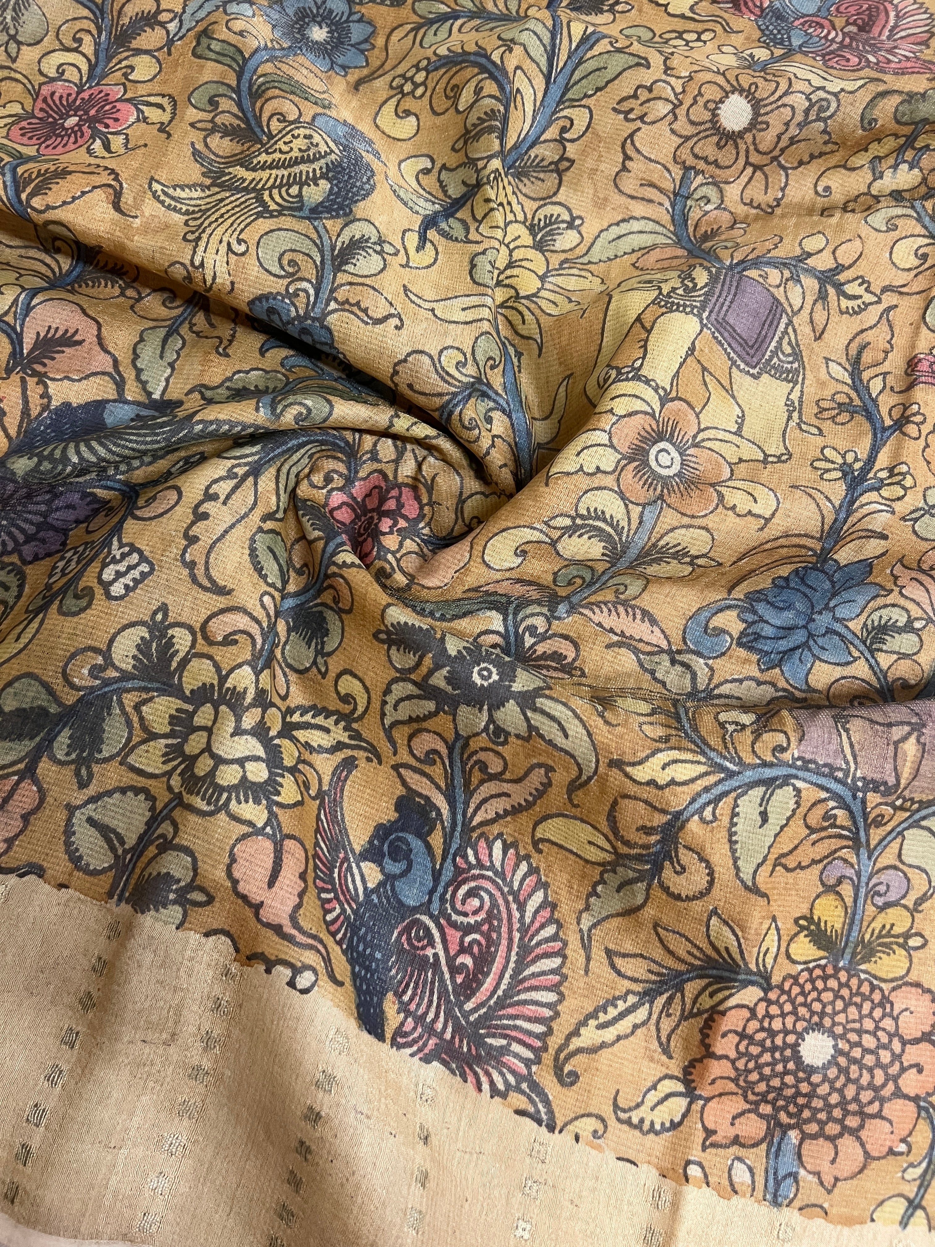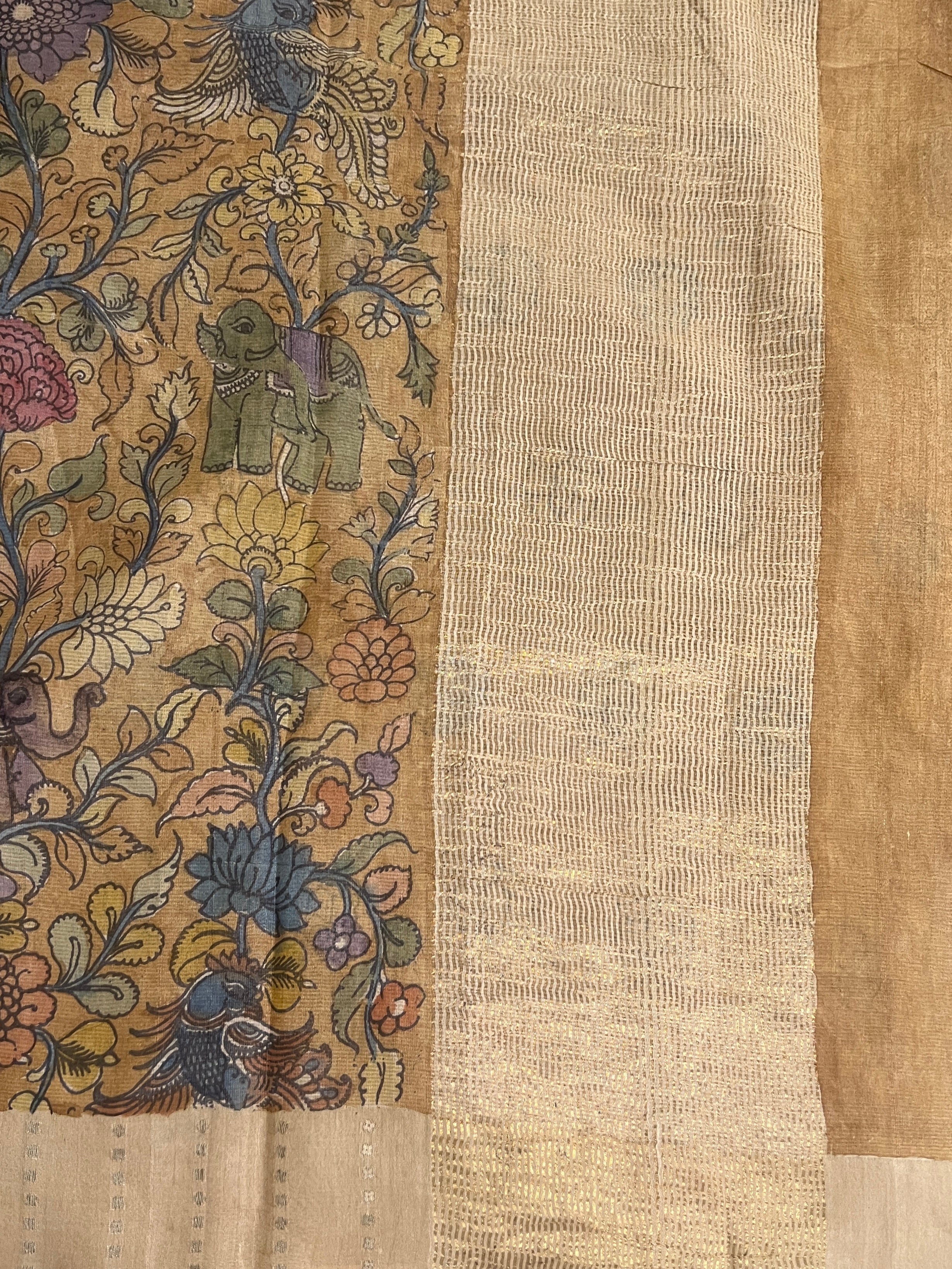 Saree is a beautifully handwoven Tussar with sequins woven along the border. The pallu is thread woven too. The saree is hand painted using natural dyes , in kalahasti, by skilled Kalamkari artisans. Sarees have an attached blouse piece and can be worn for small gatherings, office meetings , etc