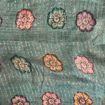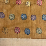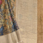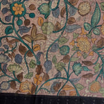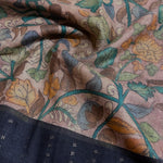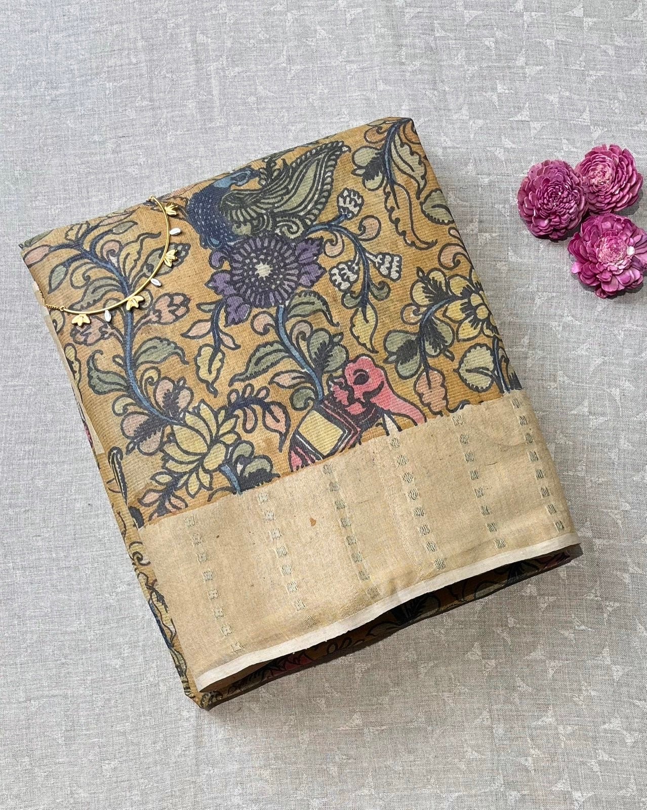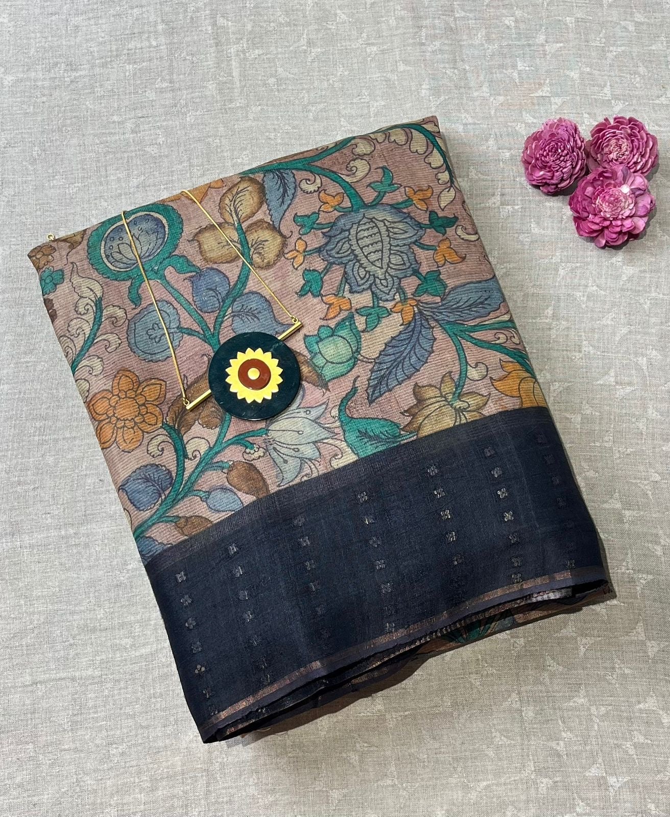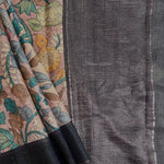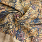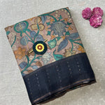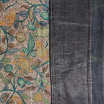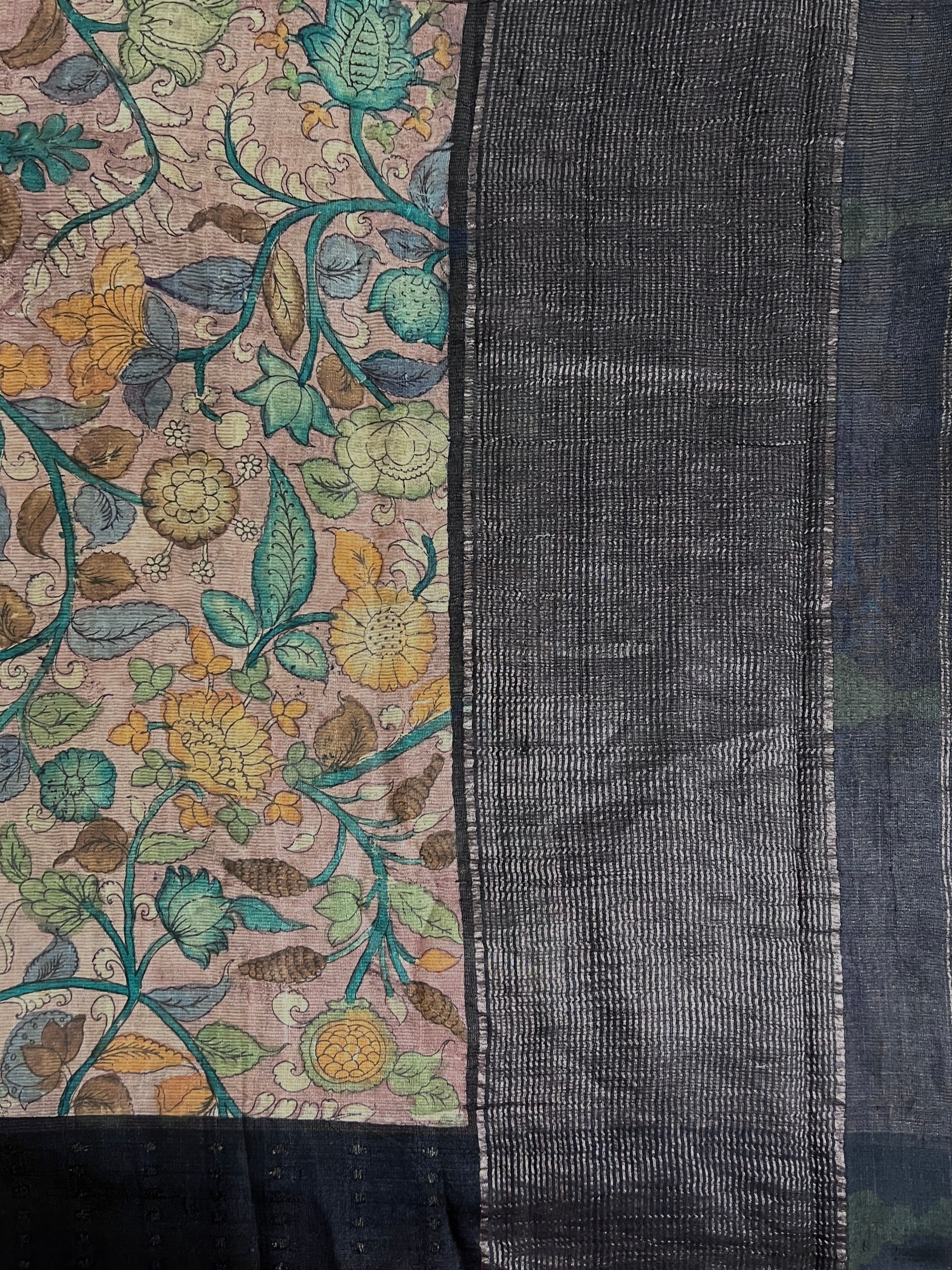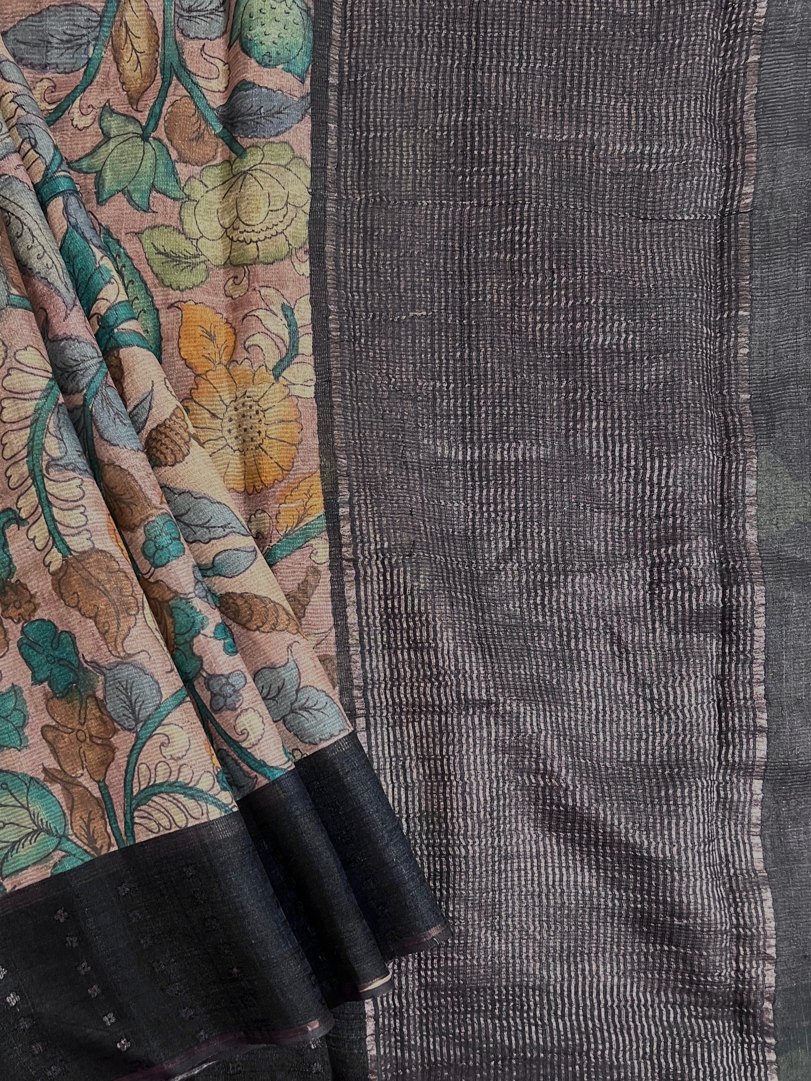 Saree is a beautifully handwoven Tussar with sequins woven along the border. The pallu is thread woven too. The saree is hand painted using natural dyes , in kalahasti, by skilled Kalamkari artisans. Sarees have an attached blouse piece and can be worn for small gatherings, office meetings , etc