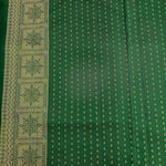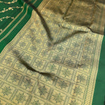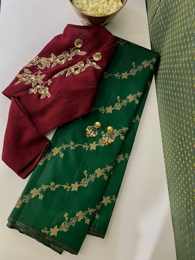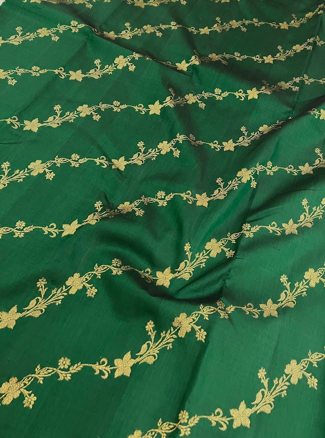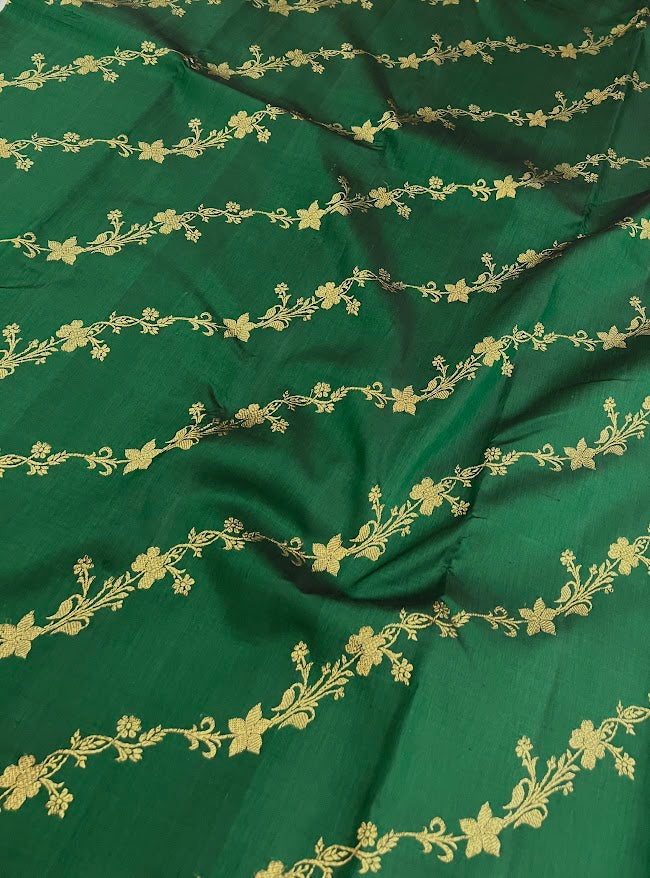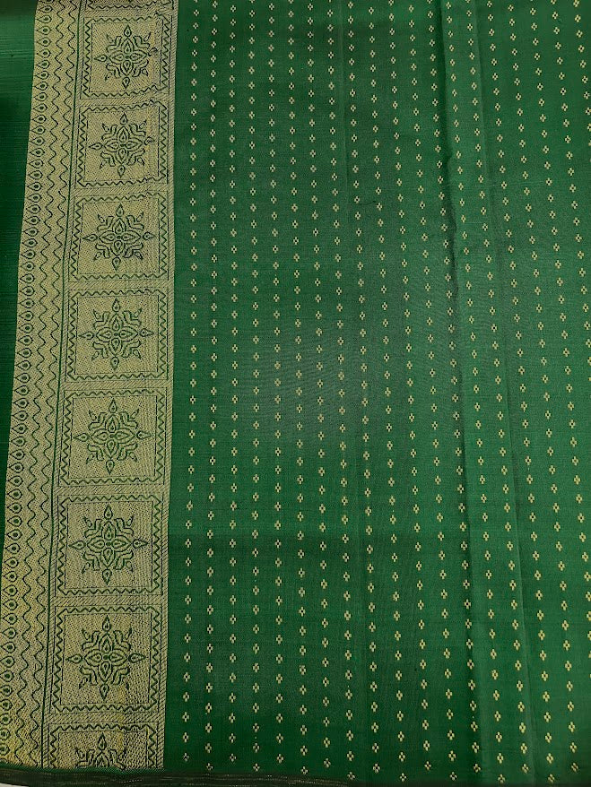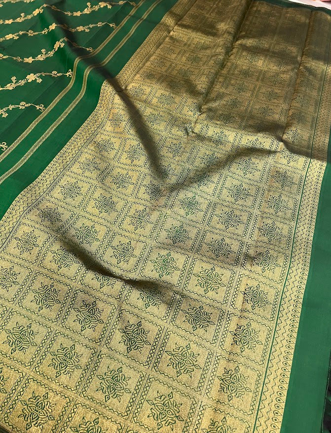 Bottle green kanchipuram silk saree with zari creeper ( thodar butta )designs all over the saree with a rich palluBlouse: Bottle green with zari buttis and a zari border