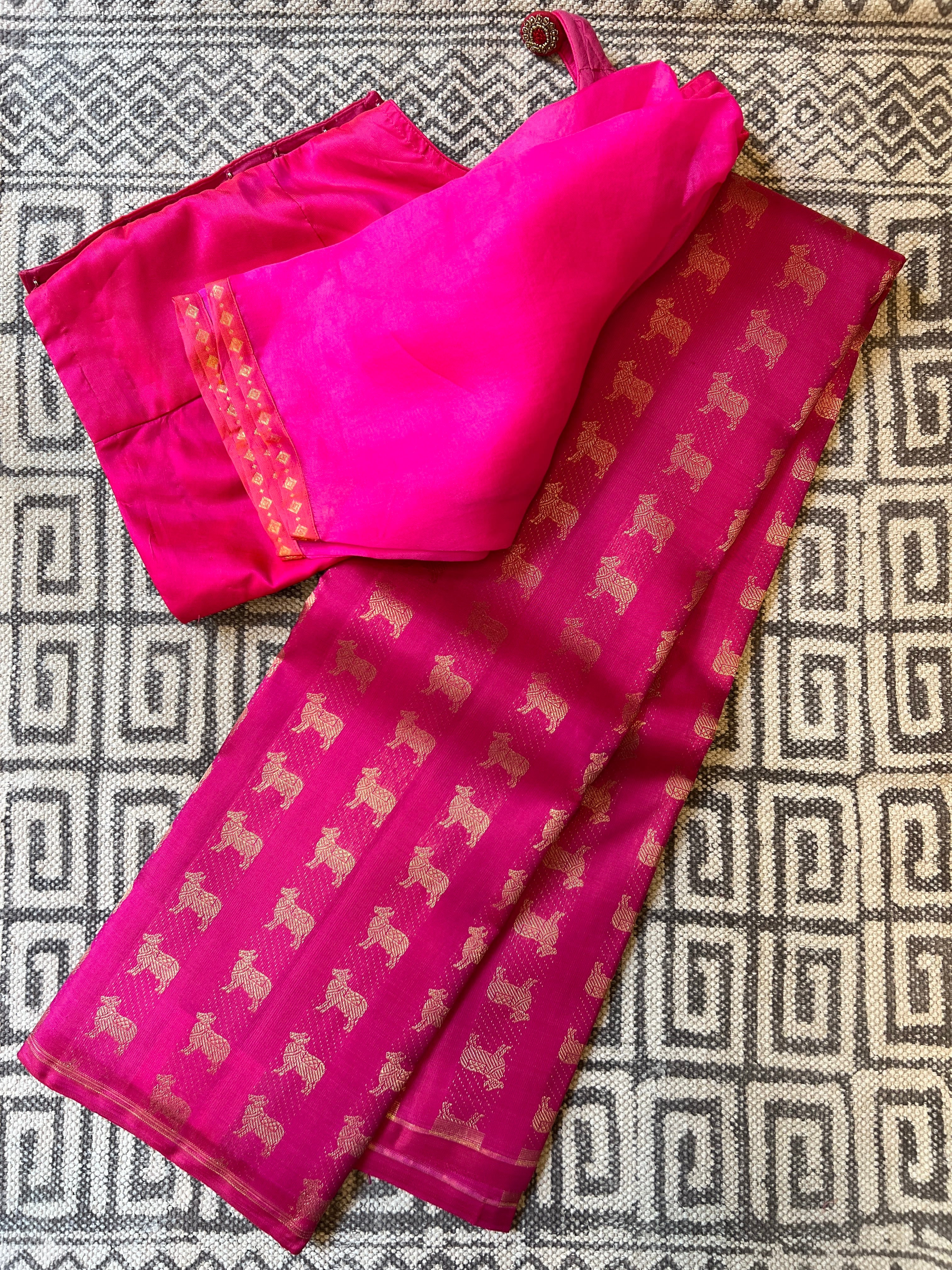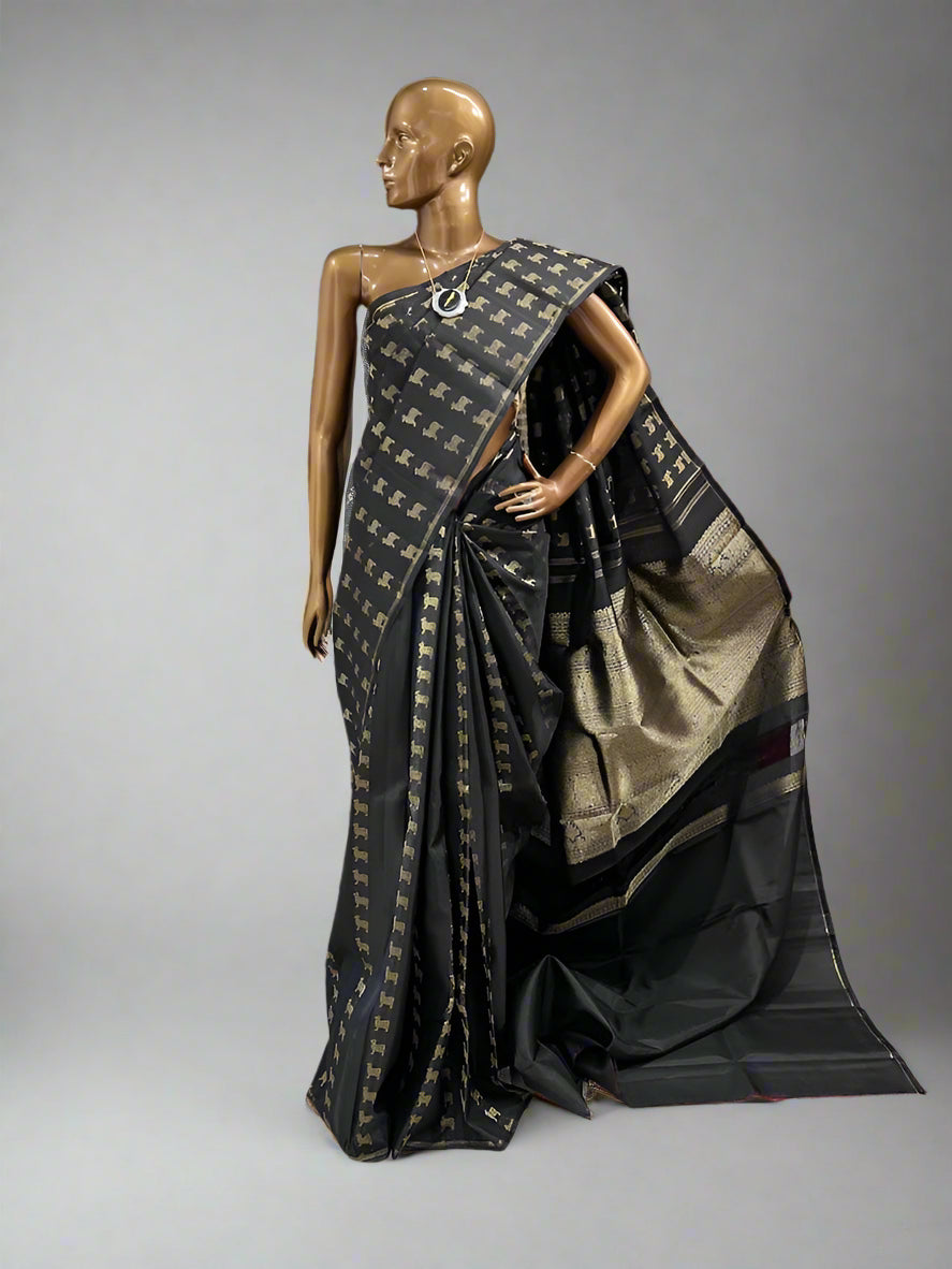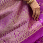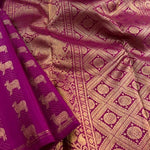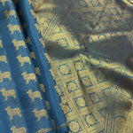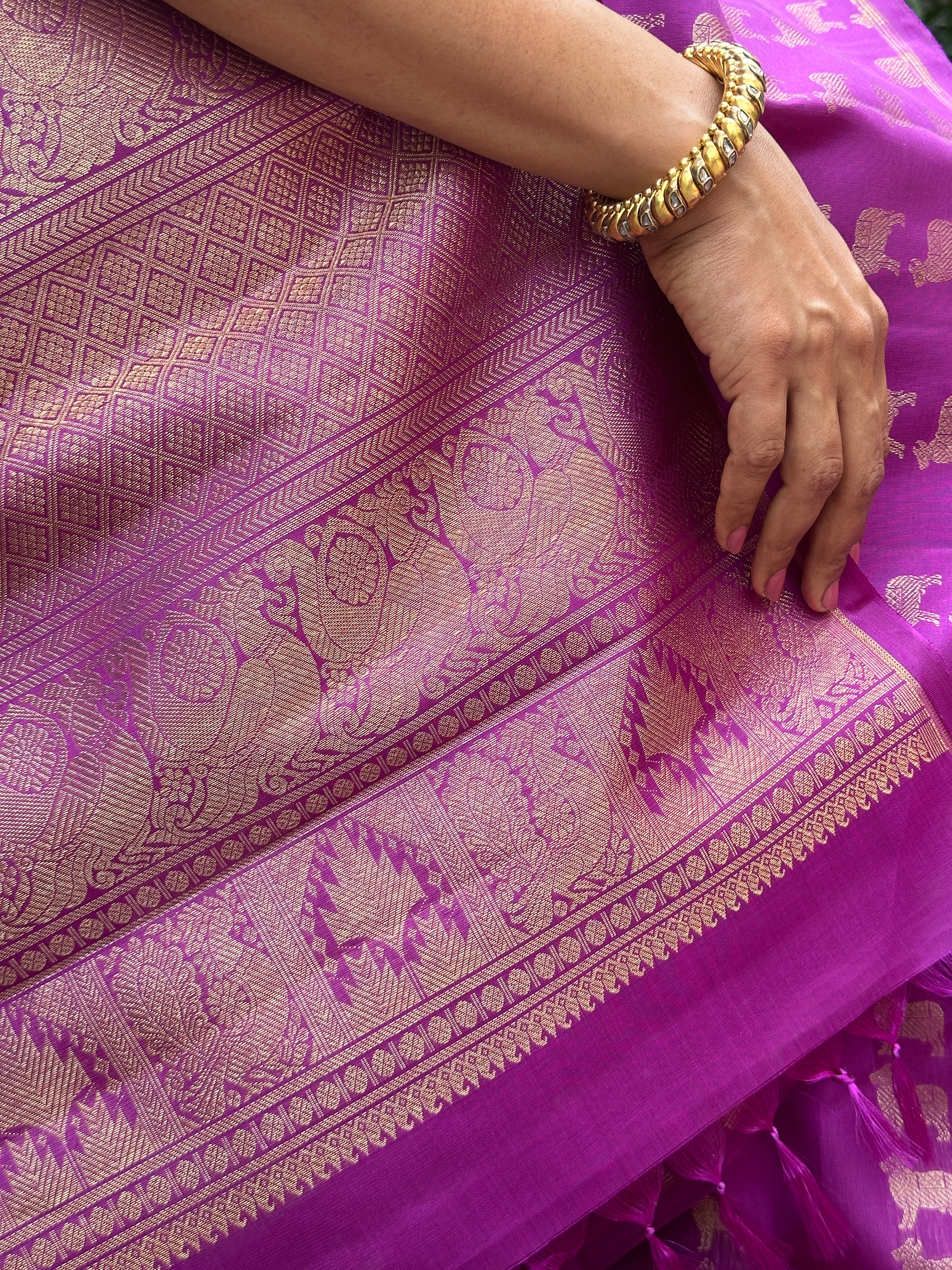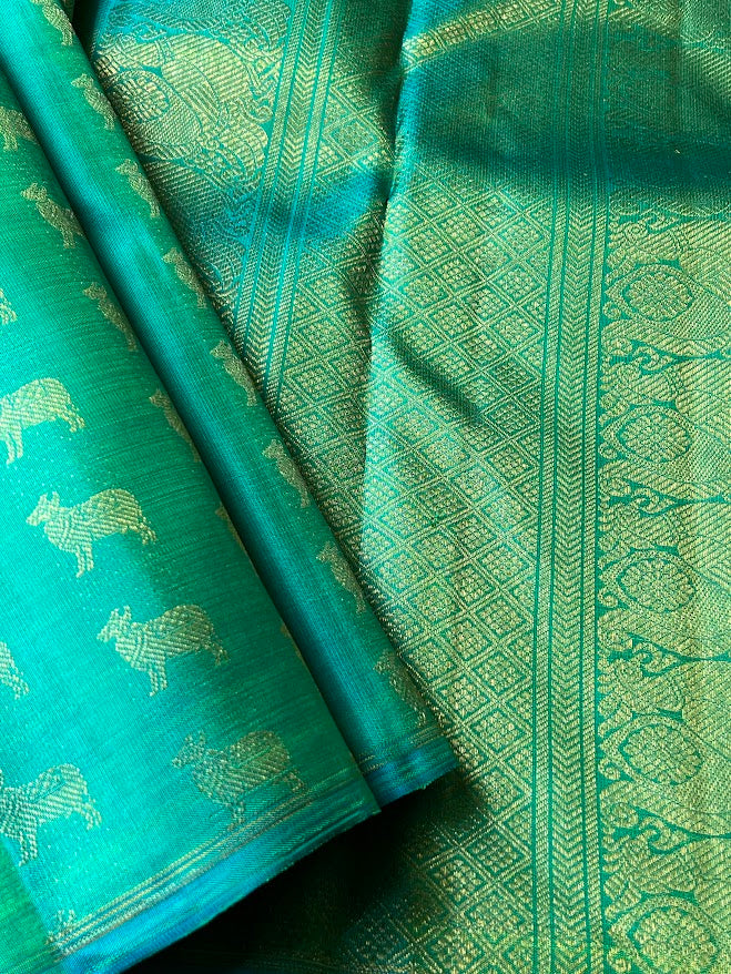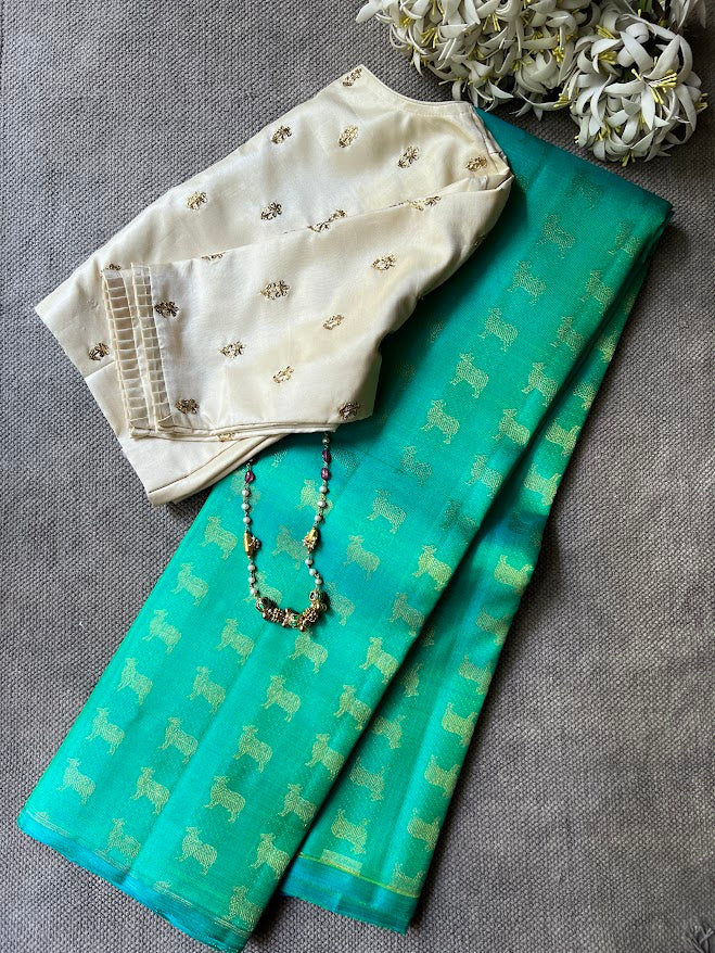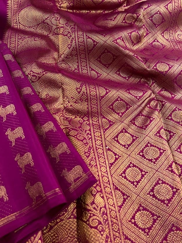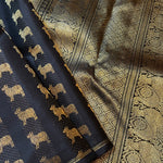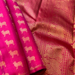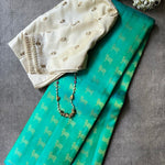 - The pallu has mythical creatures and rudrakshams woven in pure zari