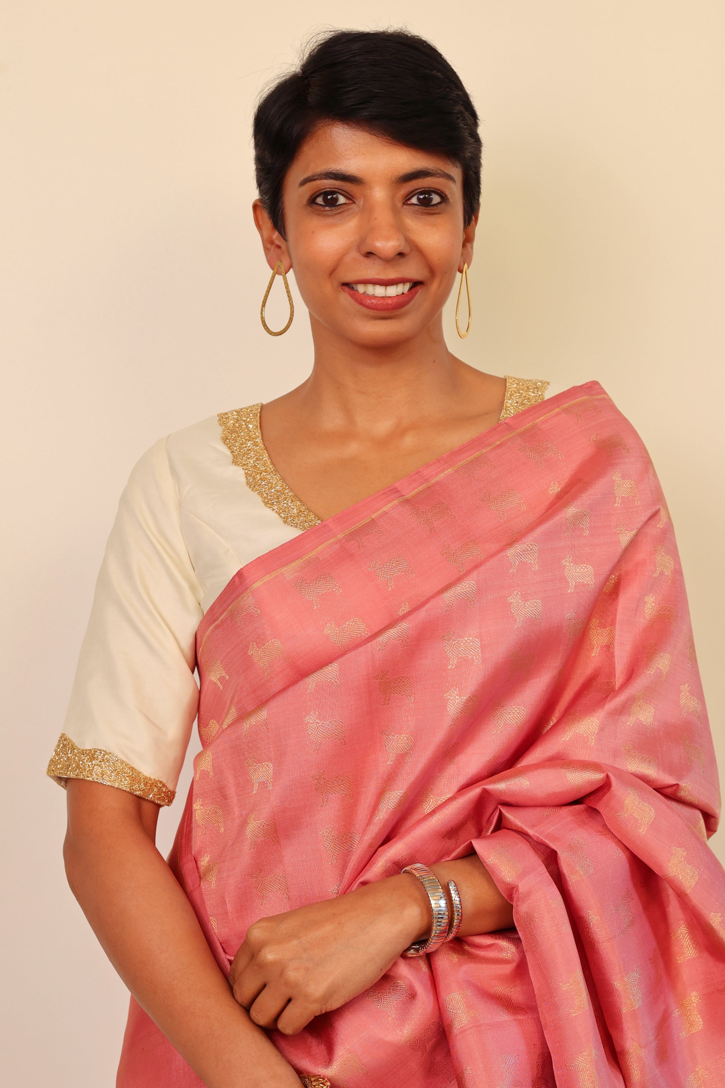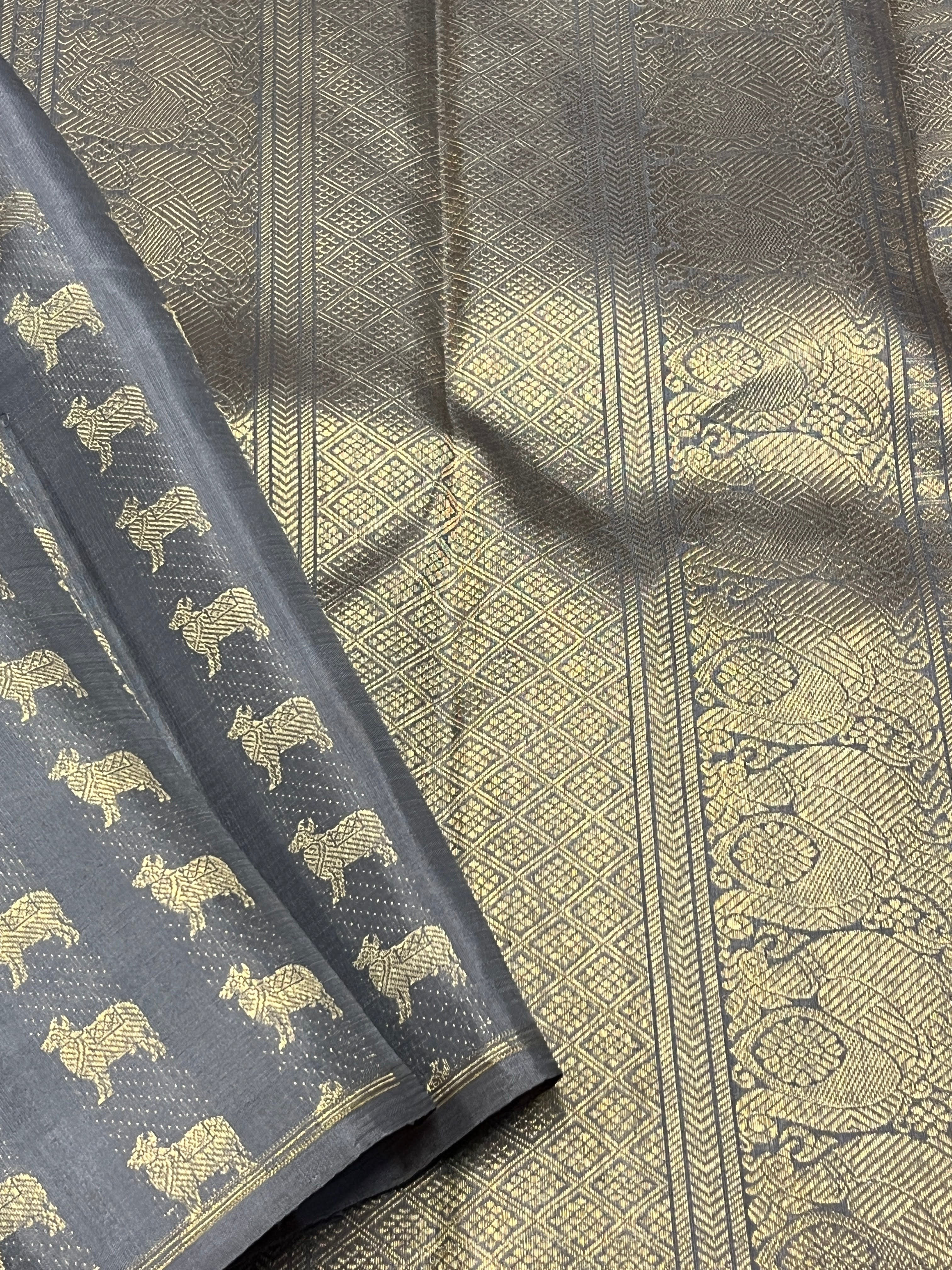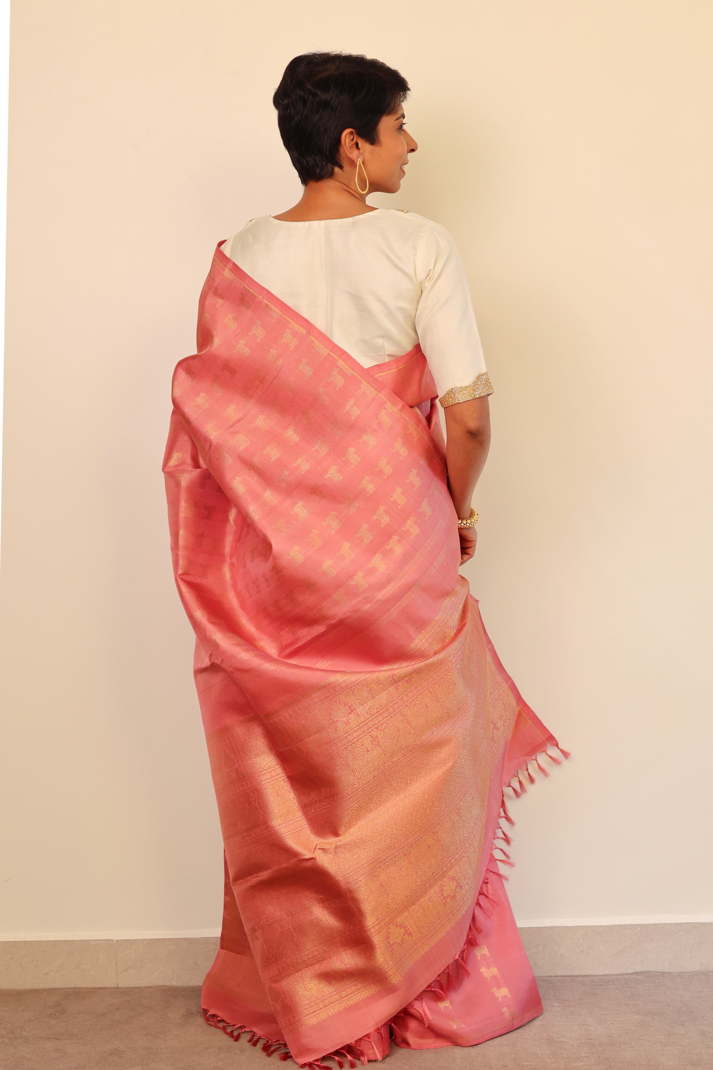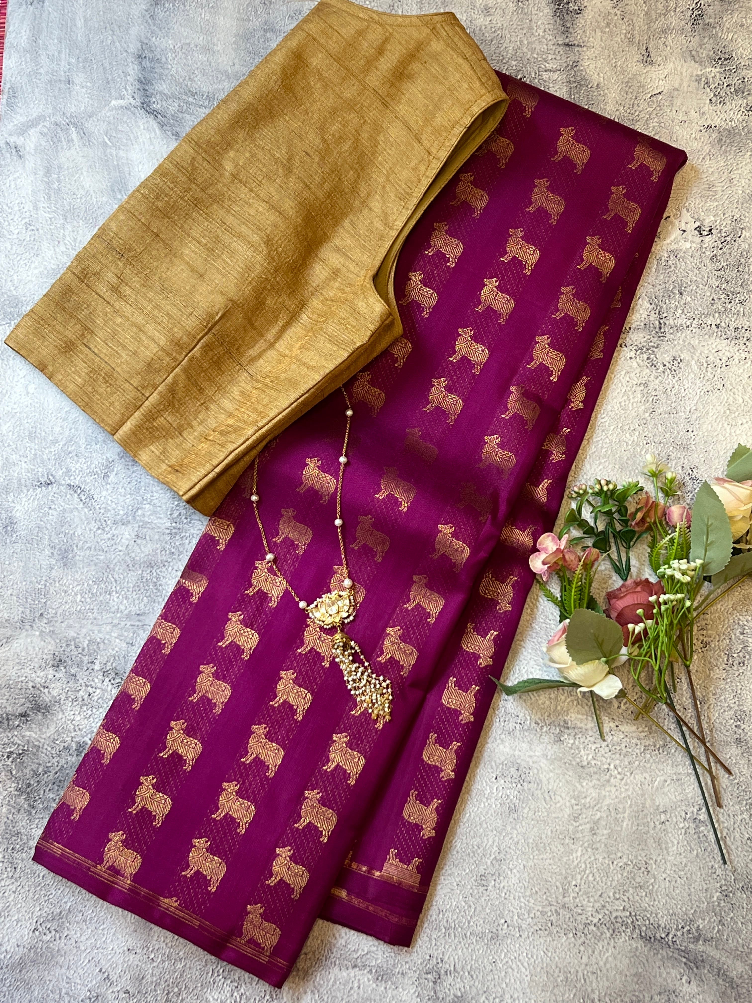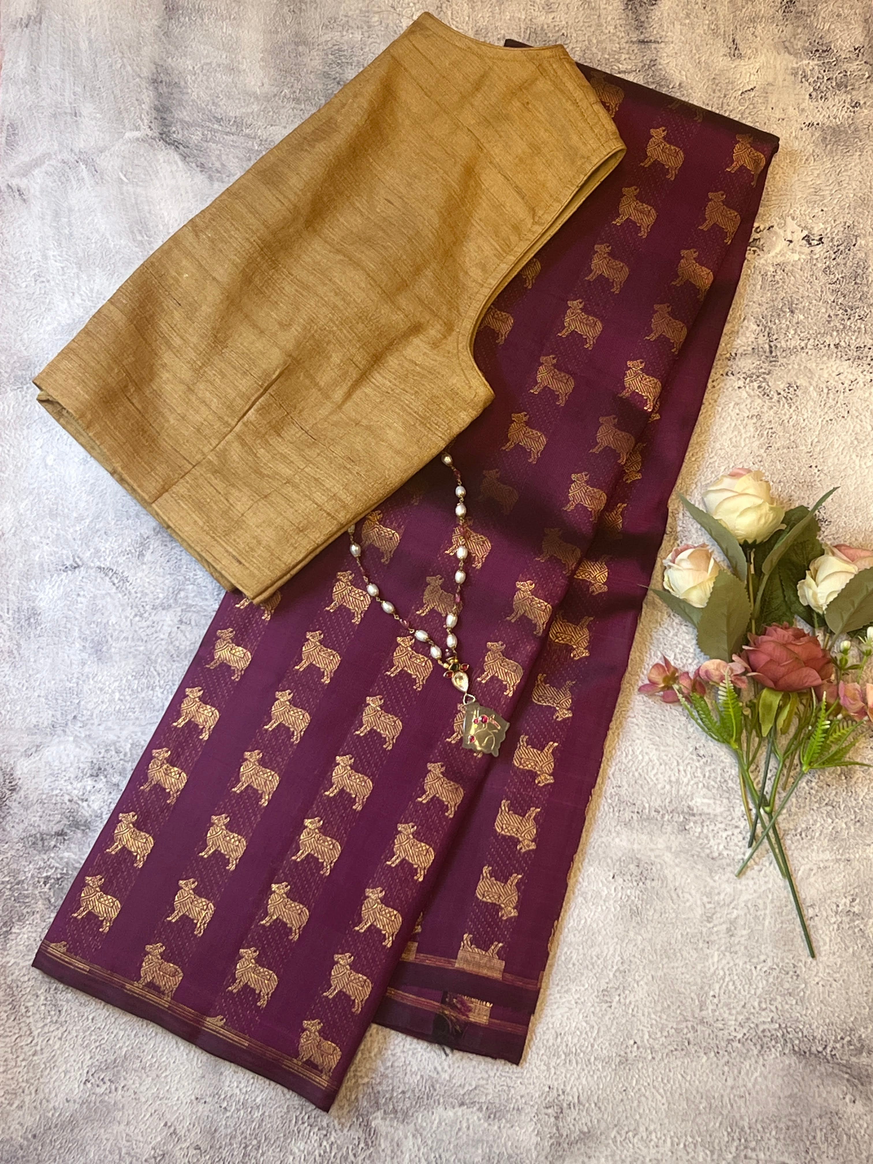 - The pallu has mythical creatures and rudrakshams woven in pure zari