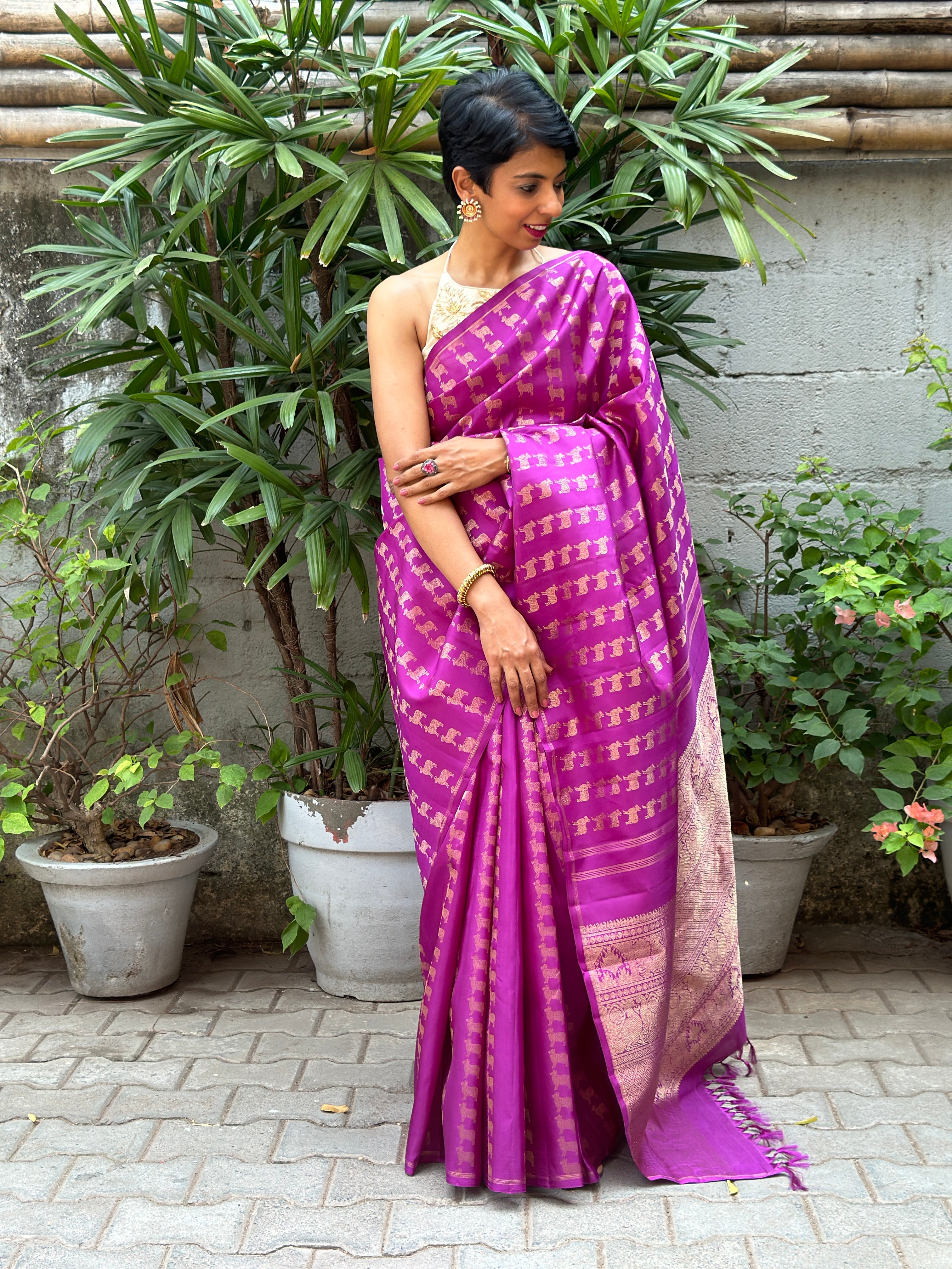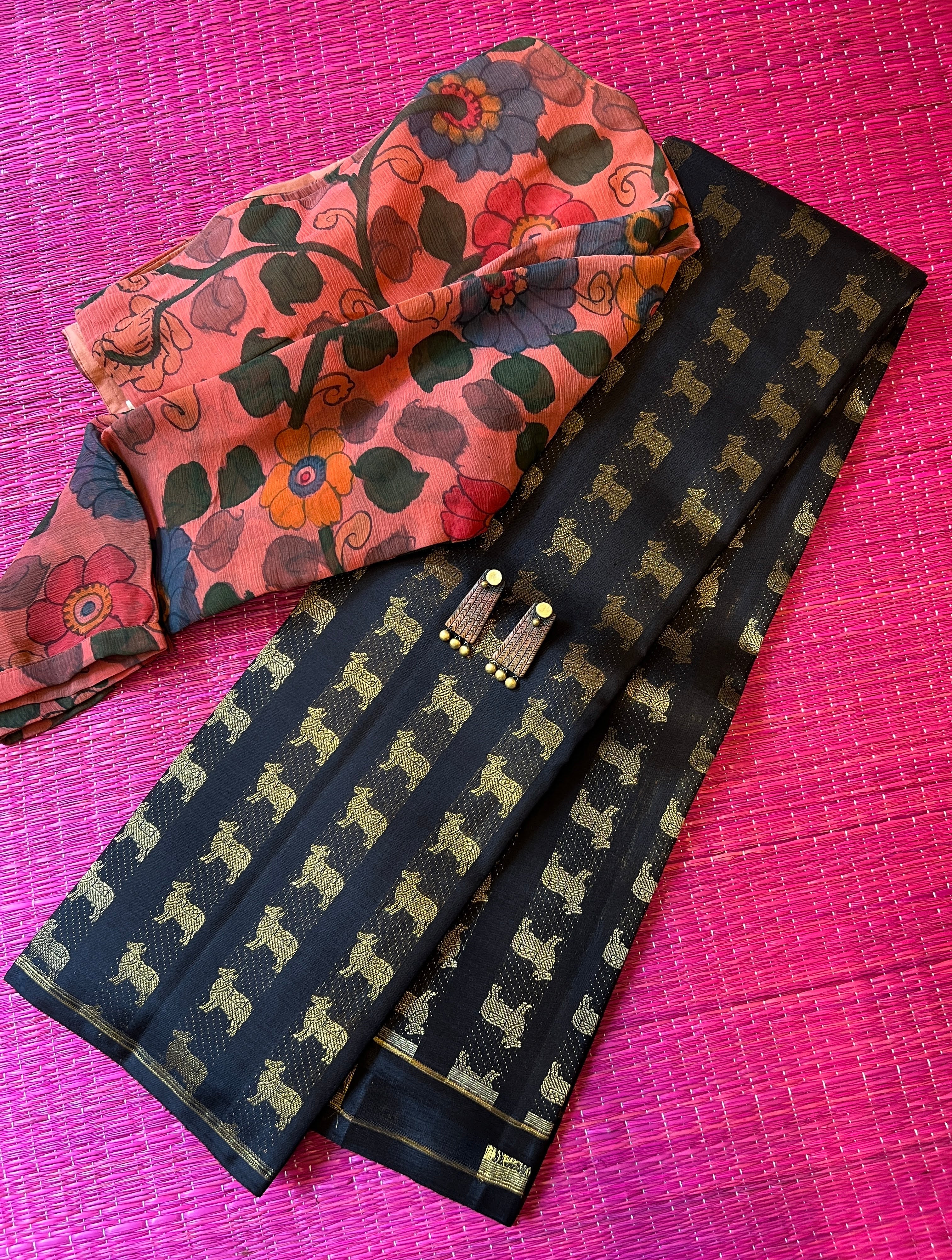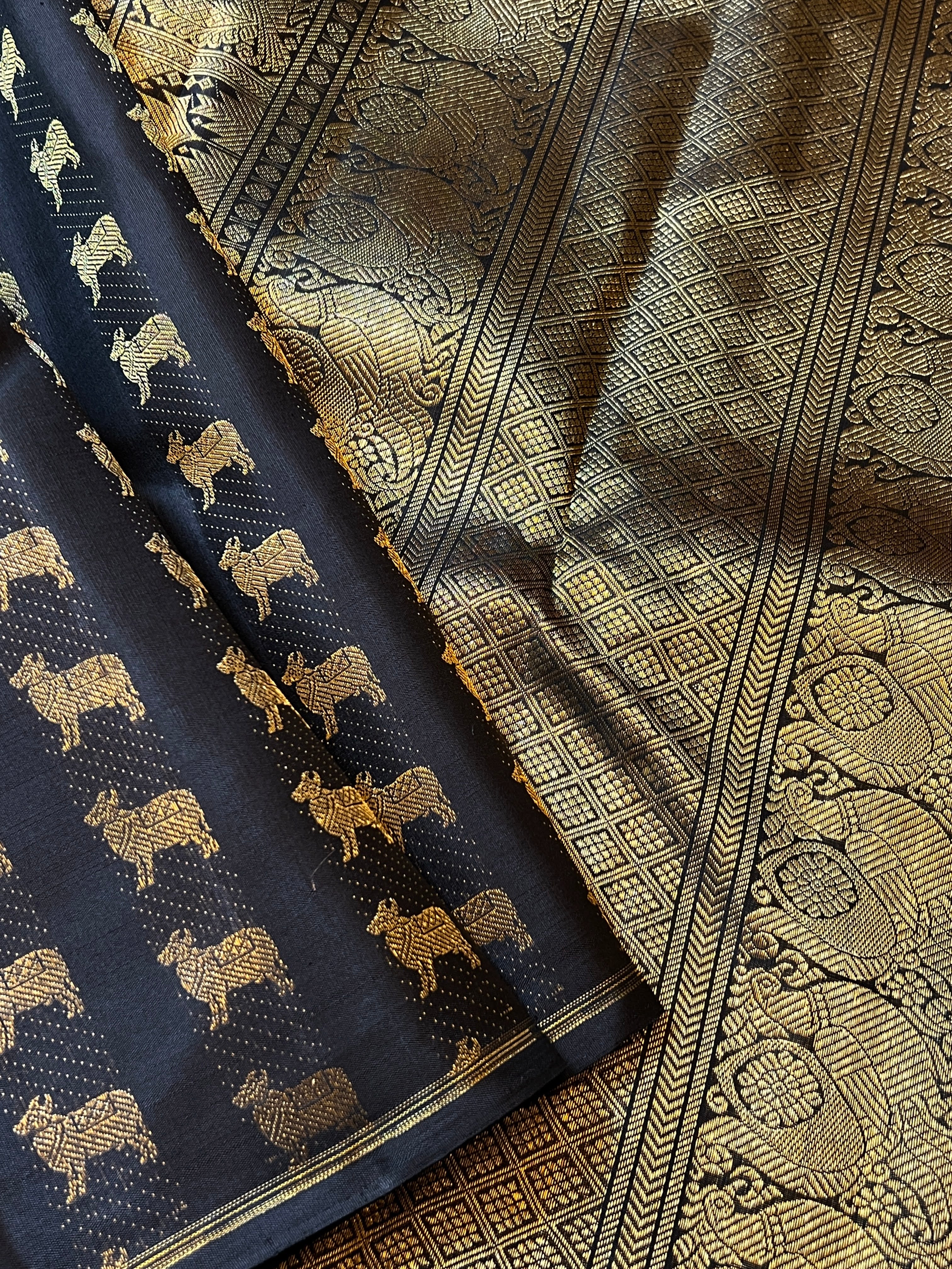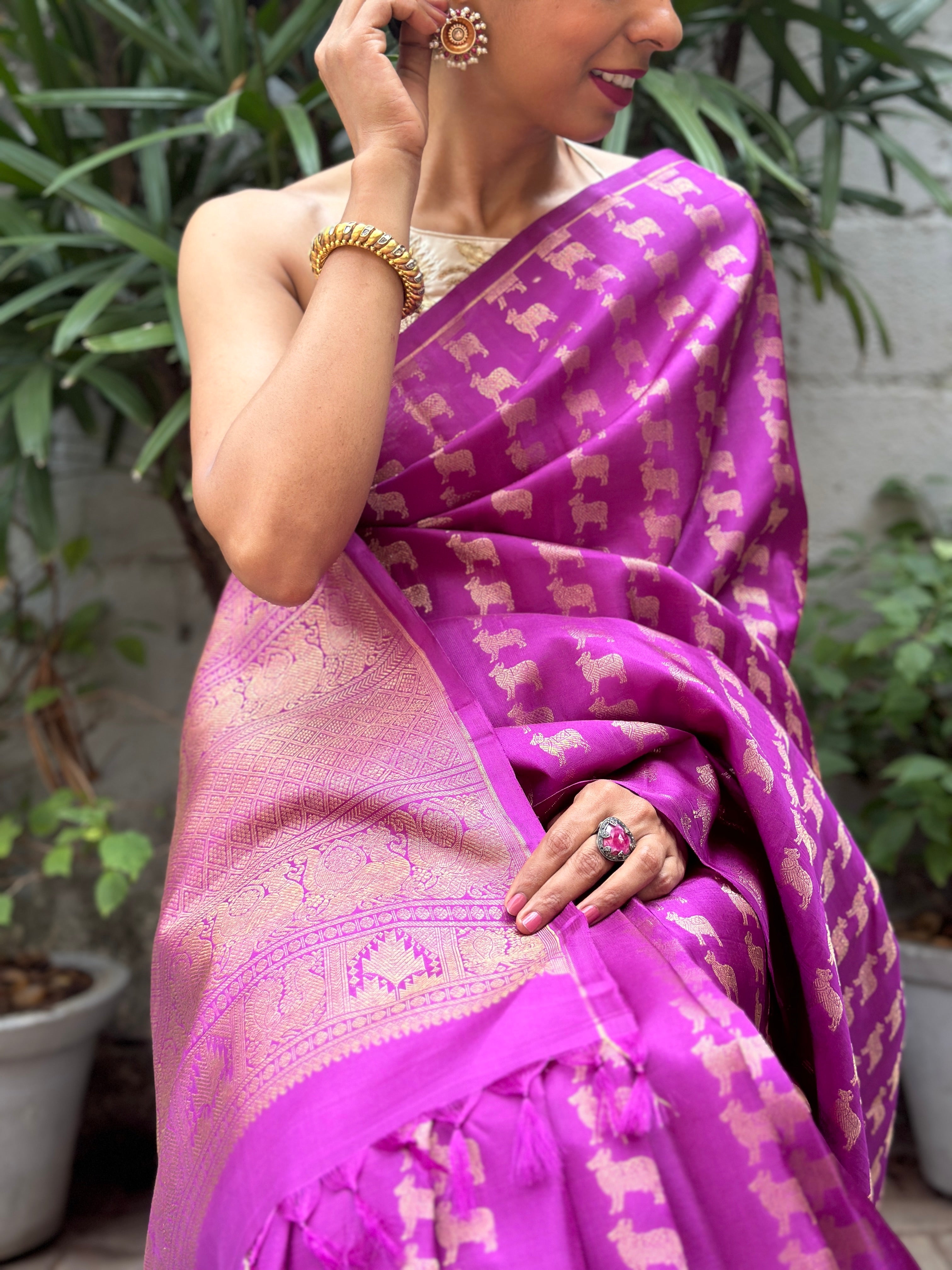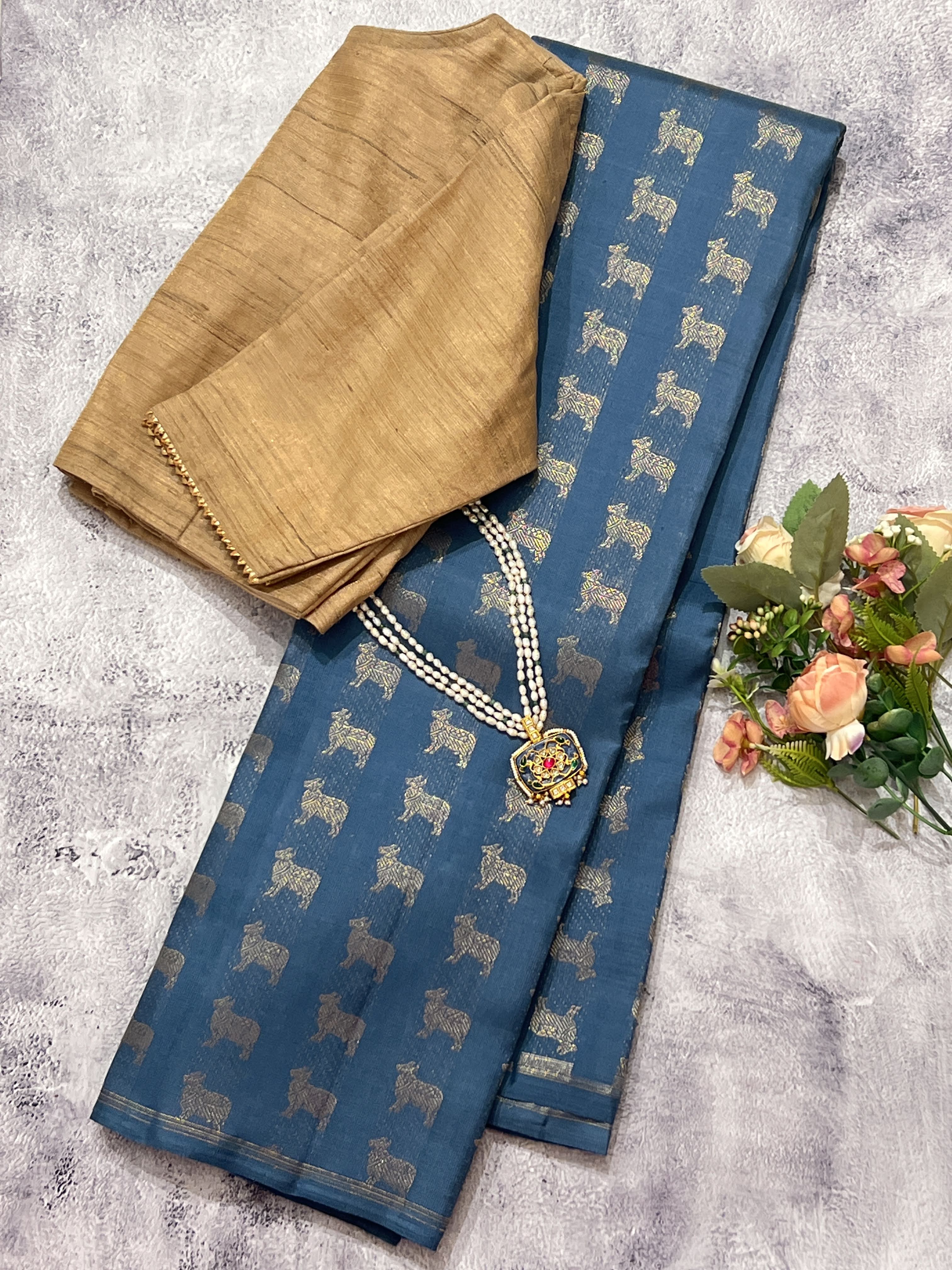 - The pallu has mythical creatures and rudrakshams woven in pure zari