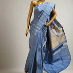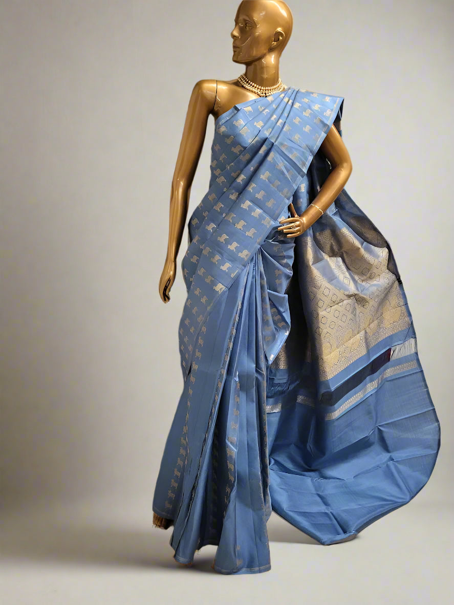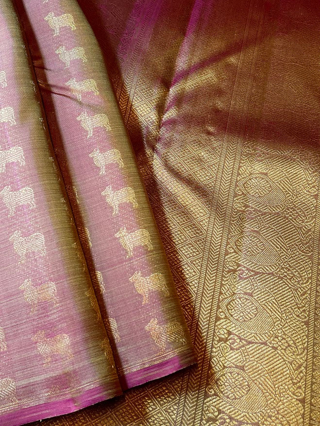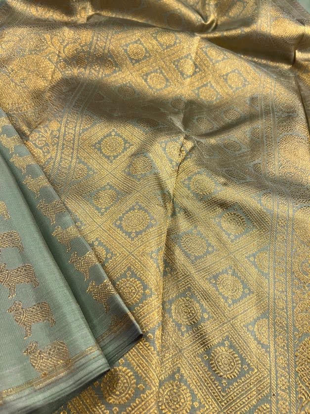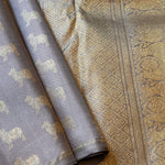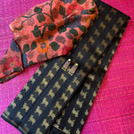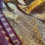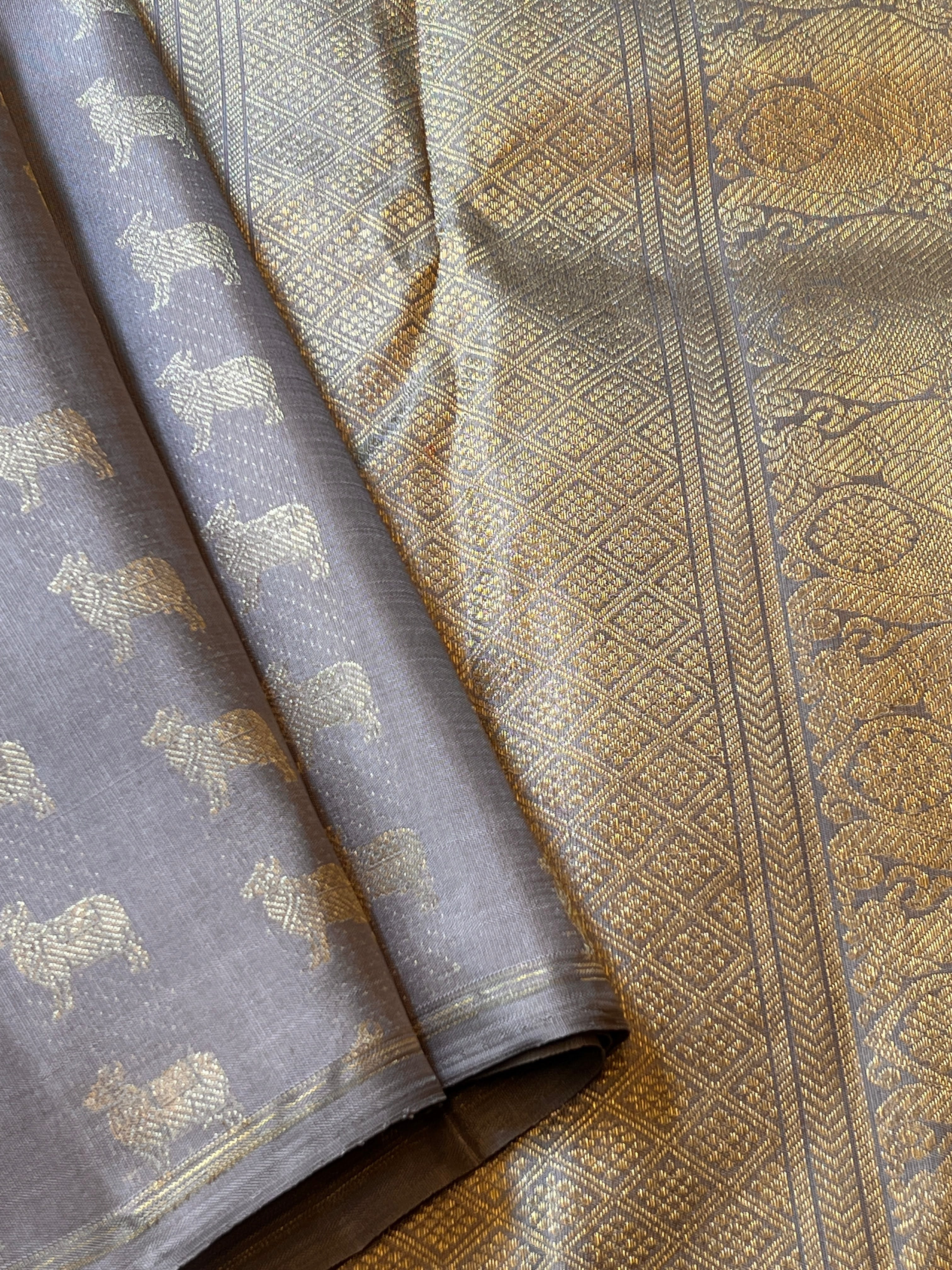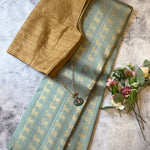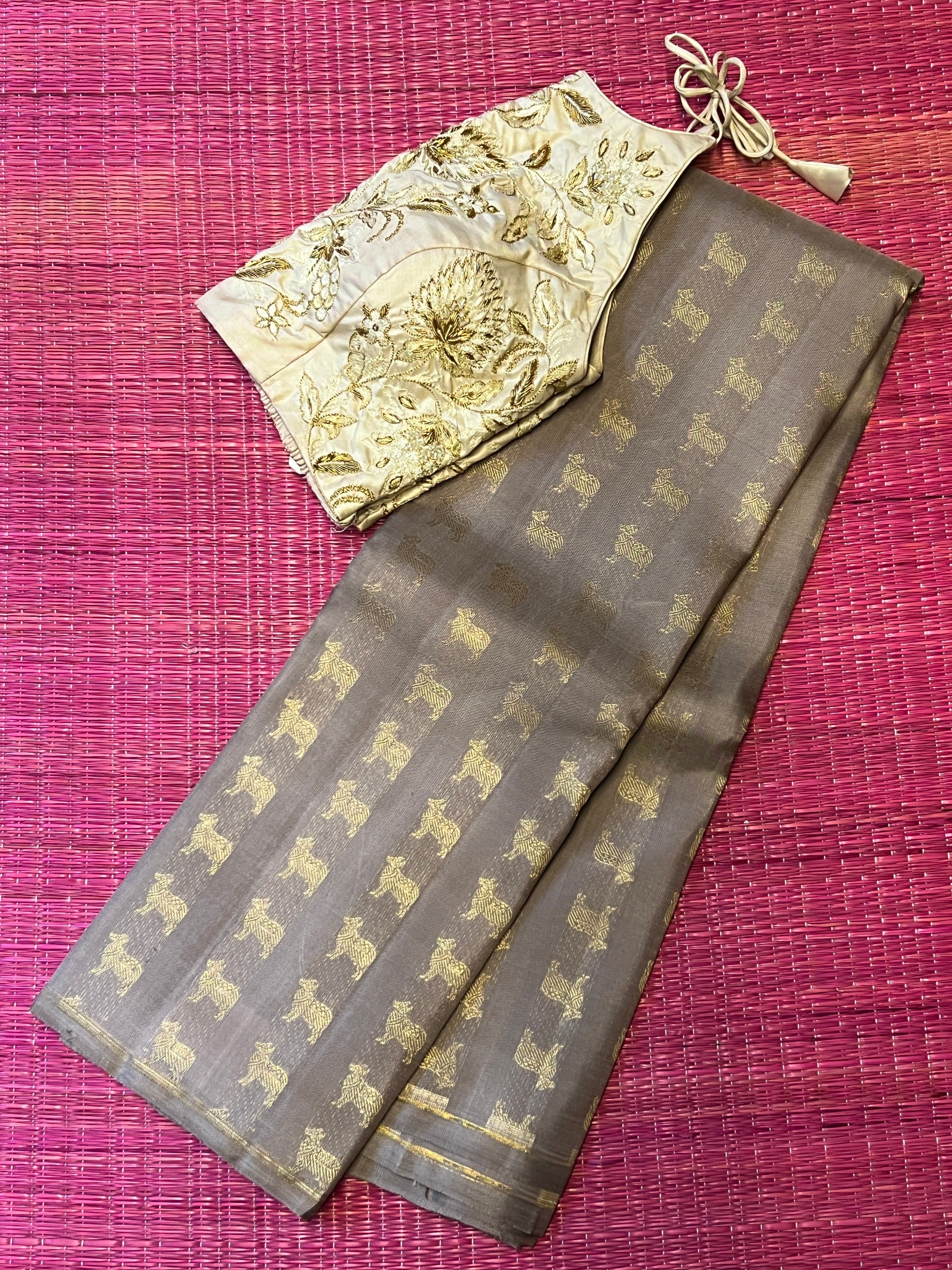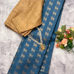 - The pallu has mythical creatures and rudrakshams woven in pure zari
