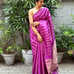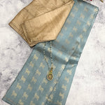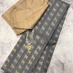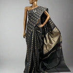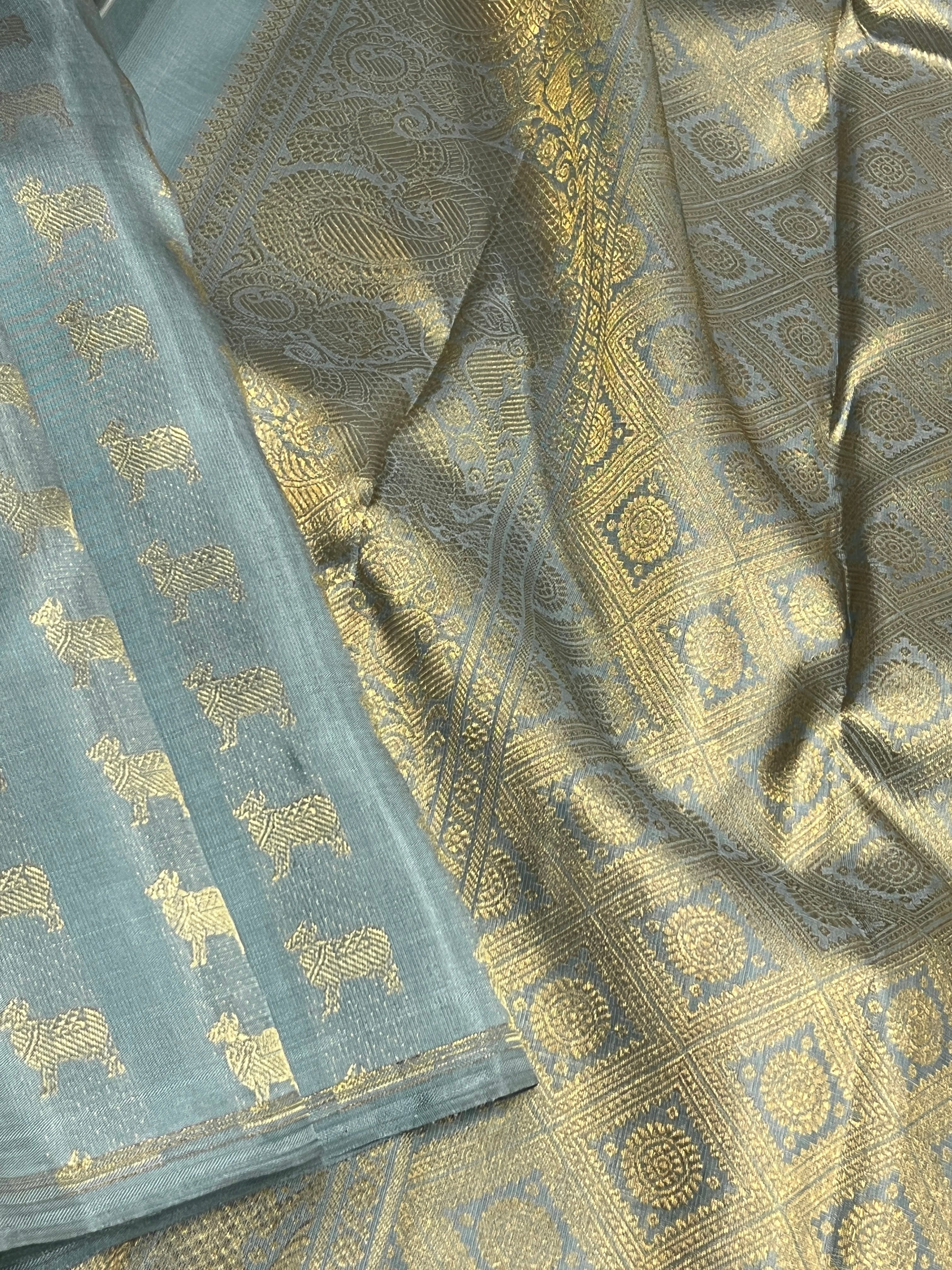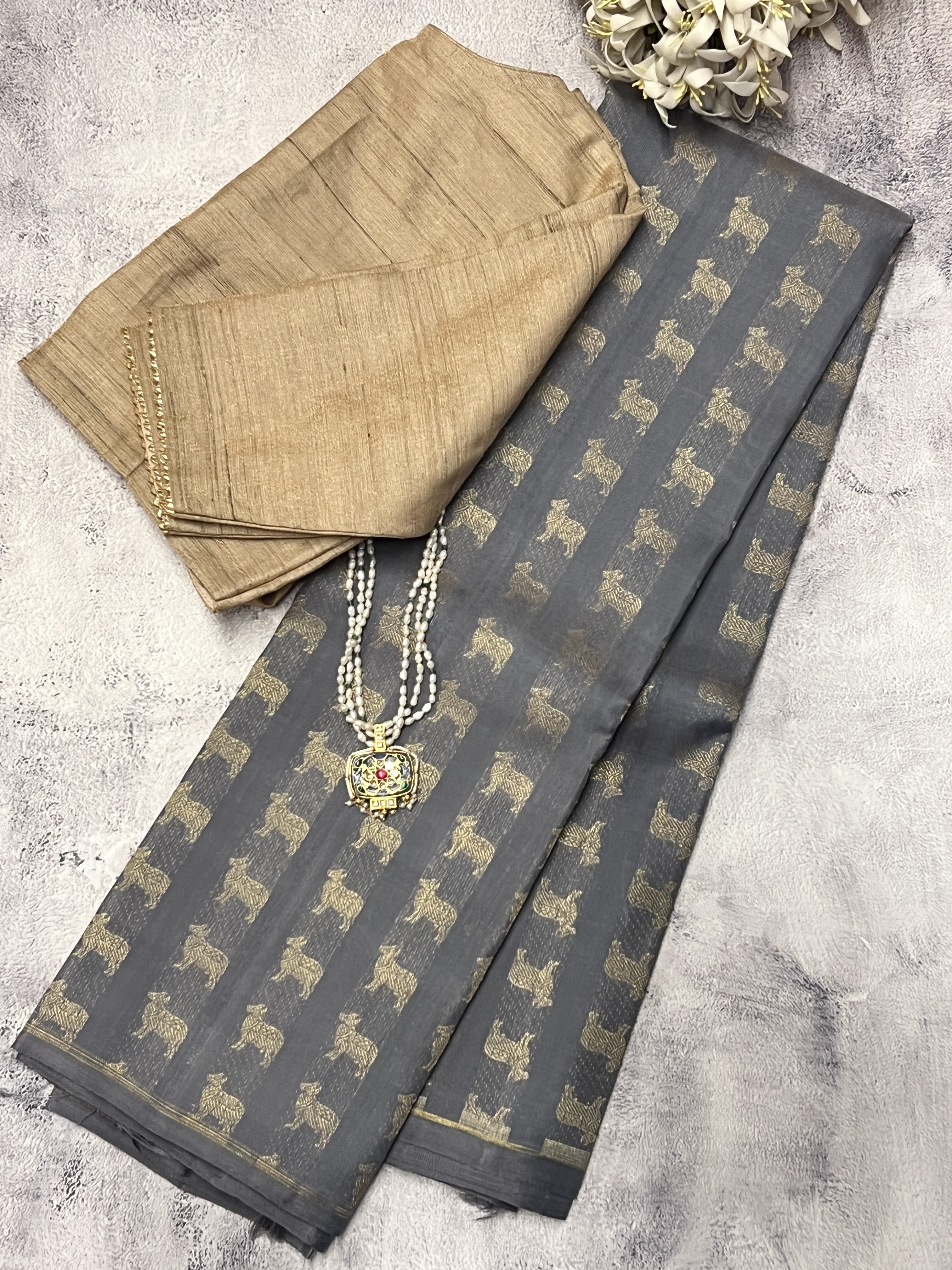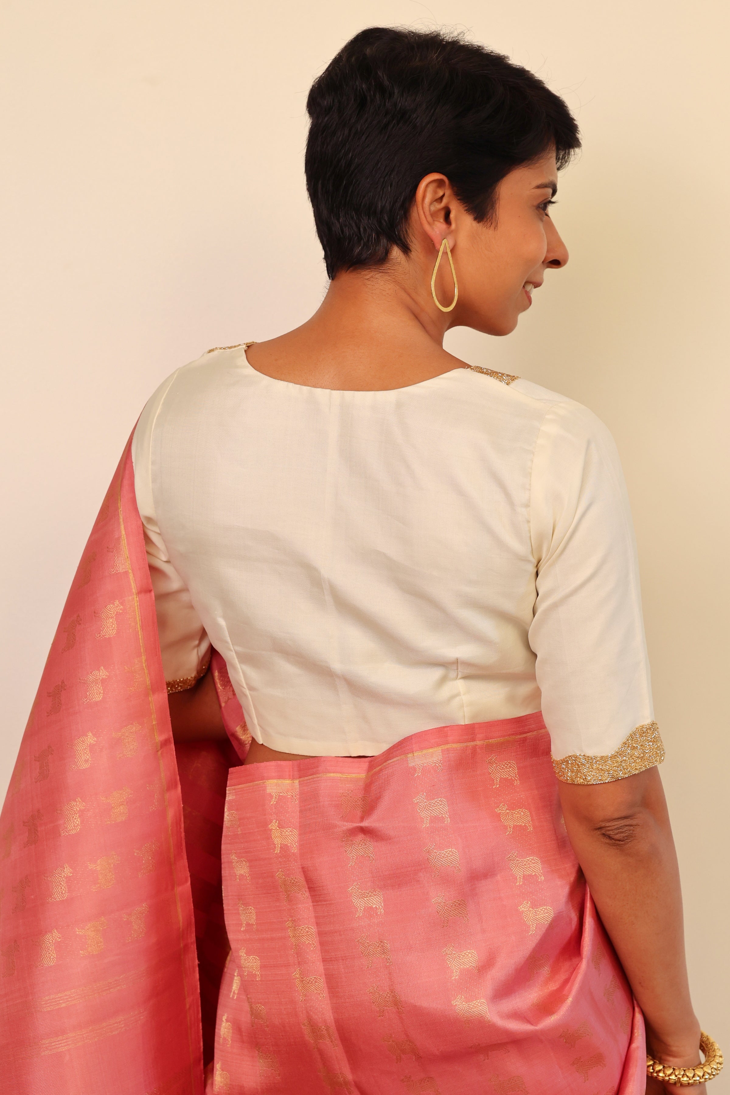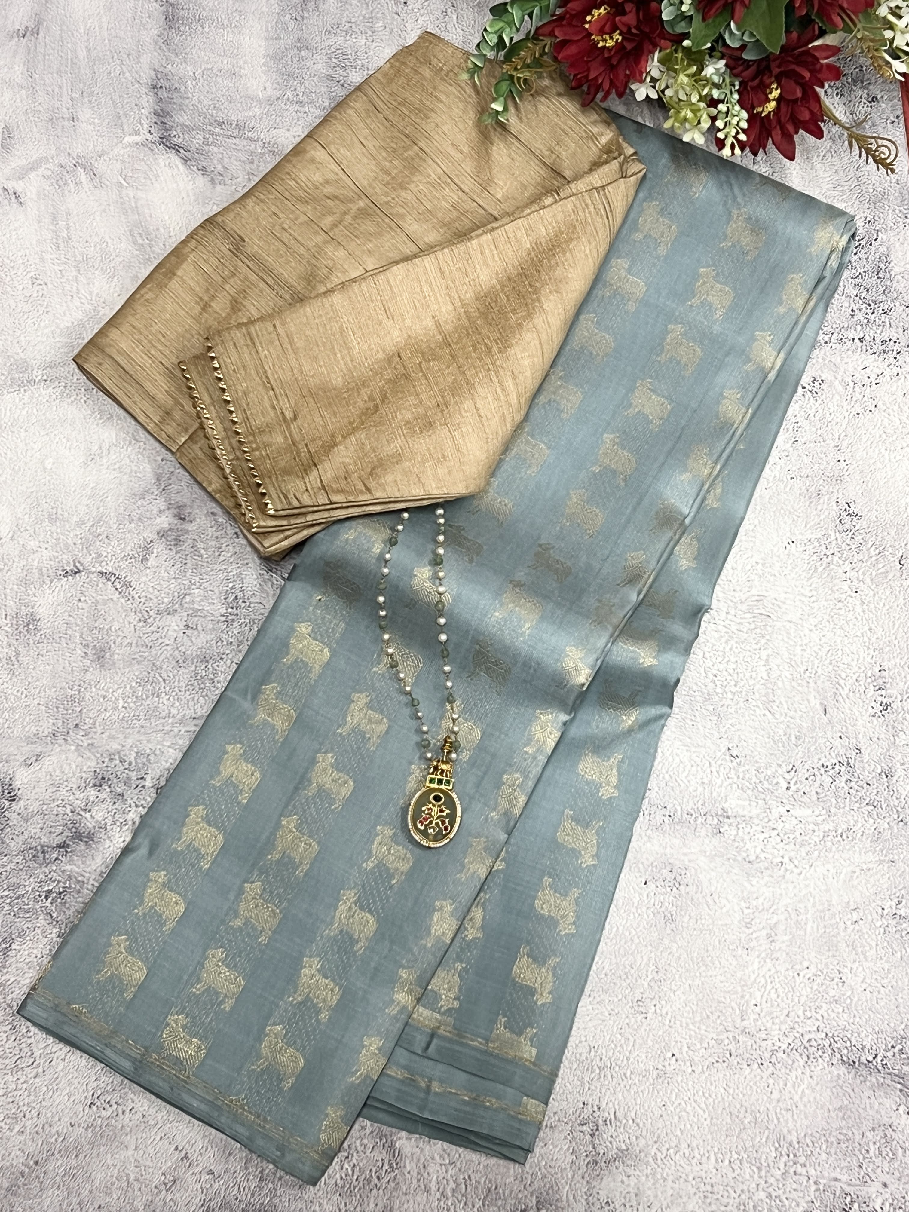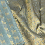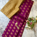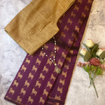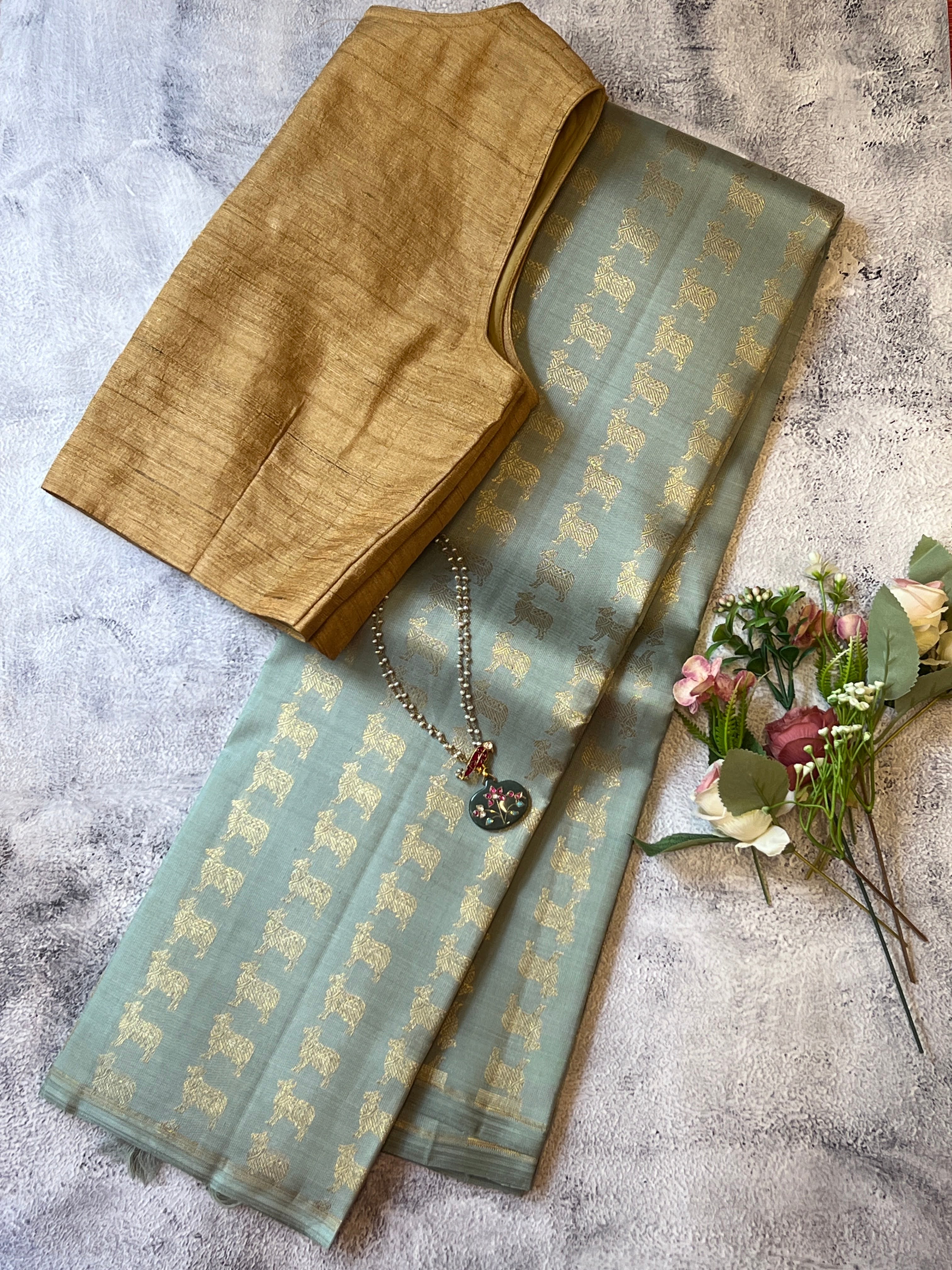 - The pallu has mythical creatures and rudrakshams woven in pure zari
