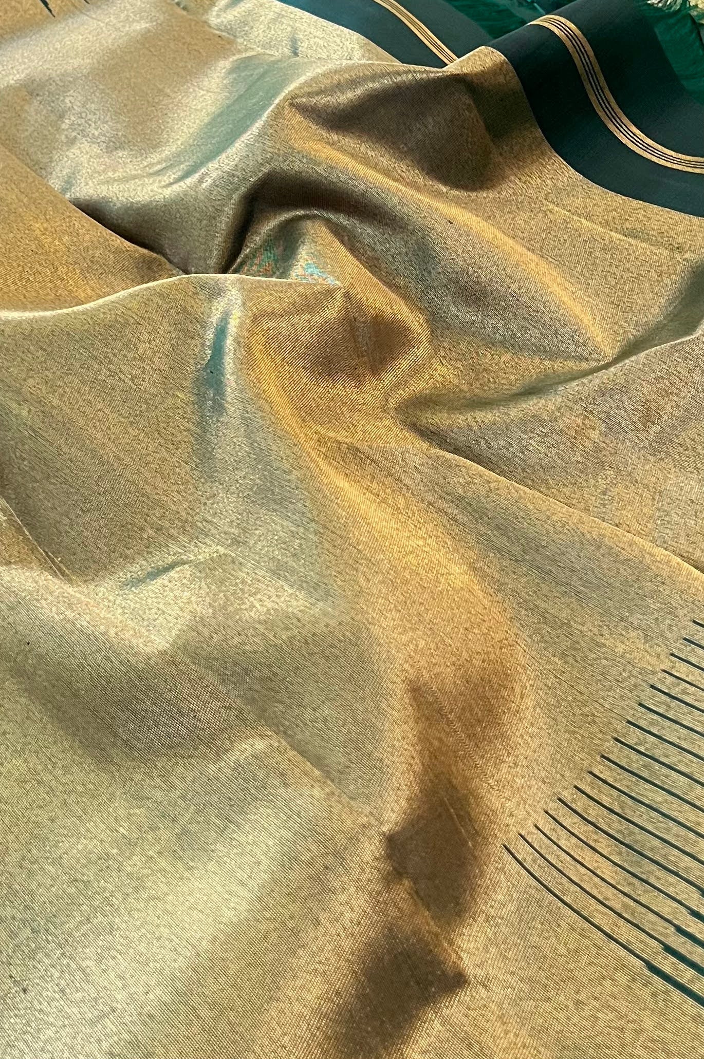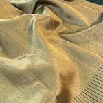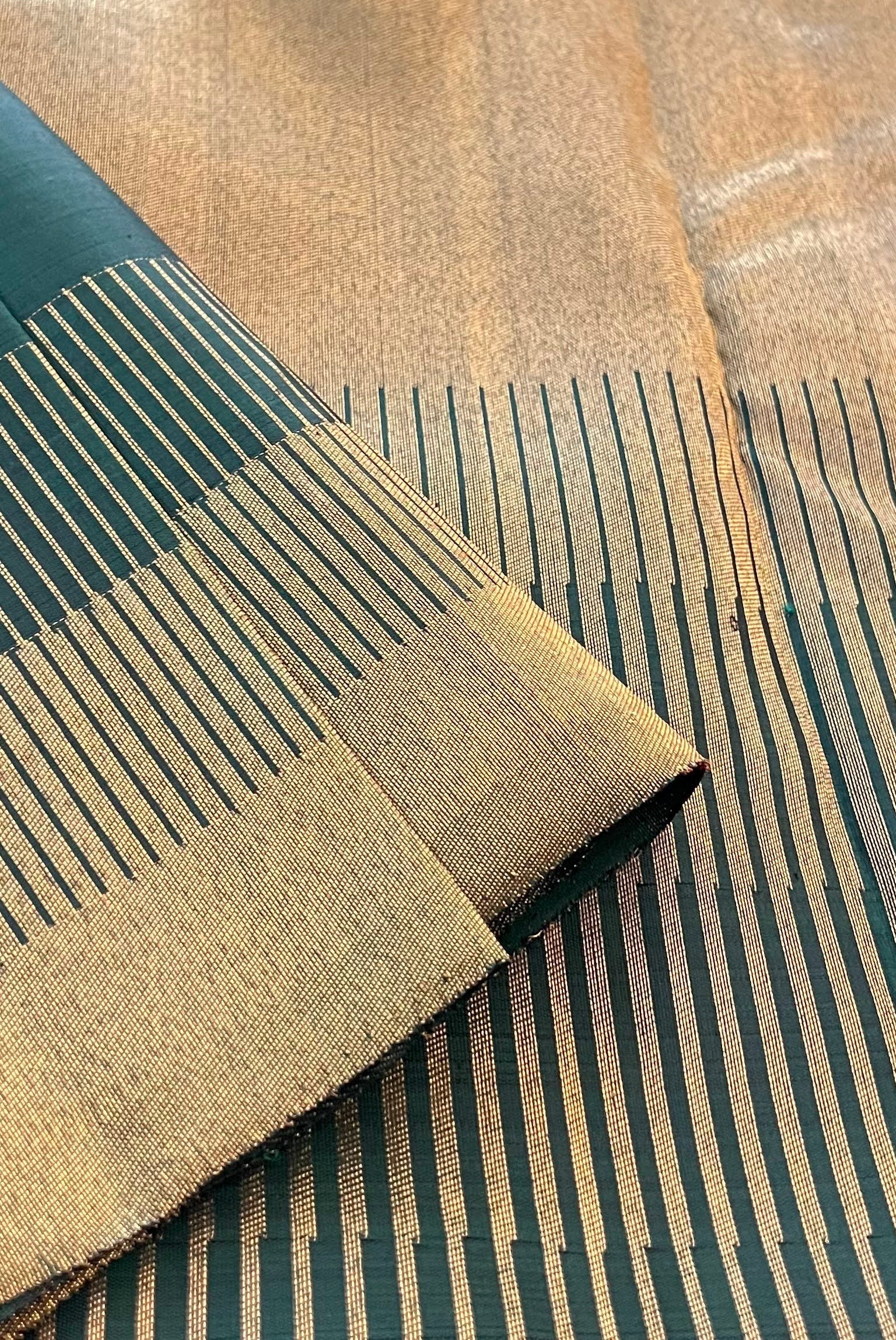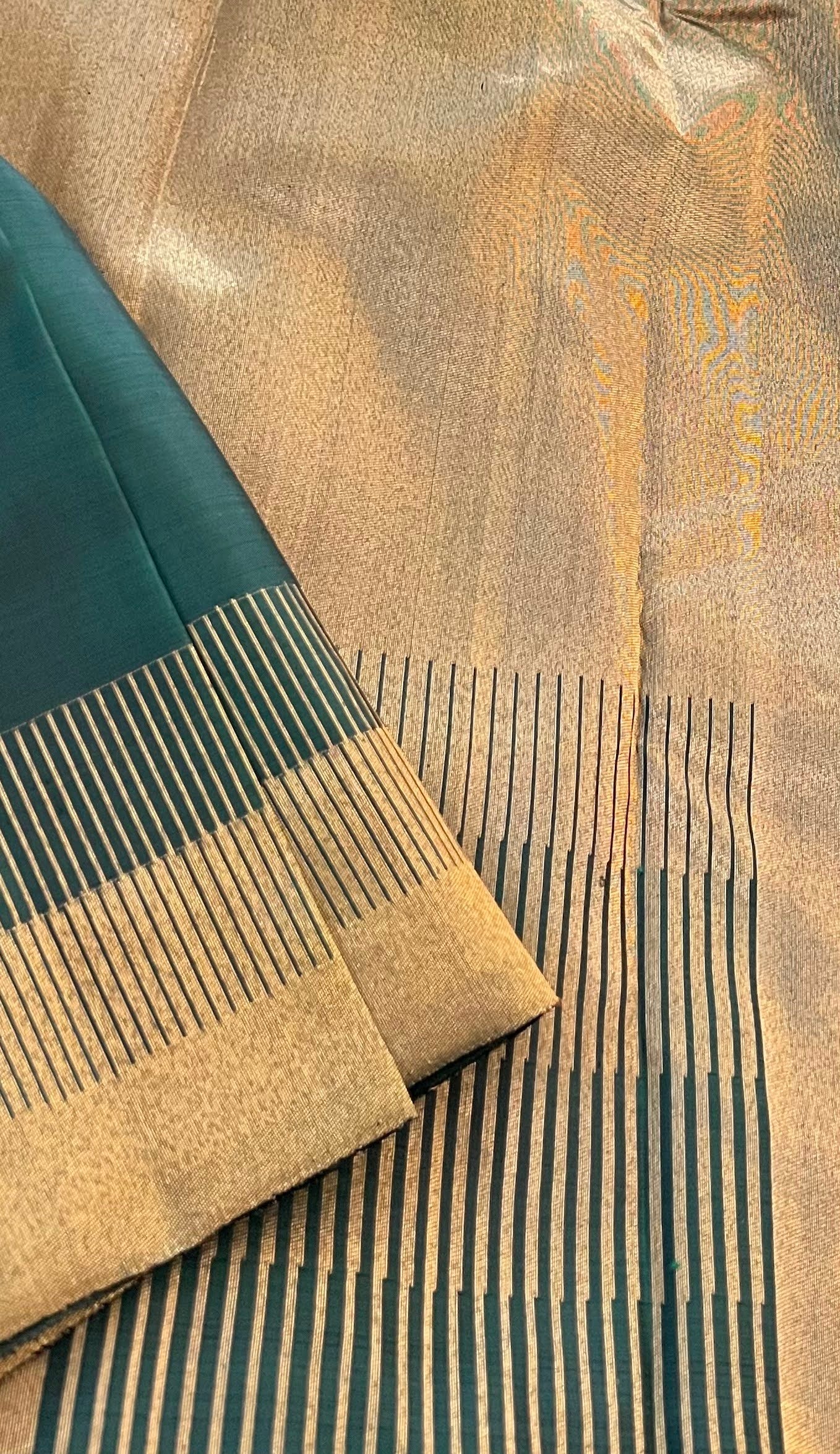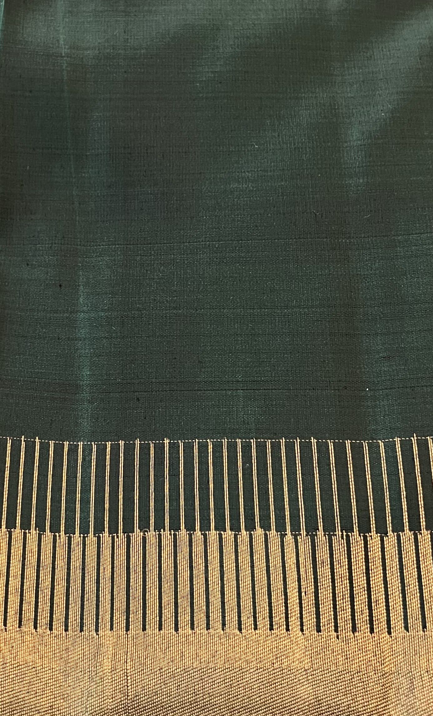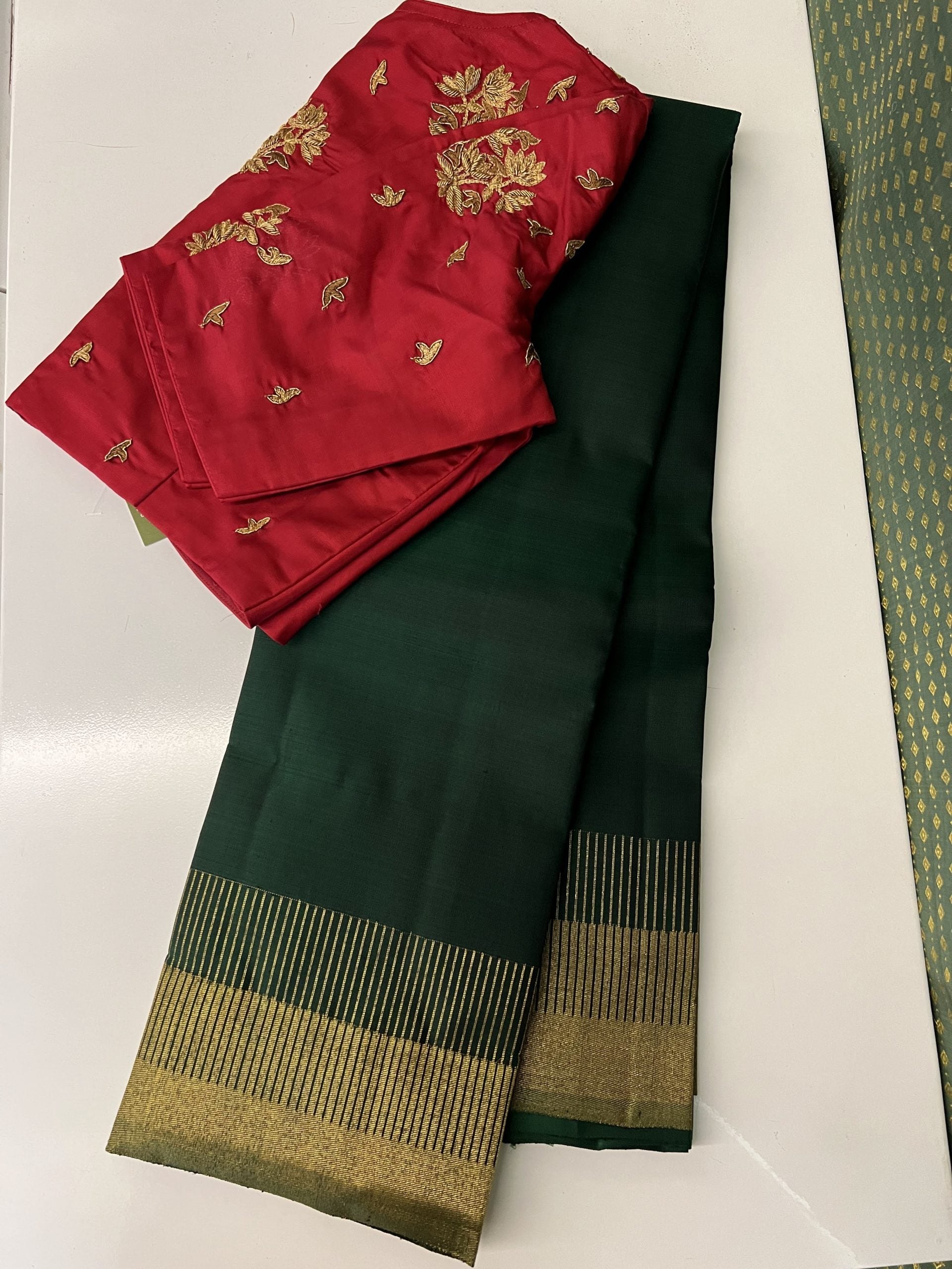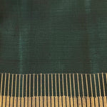Green handwoven Kanchipuram silk saree with geometric zari border. This saree features plain green all over the body with geometric border and pallu. Overall, this saree would be a beautiful and elegant choice for a special occasion. Blouse: Green Kanchipuram silk with border as in saree It can be paired with any silver jewelry and ready to wear blouse to add more shine and colour and the same can be purchased from the Accessories and Ready to wear section respectively. Note : The tailored blouse featured is only for reference. more