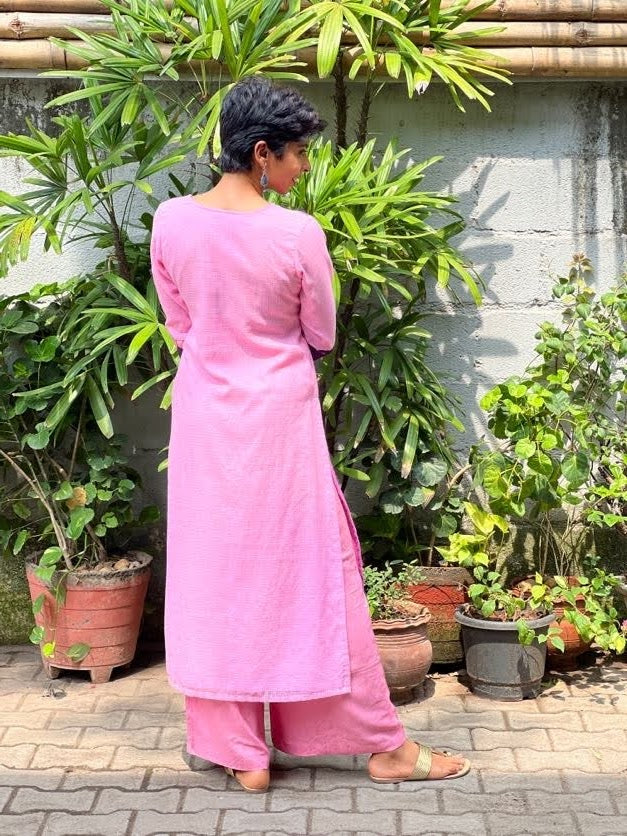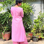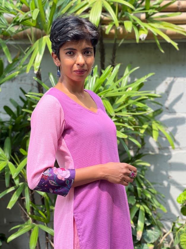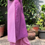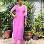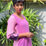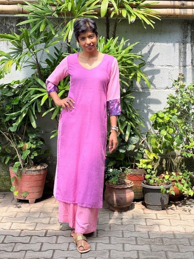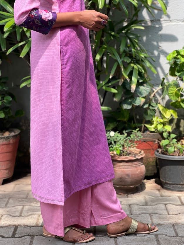 Lavender Kota kurta with 3/4th sleeves and a curved V-neckline. Kurta features purple sleeves and back that has detailing on the cuffs features handblock printed floral pattern in chanderi.Overall, outfit is a beautiful and stylish garment that combines traditional and modern elements to create a unique and fashionable look. It is perfect for special occasions, festivals, or formal events.Bottom : NADupatta : NA