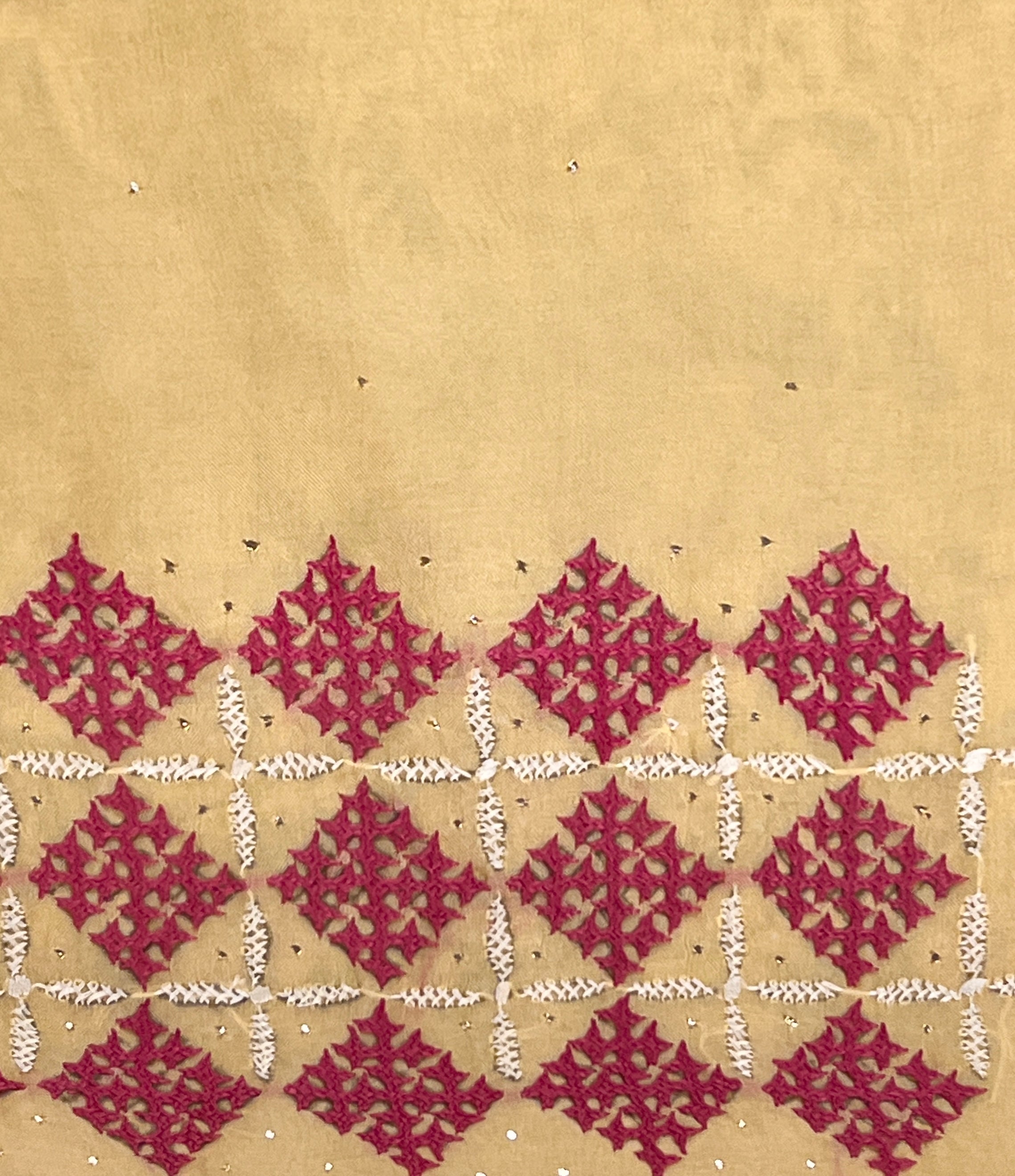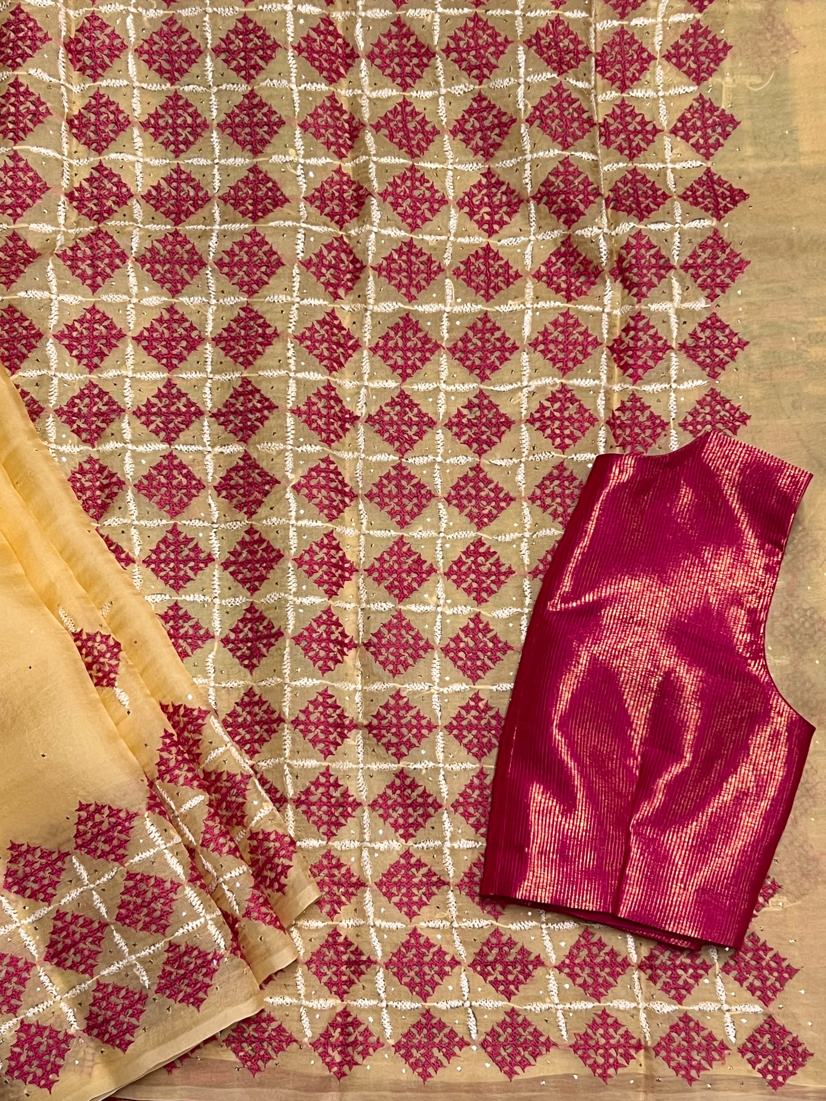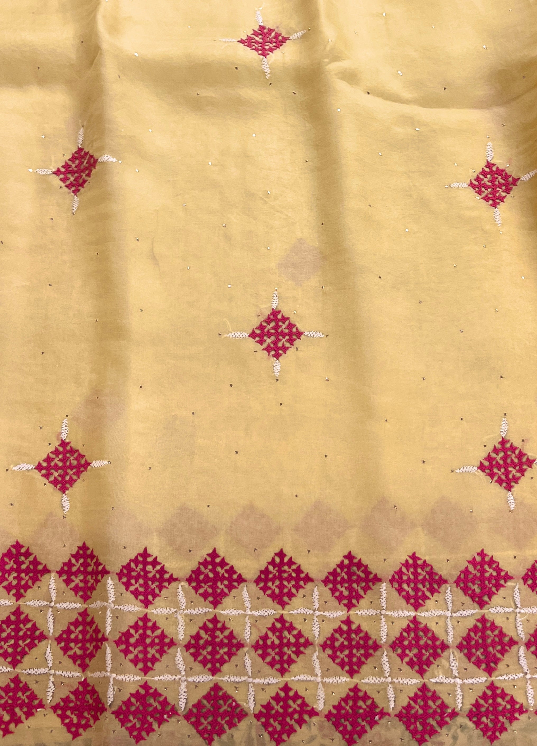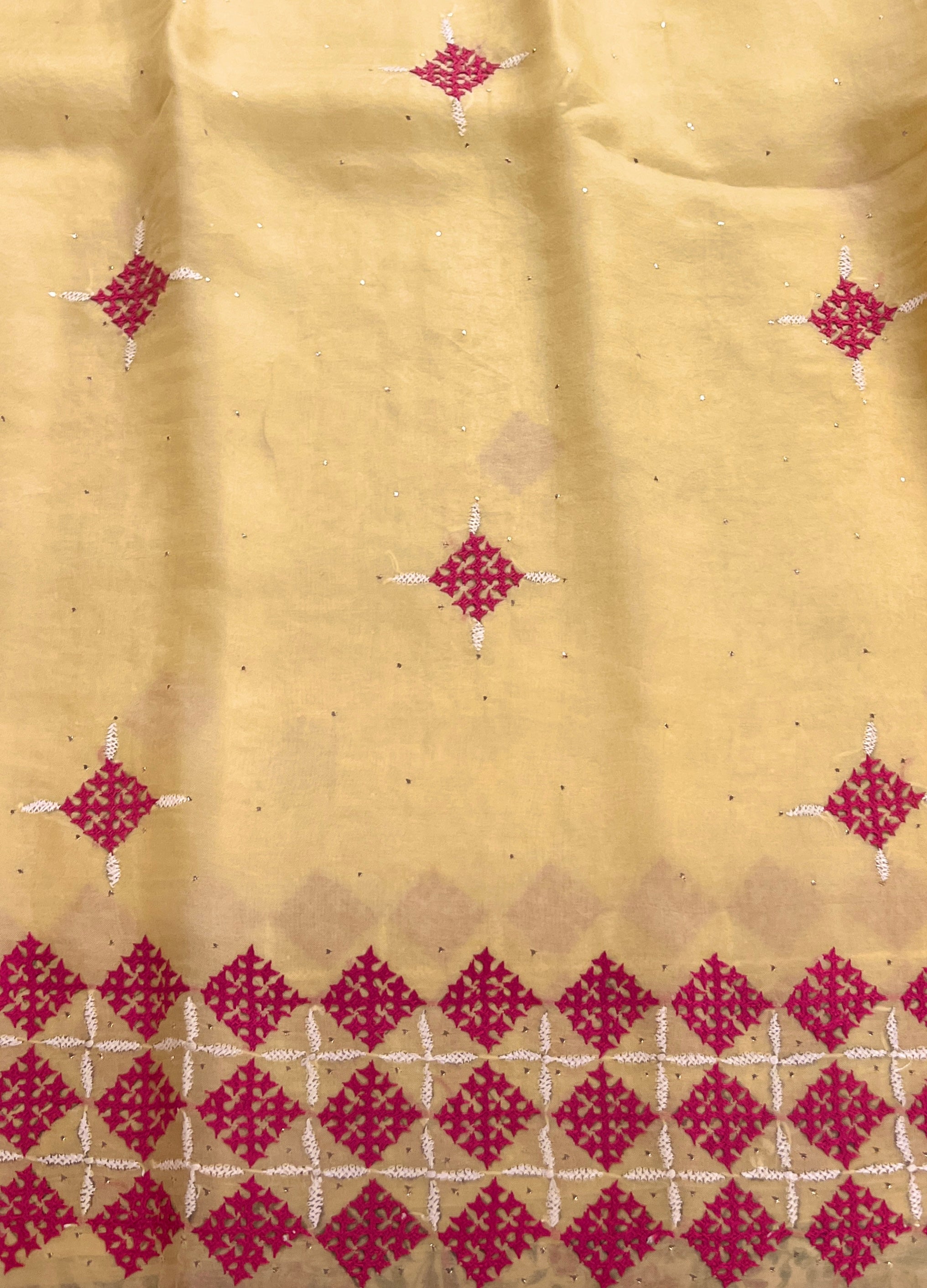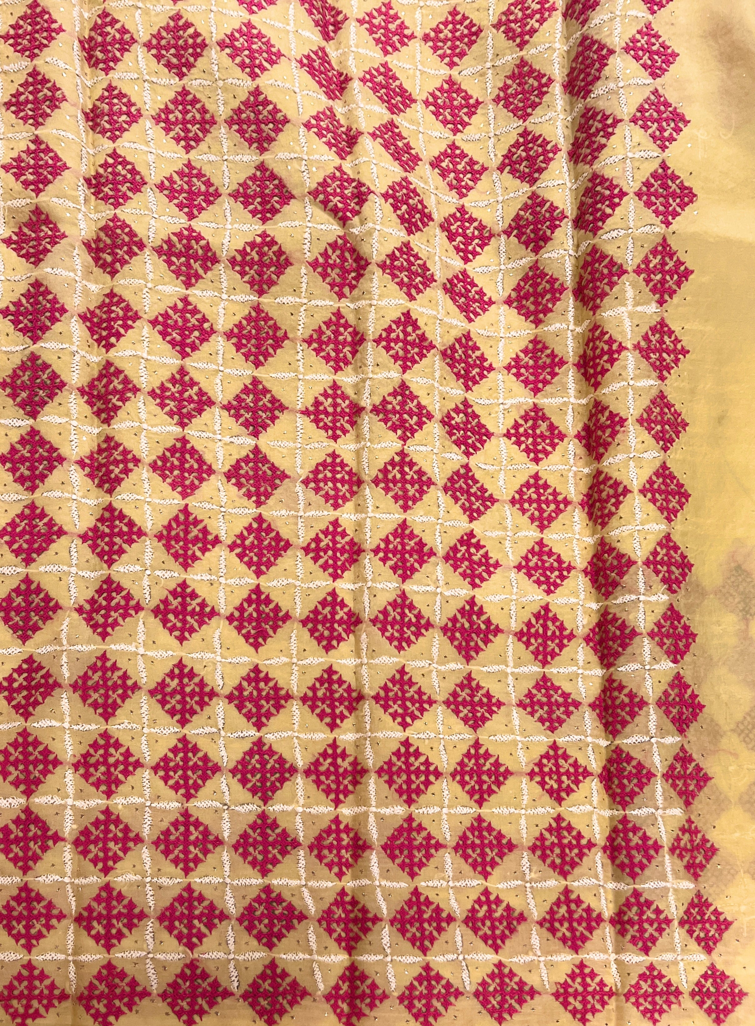 - Contrast Kutch embroidery on borders enhances the saree’s appeal and adds artisanal value.