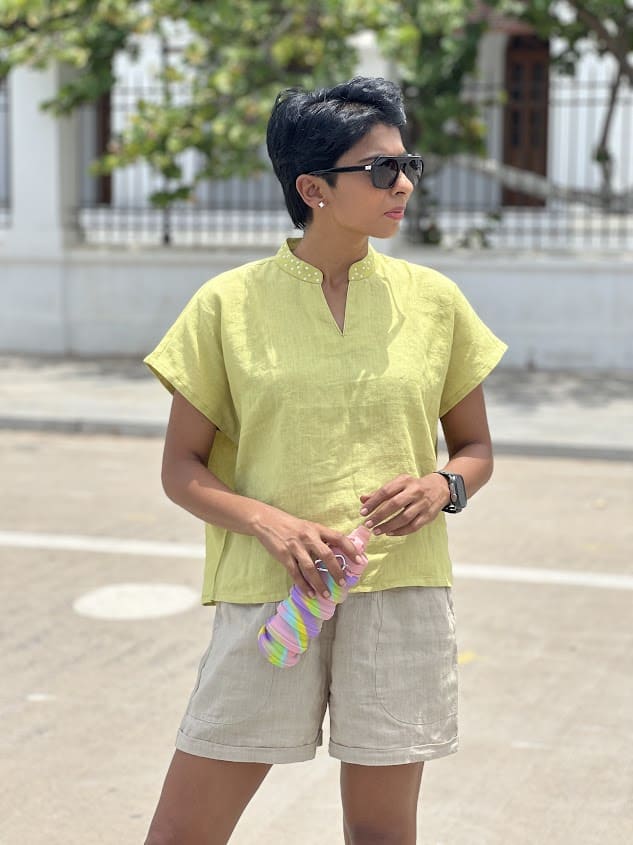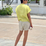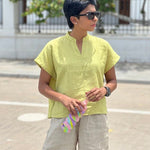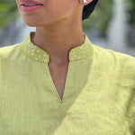 Lime linen shirt with embroidered polka dots on the collar. The fit is a box fit