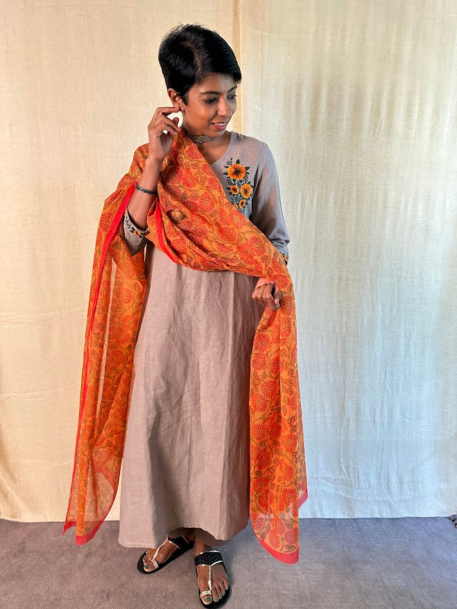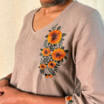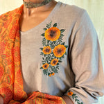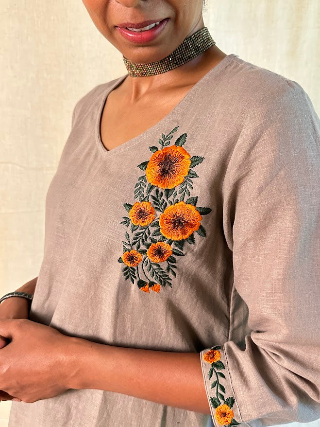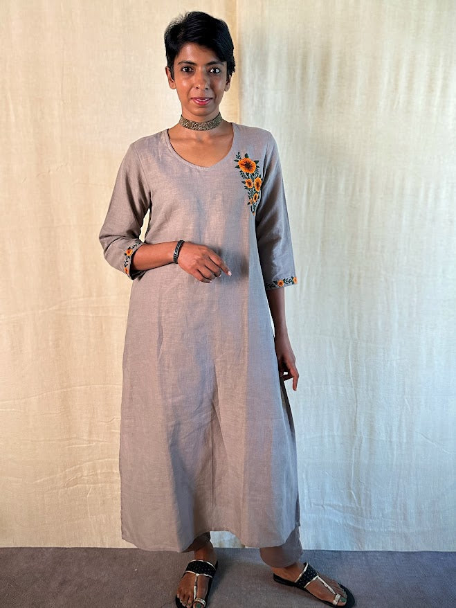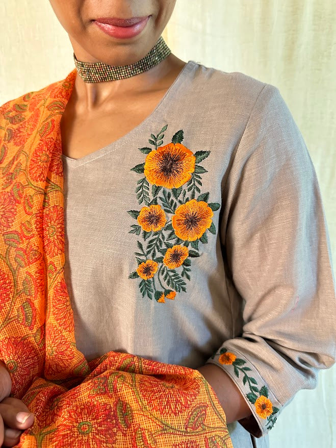 Handloom linen Embroidered detailing on one side of the shoulder and sleeve Smart accompaniment with dupattas Gentle handwash