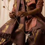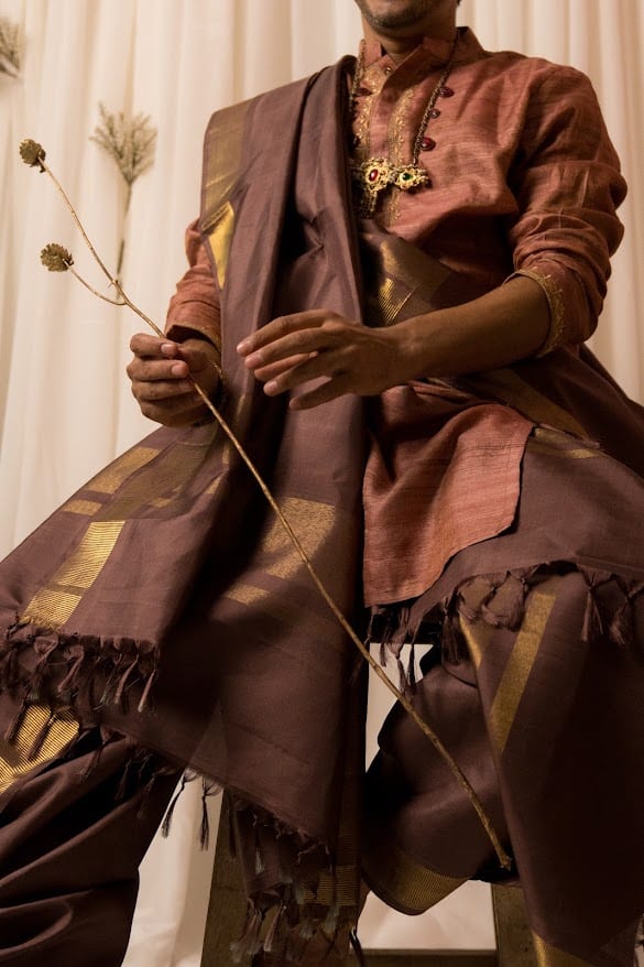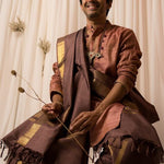 Introducing a stylish and contemporary dothi/angavastram set in a striking chocolate brown shade. The distinctive Aavaranaa katari pettu/geometric pure zari border enhances the allure of this pure handwoven Kanchipuram silk. This new addition to our Sah-A range exudes a cool, modern, understated elegance, making it remarkably versatile. When paired with our dusty peach pure zari Tussar kurta, it exudes an effortless yet distinctive sense of style. However, the versatility of both the dothi's style and the color allows for numerous styling options, making it perfect for weddings and festive occasions.