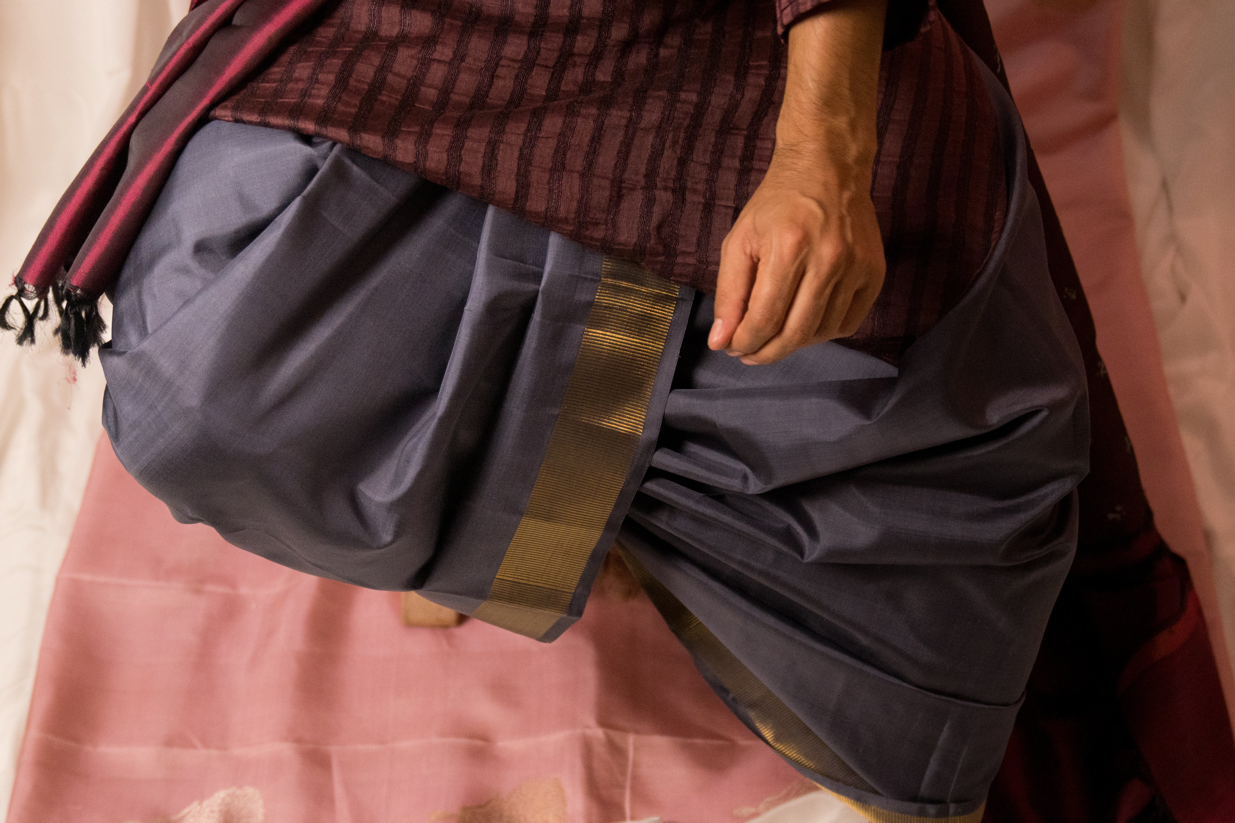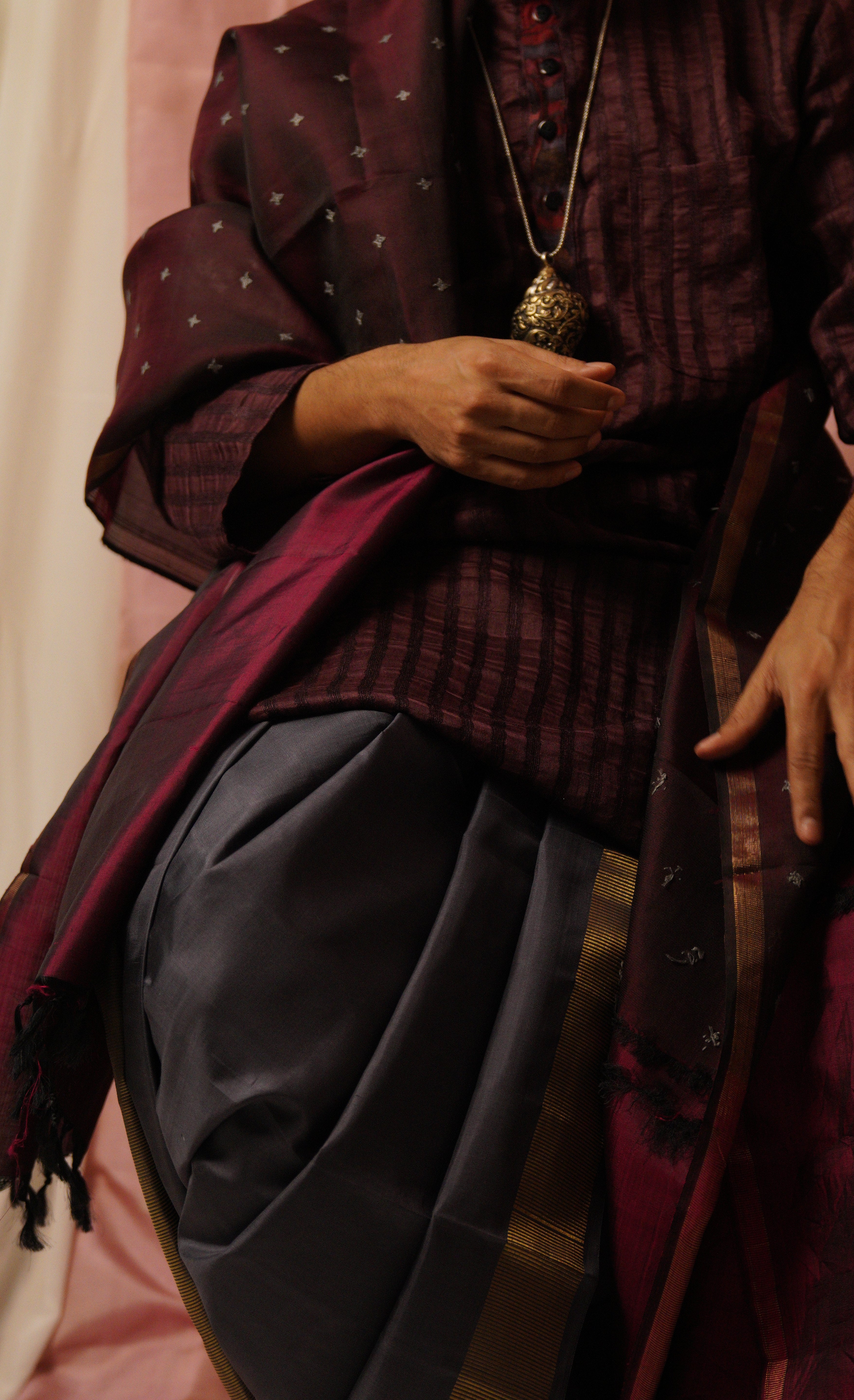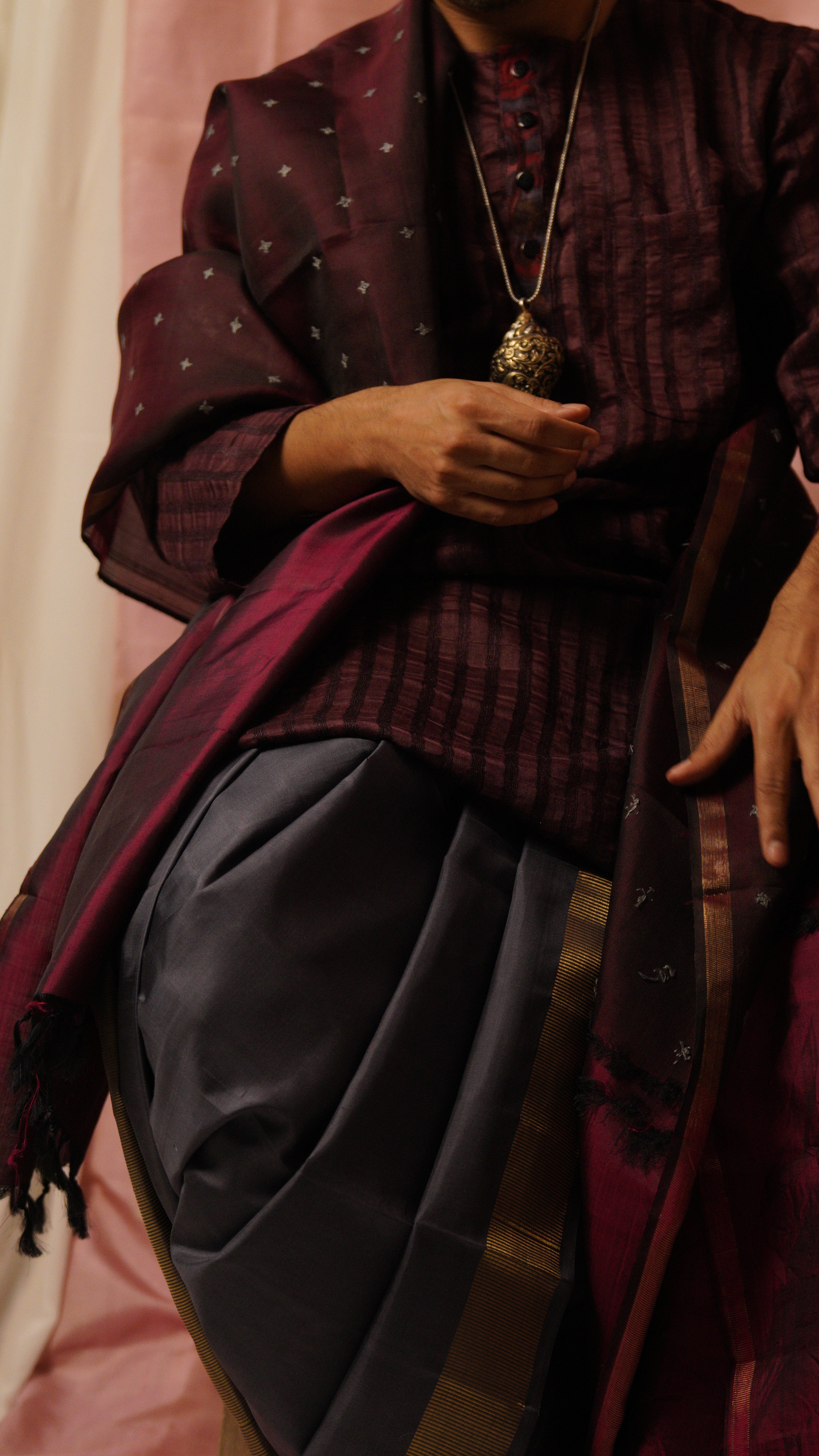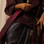 Introducing a chic and modern dhoti/angavastram set in impactful deep grey colour. Our signature Aavaranaa katari pettu/geometric pure zari border enhances the appeal of this pure handwoven Kanchipuram silk. This addition to our Sah-A range is cool, contemporary, understated, and remarkably versatile. Teamed up with our deep burgundy tussar kurta it emanates a sense of ease paired with distinction. However, the versatility of the style of the dhoti and the colour, lends itself to innumerable styling choices, that are perfect for weddings and festivities