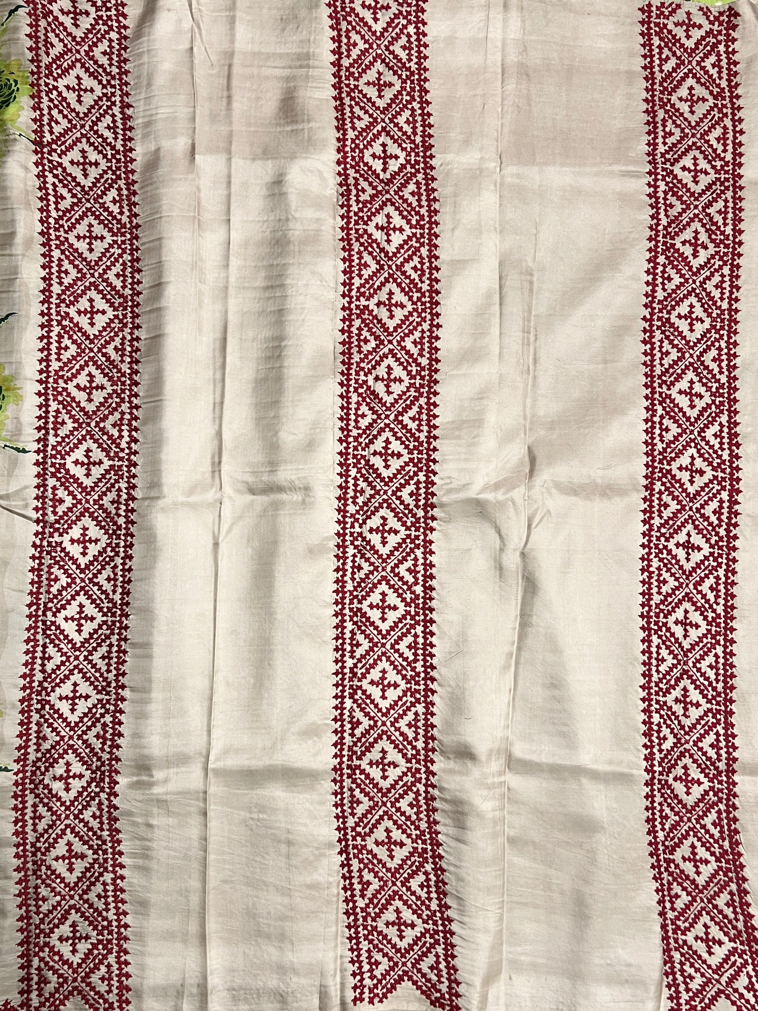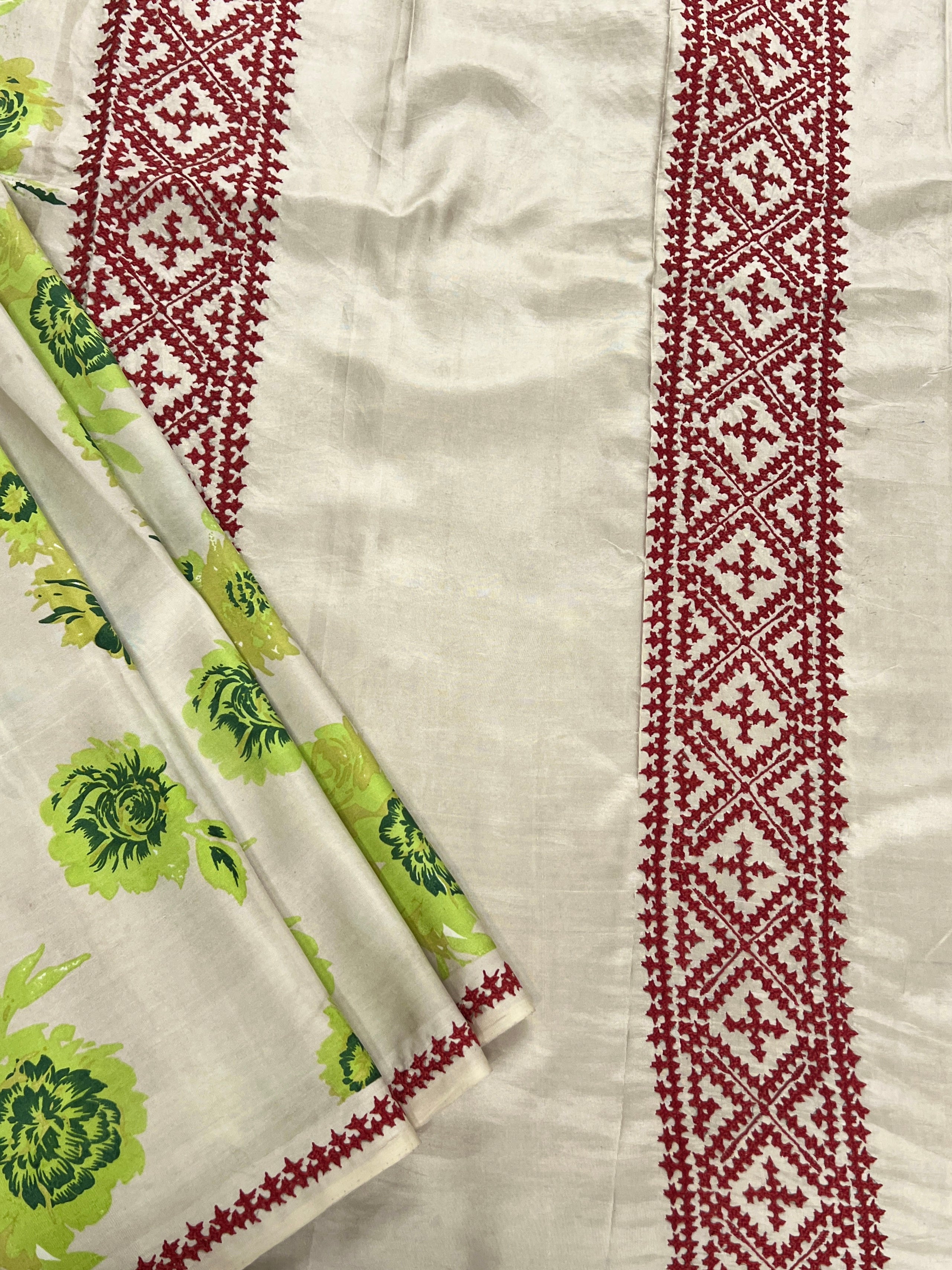 Intricate Kutch embroidery enhances the pallu and borders, adding texture and traditional charm.
