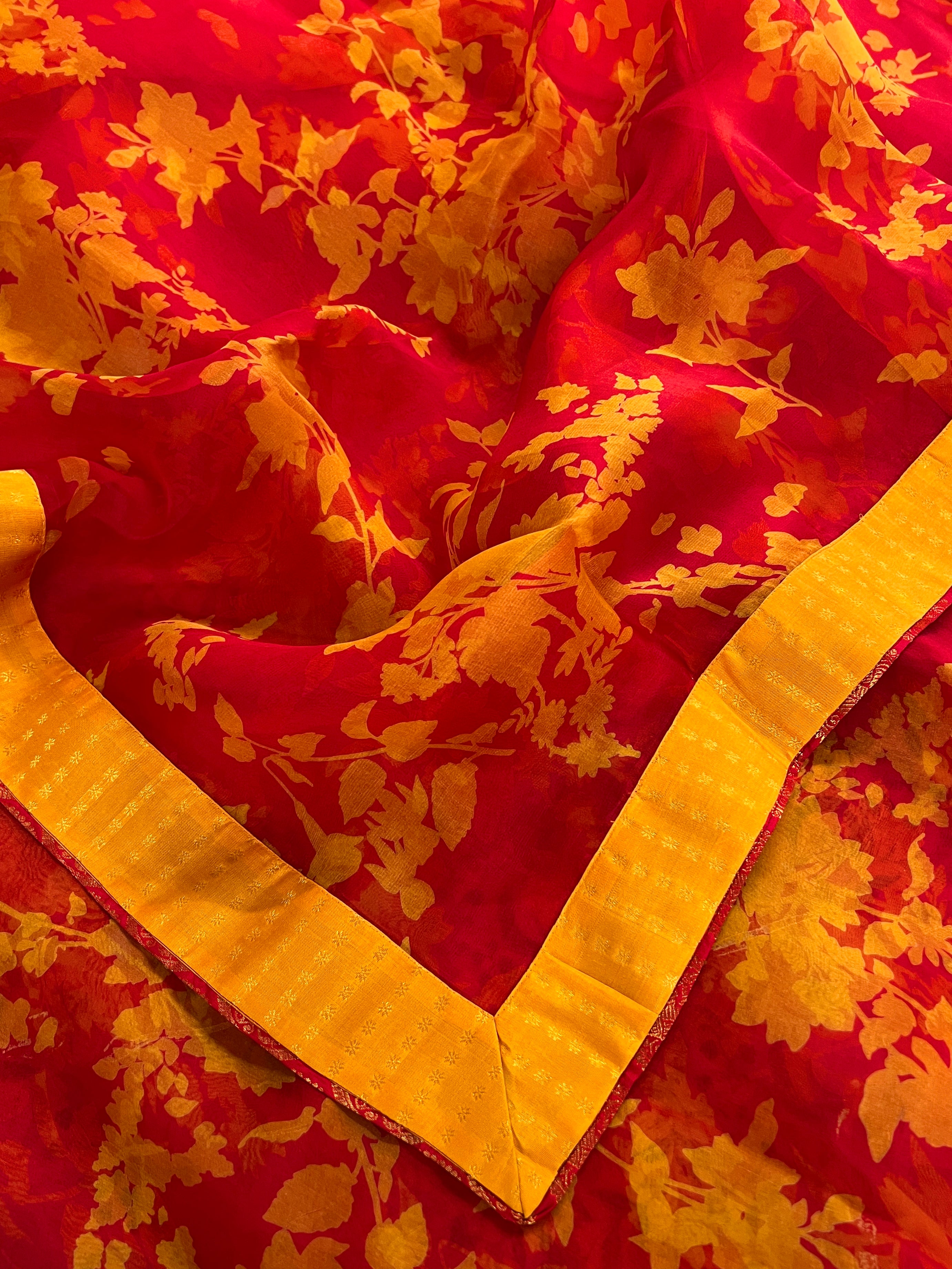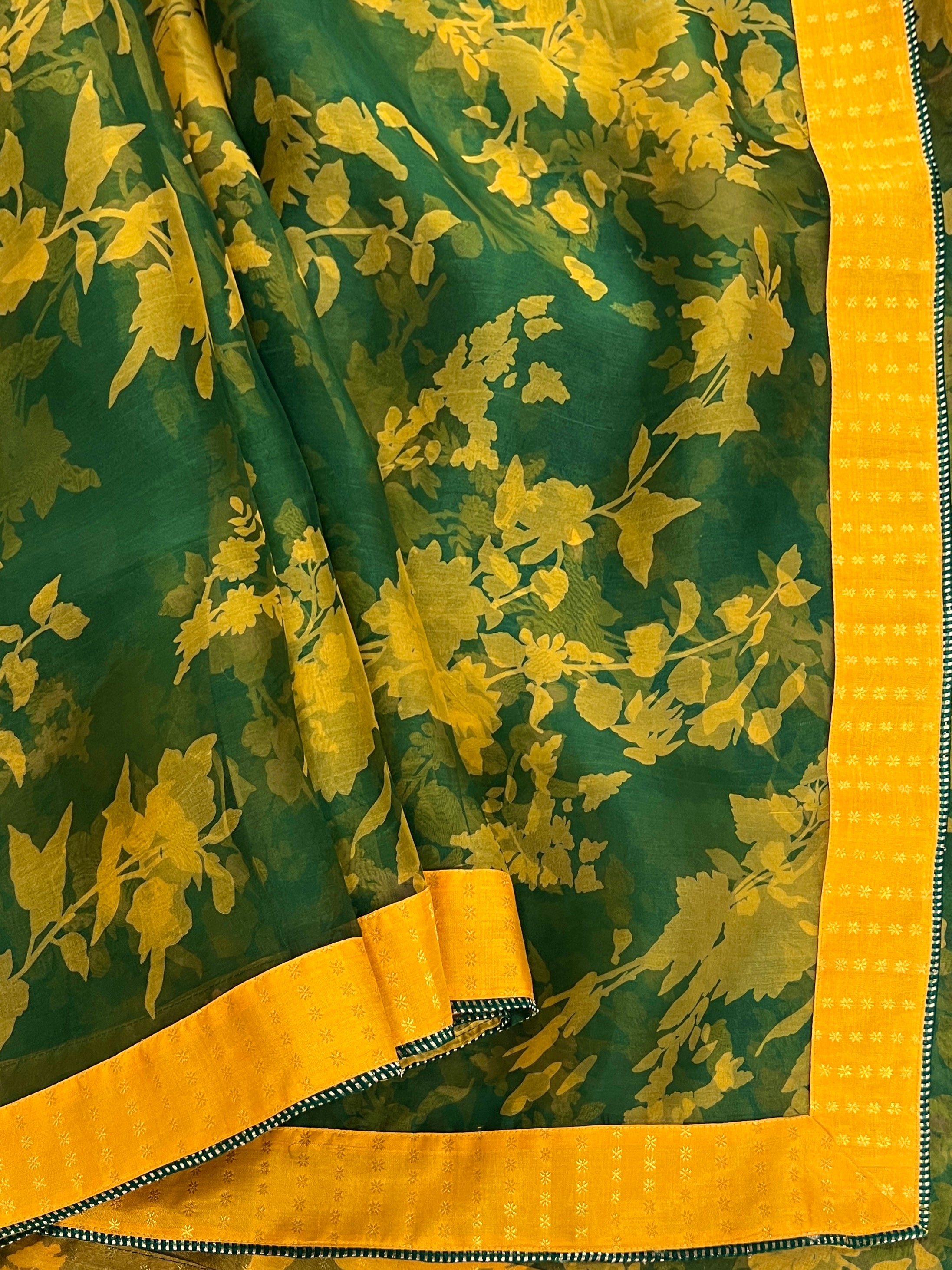 • Body features a large yellow floral motif on a plain pure silk base.