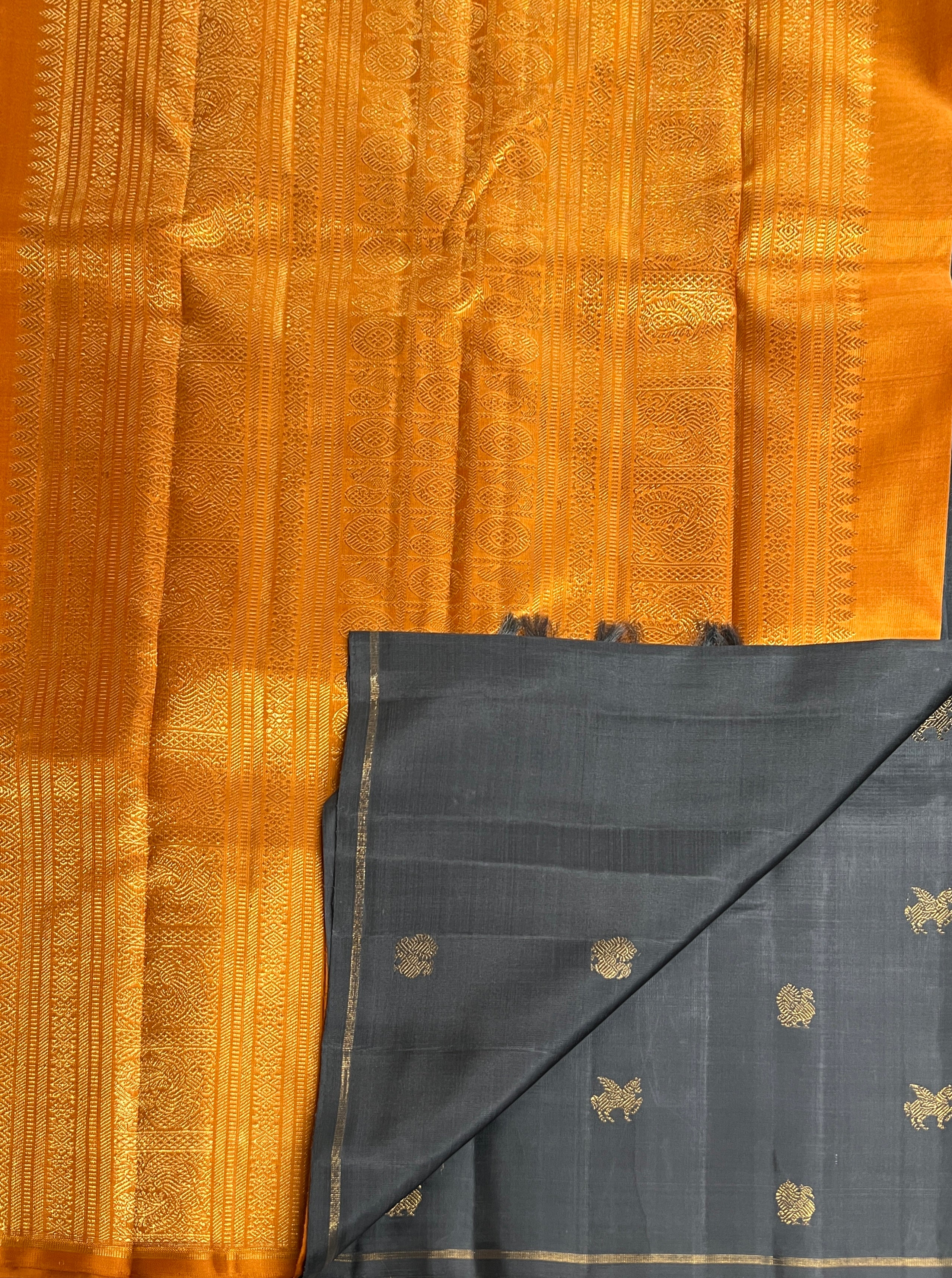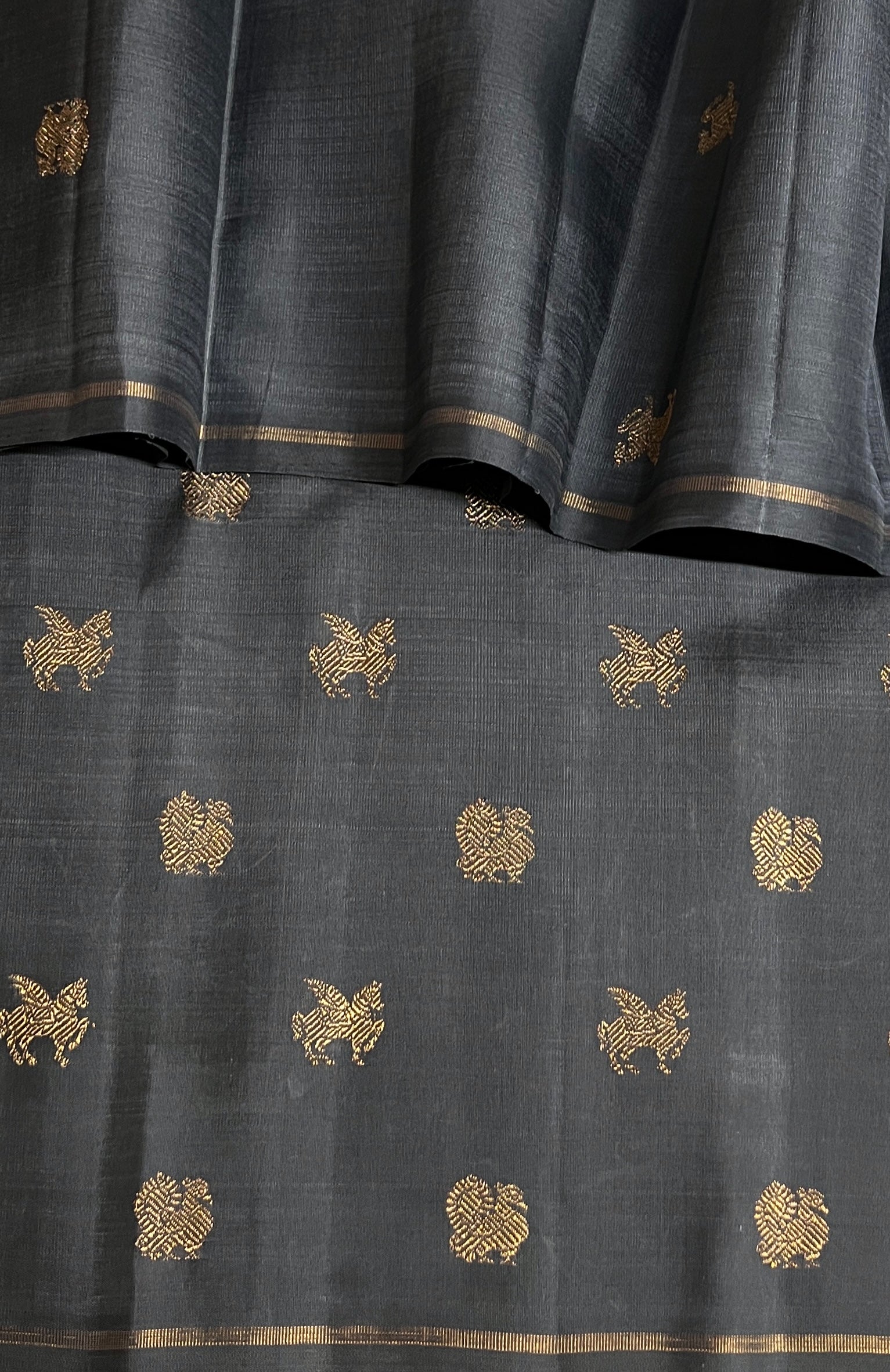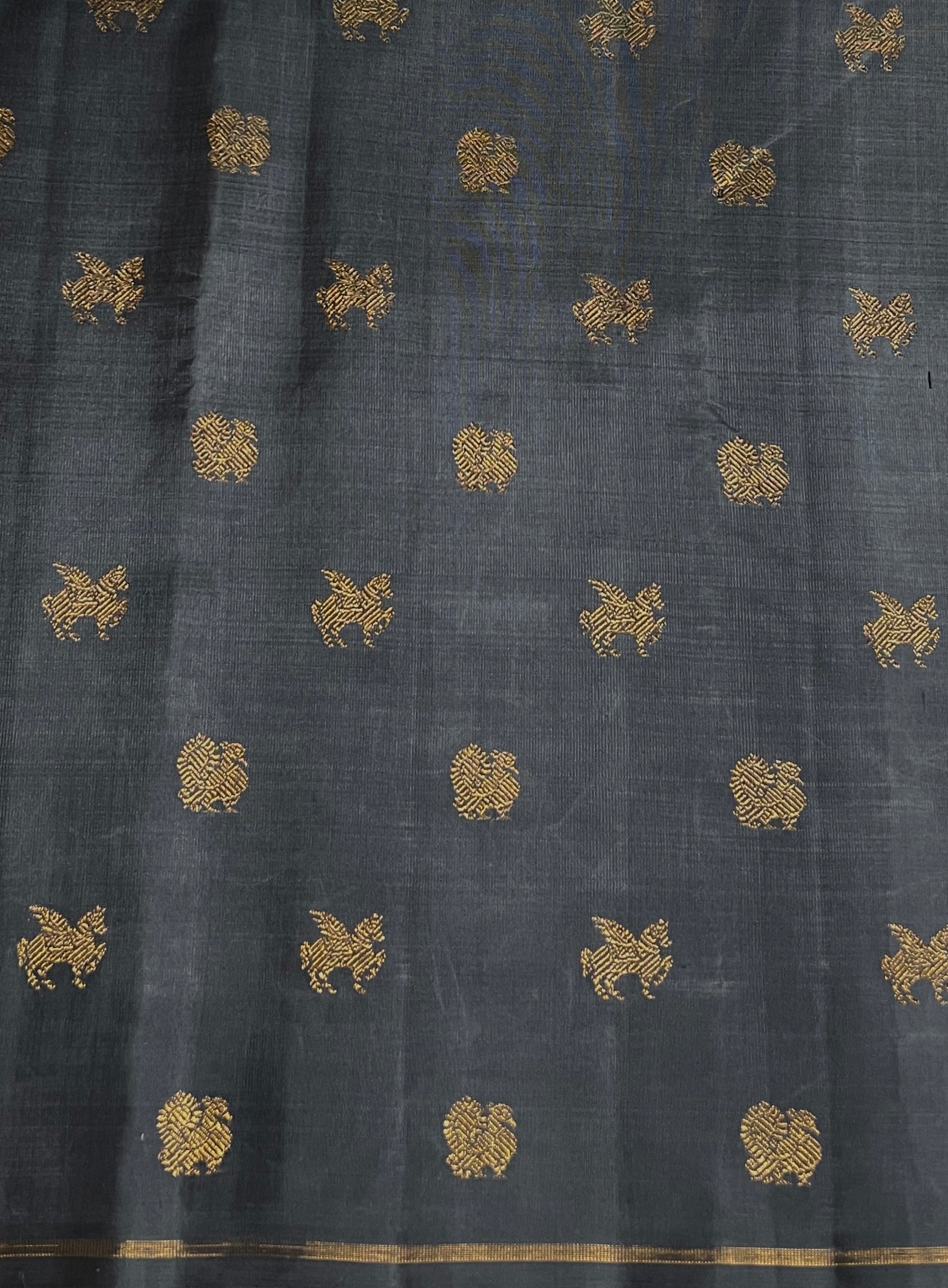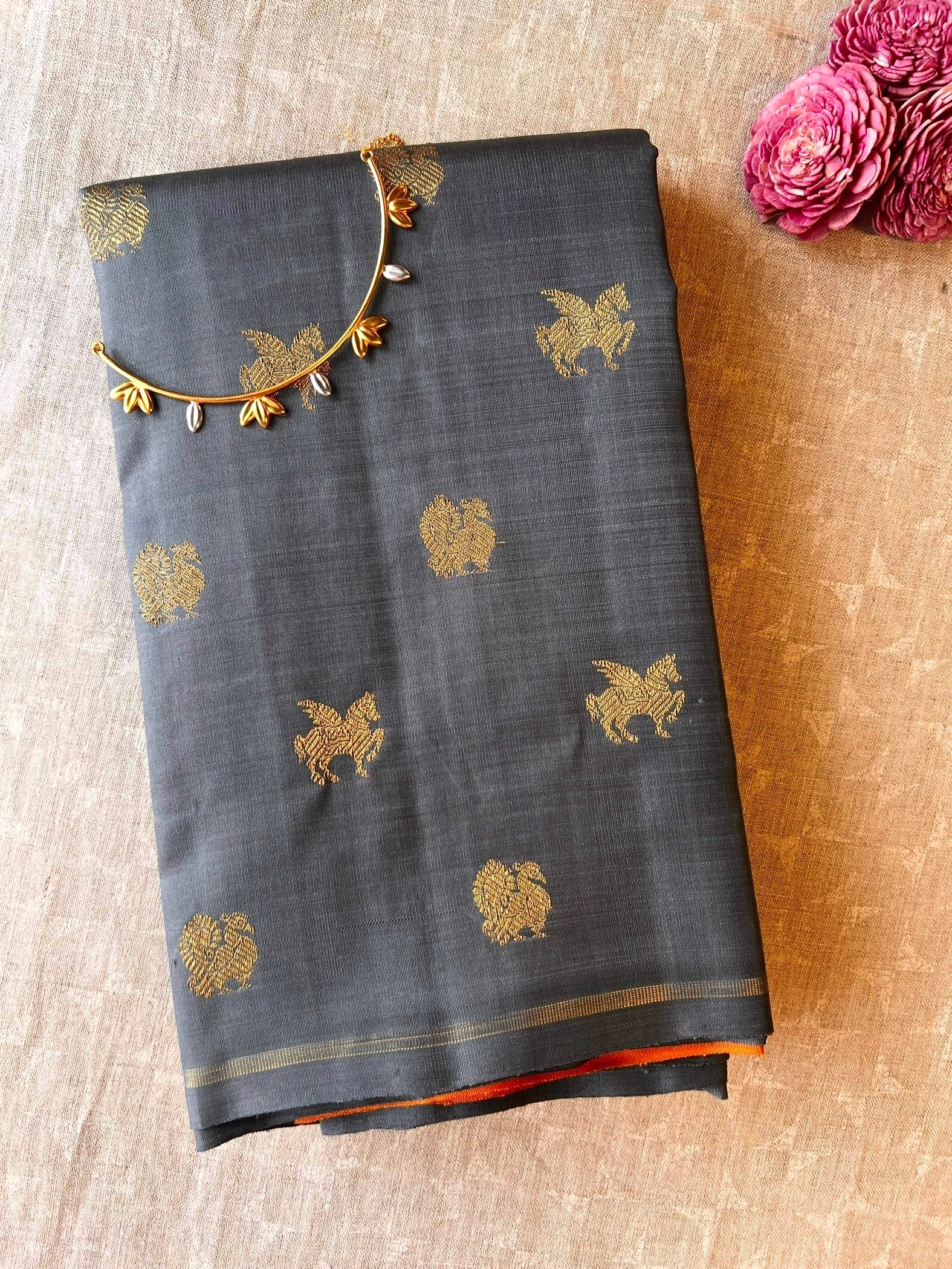 • Intricate and classical Annam & Ashva (Kudhirai) Motif on the Grey body.
