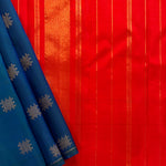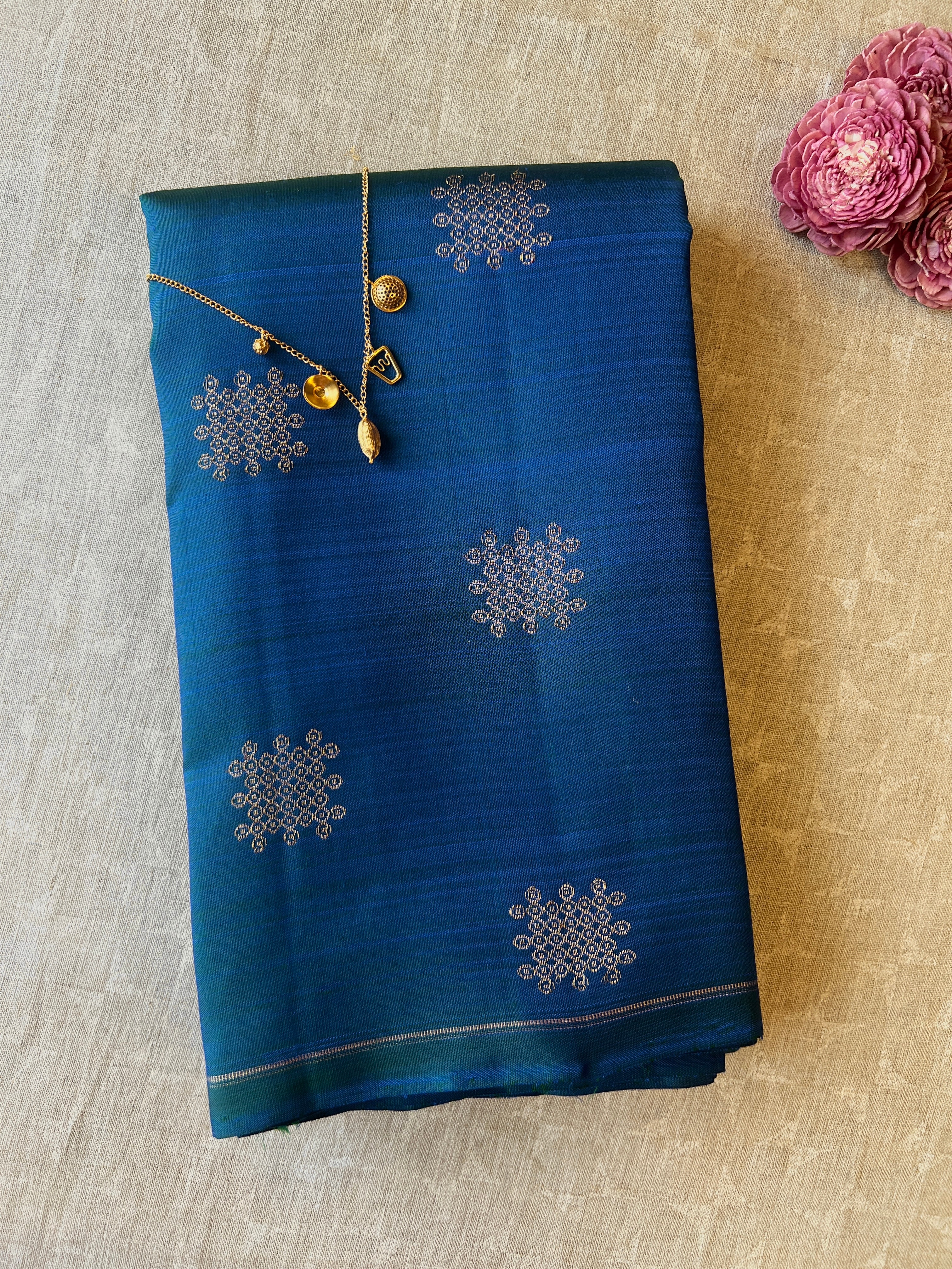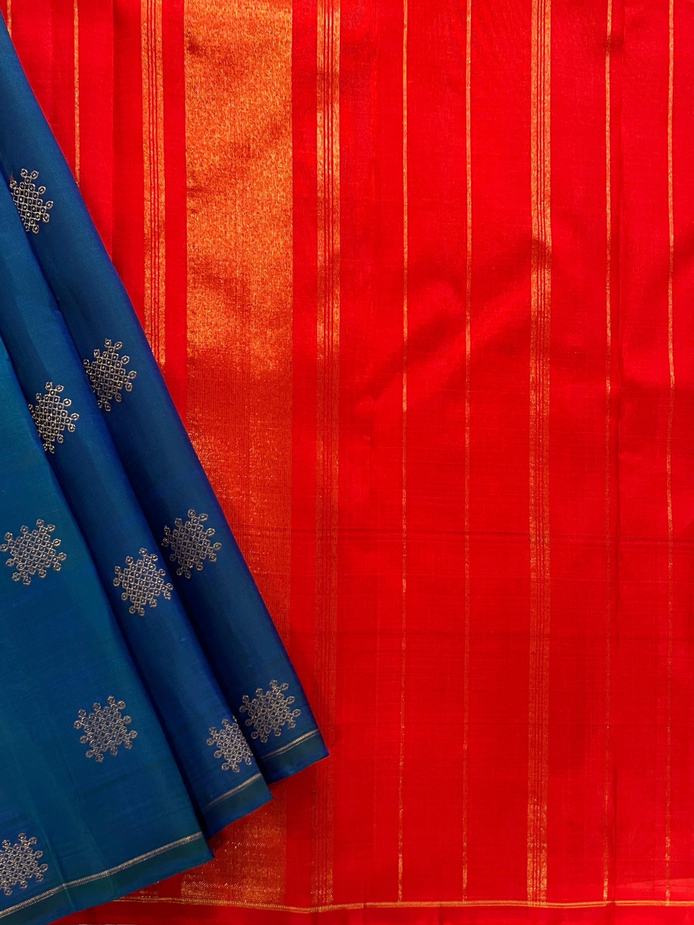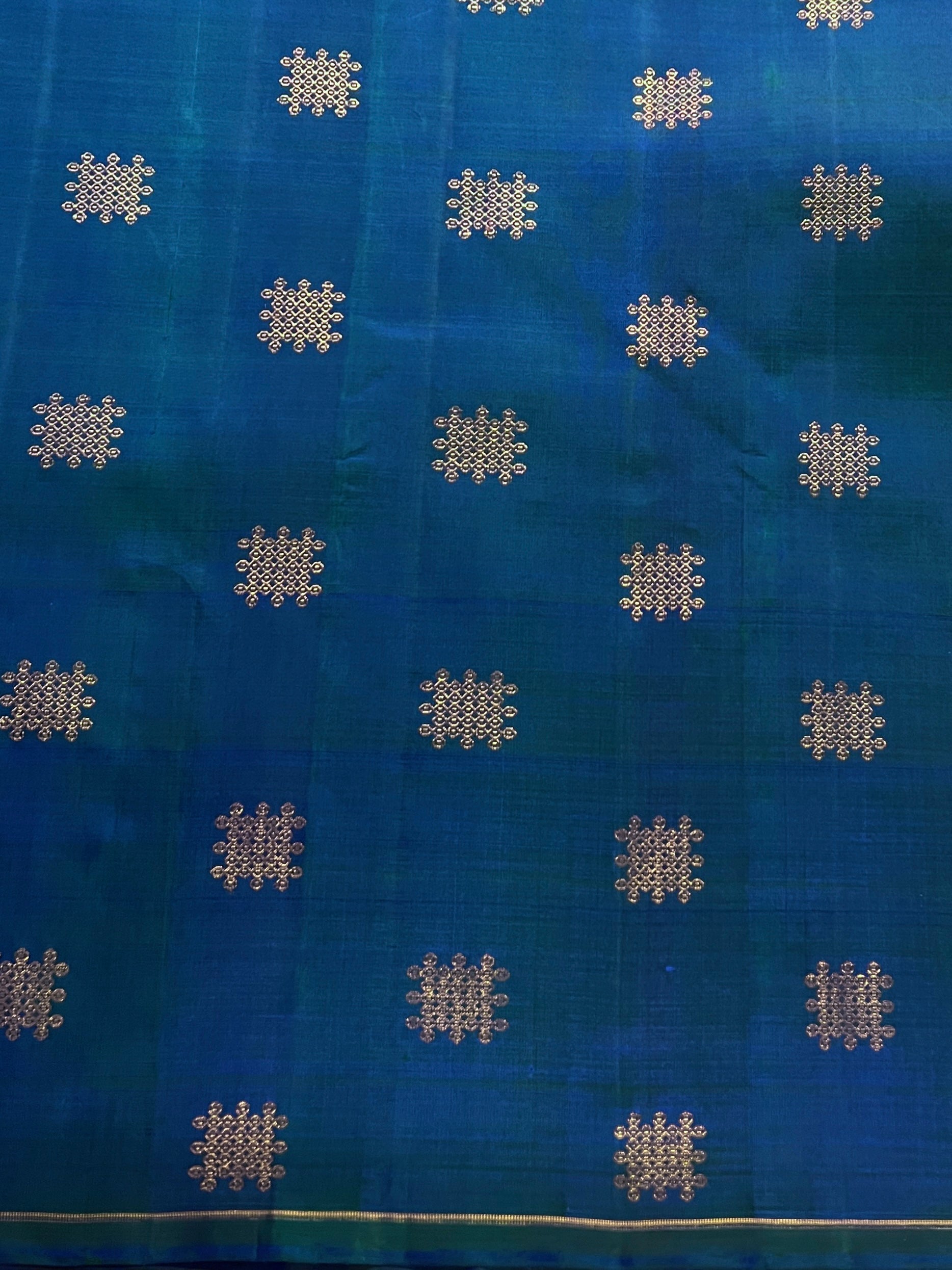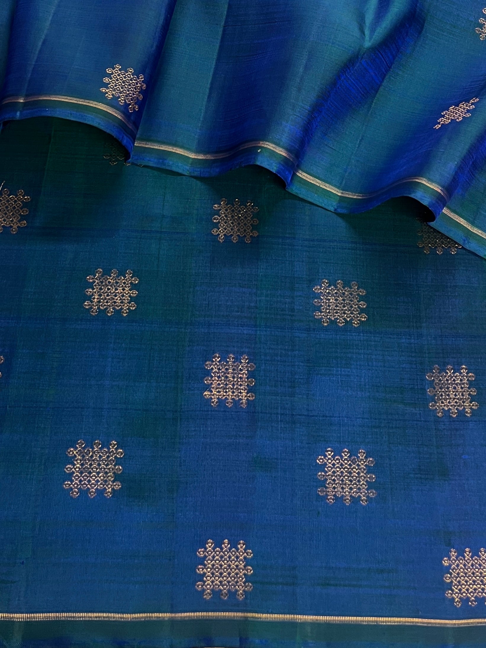 • Intricate and classical Kolam designs in Peacock Blue Body.