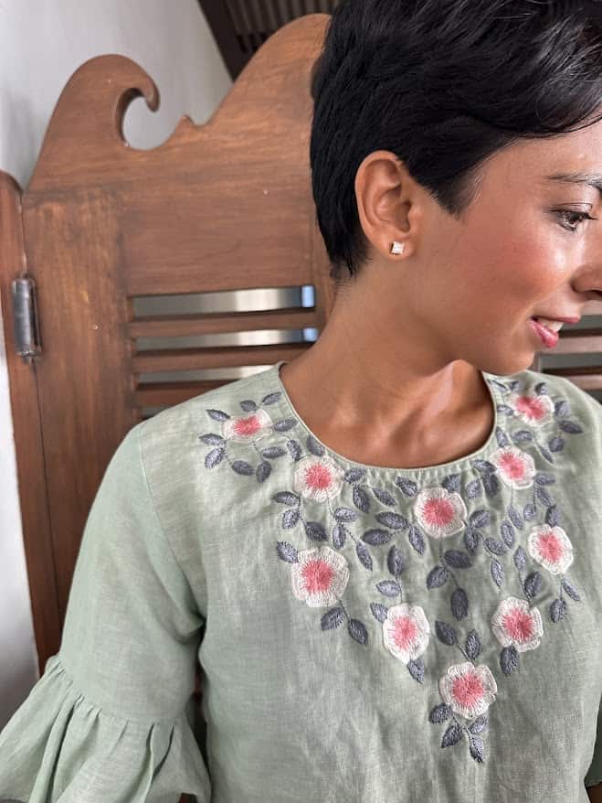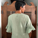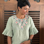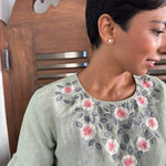 Green embroidered linen top Embroidery on the neckline Flutter sleeve detailing Top length 23" Pure linen To view other similar tops , click https://aavaranaa.com/shirts-amp-blouses/
