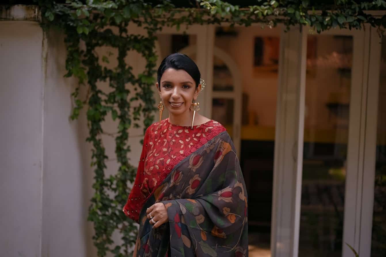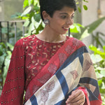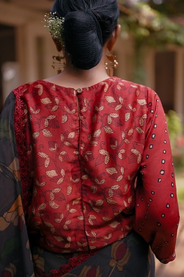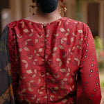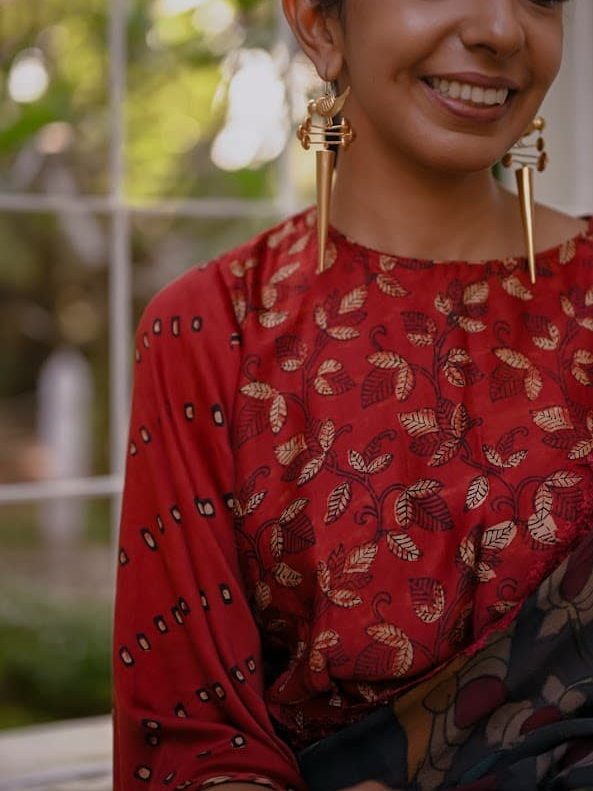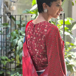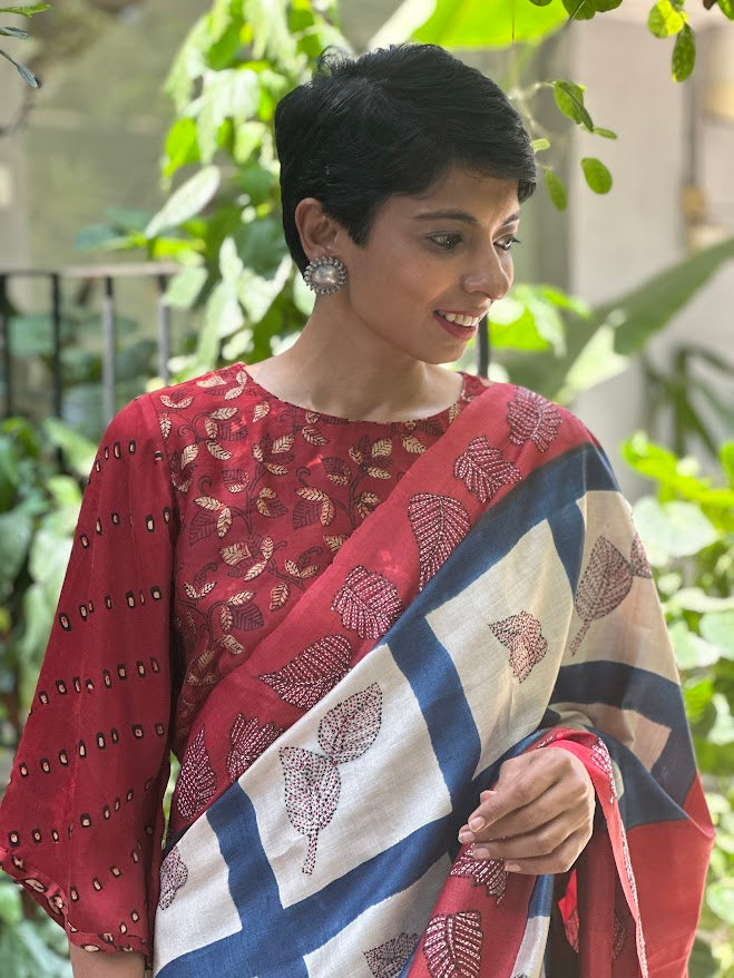 Ease into this winter wonderland kaftan style blouse in pure silk. Straddling the line between truly indian in a western silhoutte is this red ajrakh comfort fit blouse that can be paired with a saree as befittingly as it can be with a pair of high waisted pants.