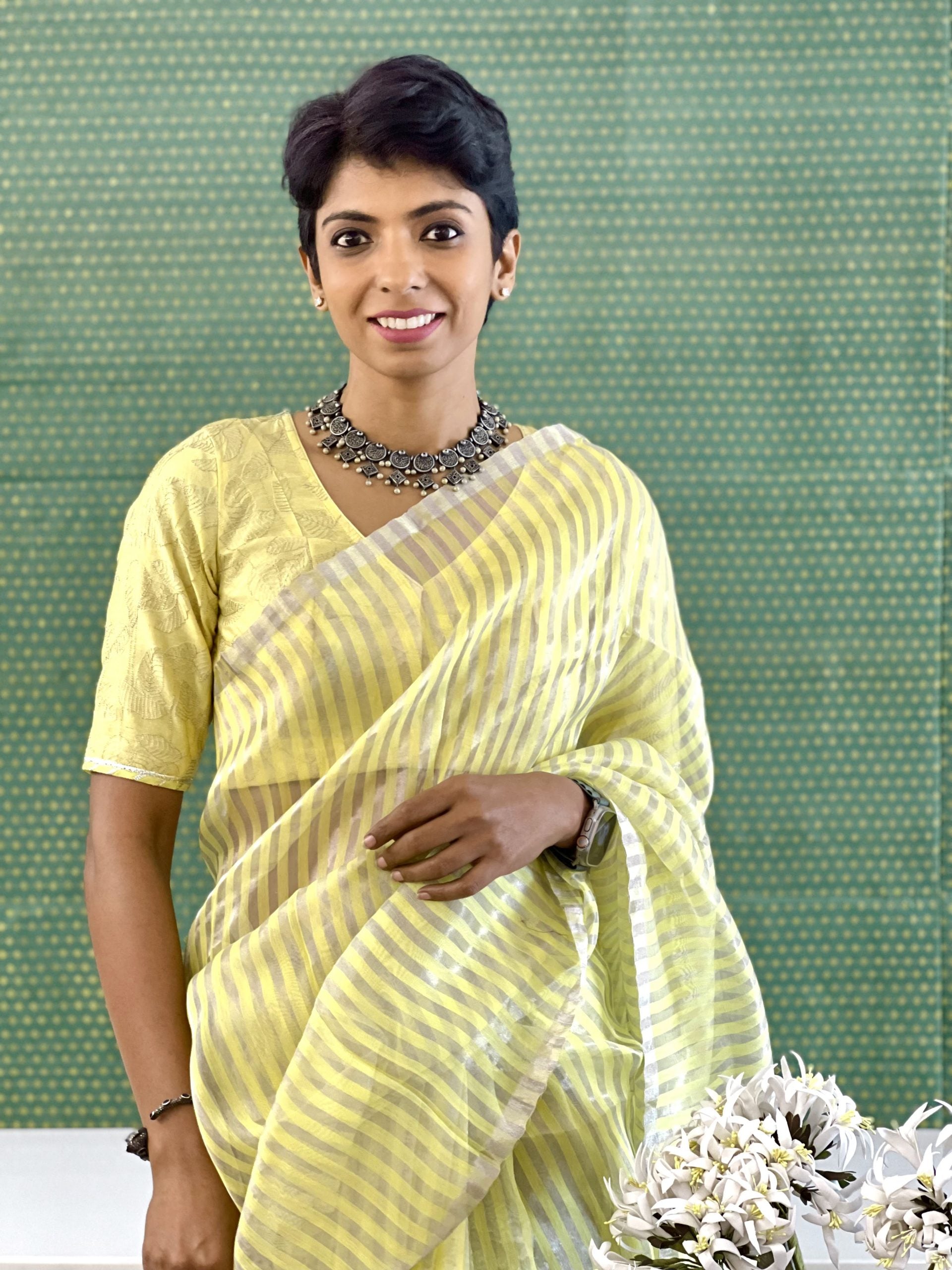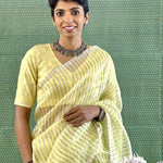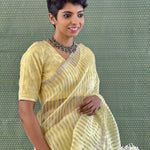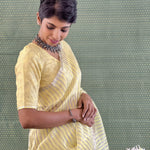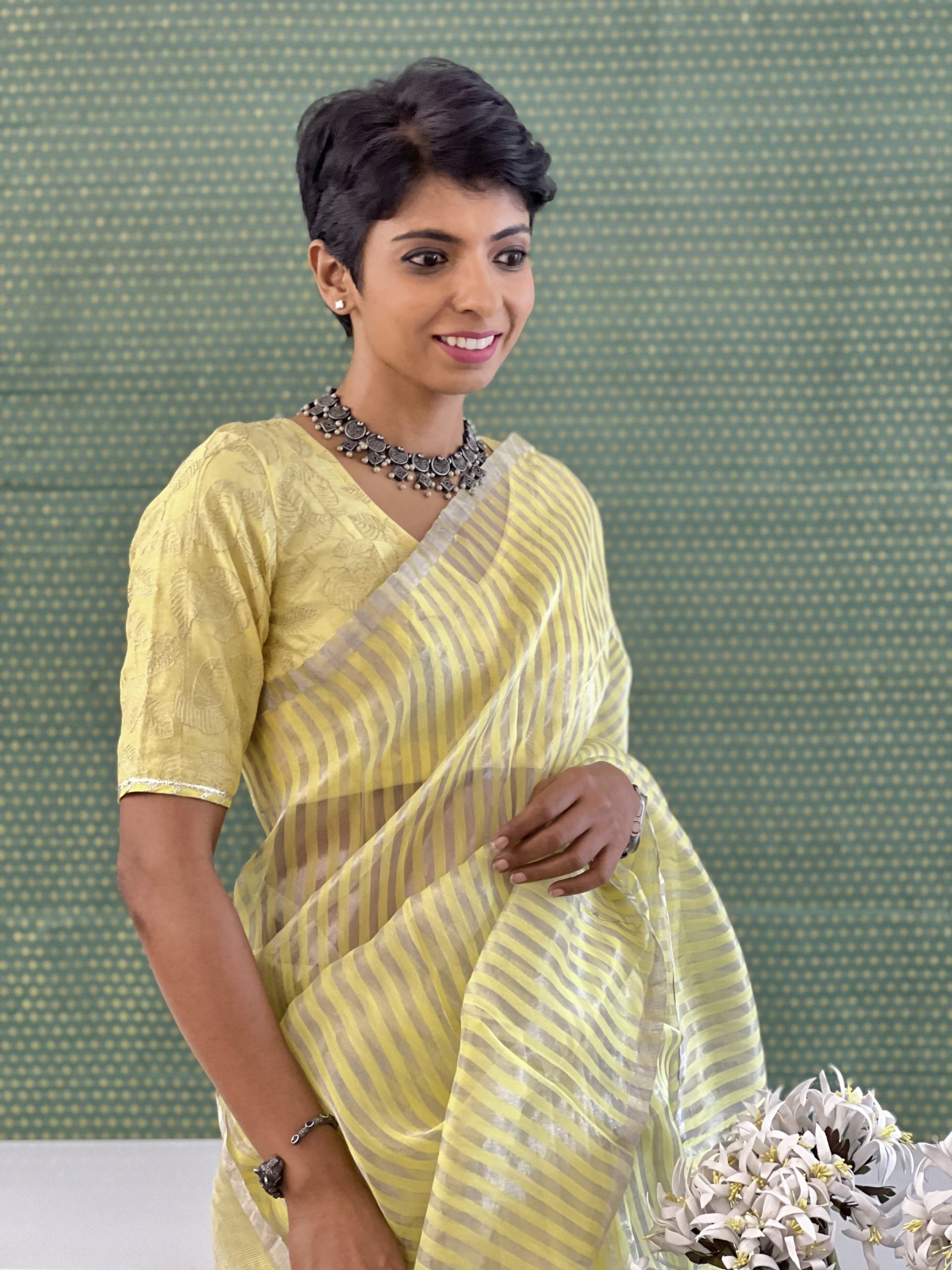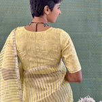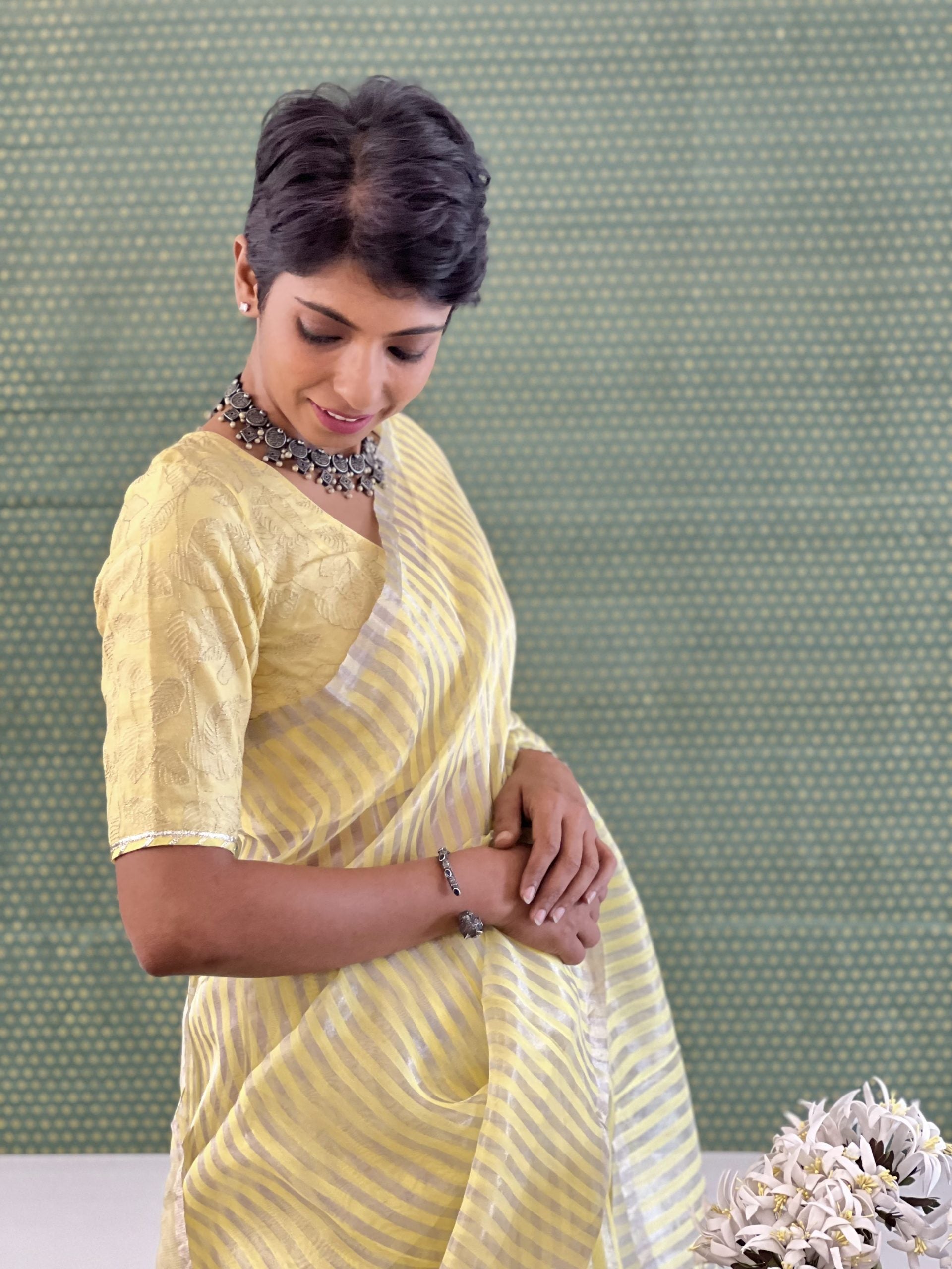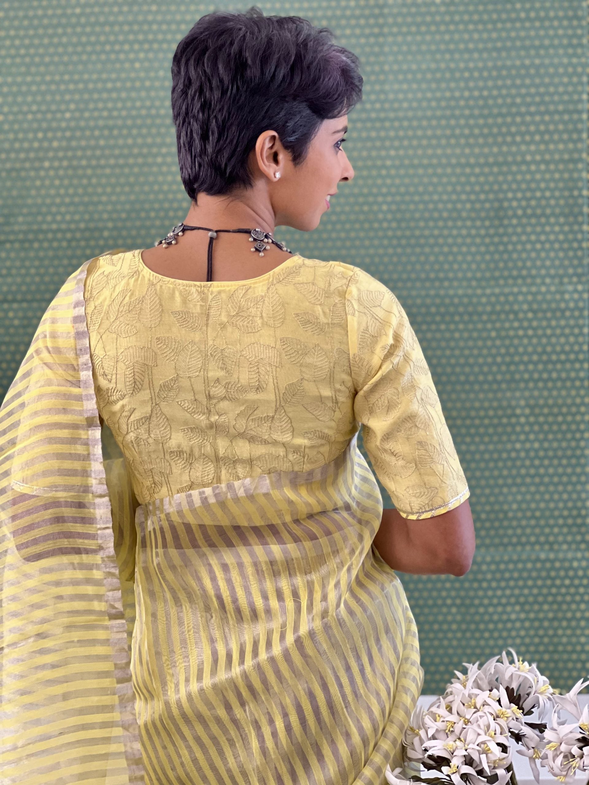 Lemon yellow chandheri blouse . The blouse features intricate leaf pattern embellished with zari thread, detailing at the sleeves with elbow-length, which provide a comfortable and modest fit. Blouse has scoop-neckline which gives a flattering and feminine silhouette. Note : The blouse is completely lined with mul mul cotton.