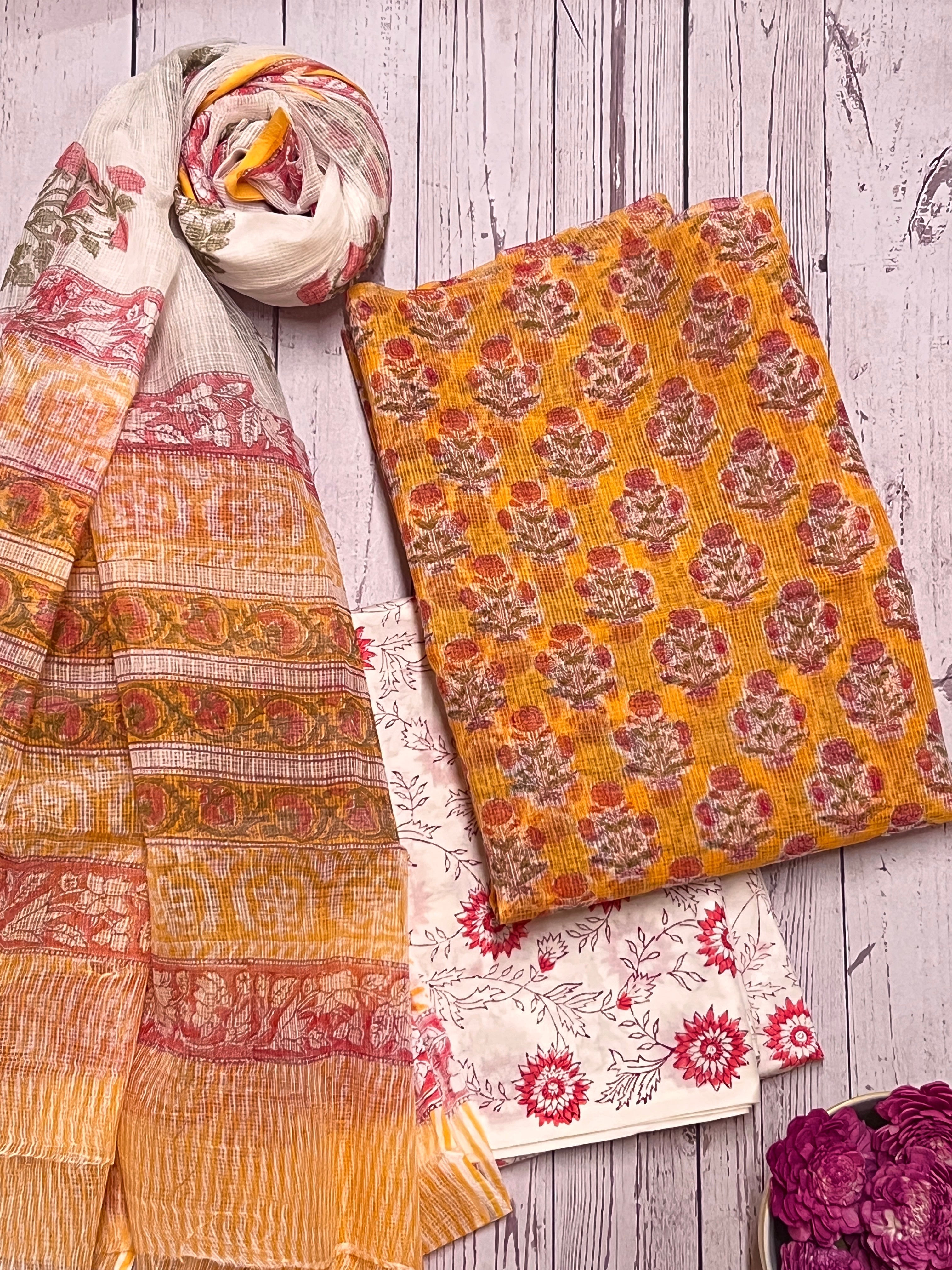 • 4 piece set, comes with a paired lining, printed cotton bottom fabric and kota doriya dupatta