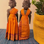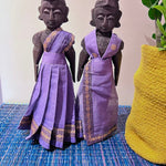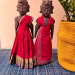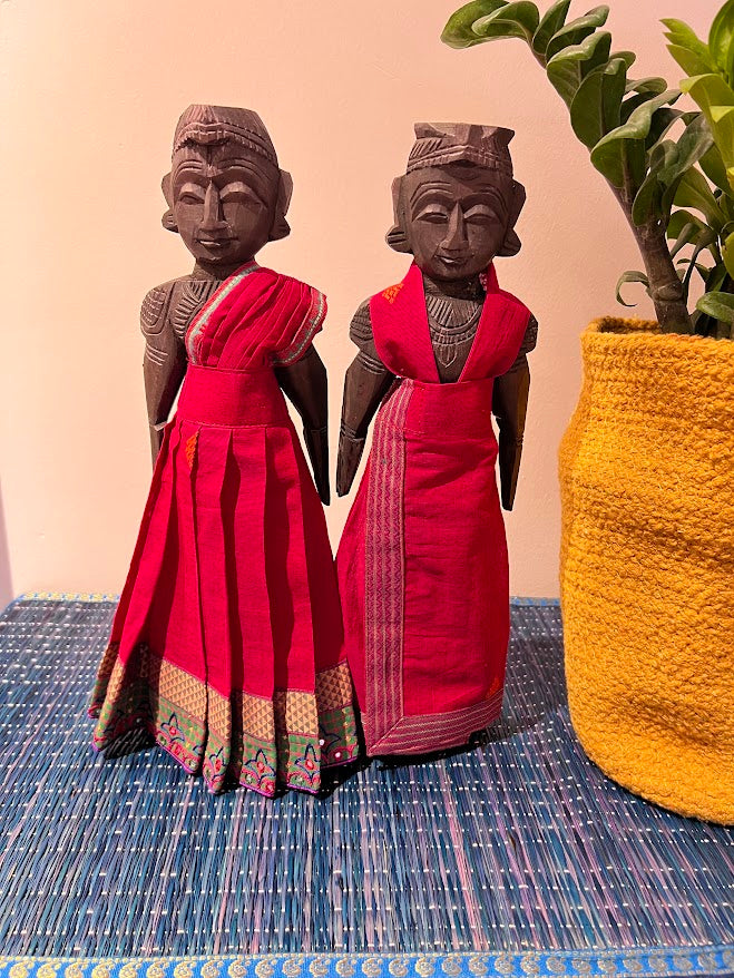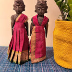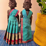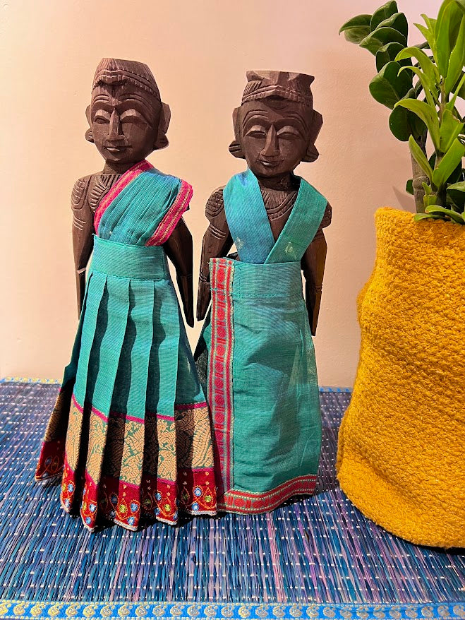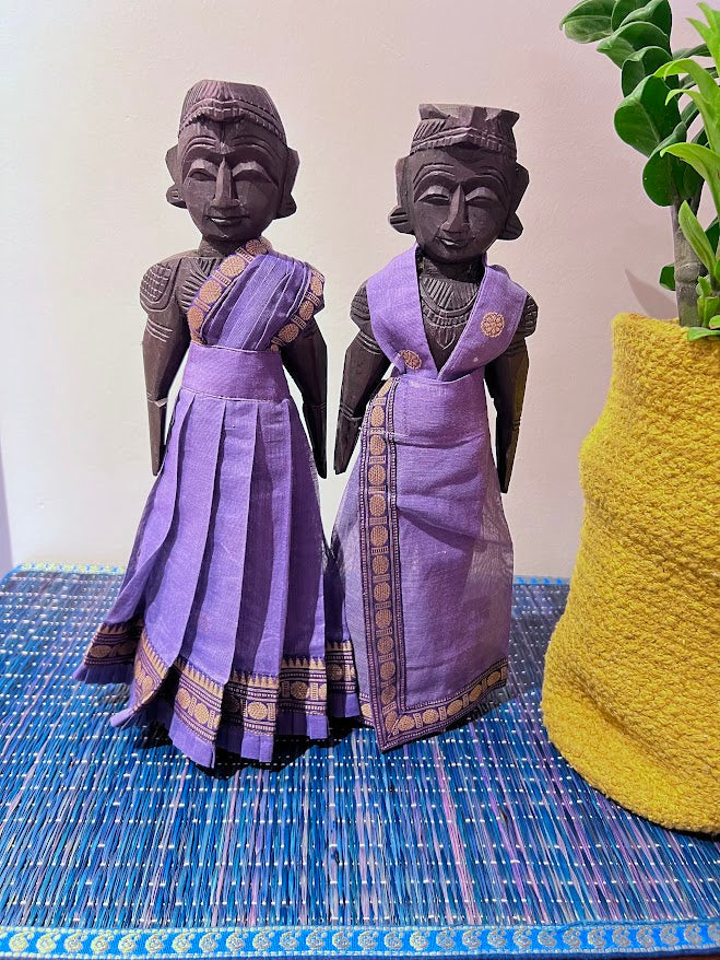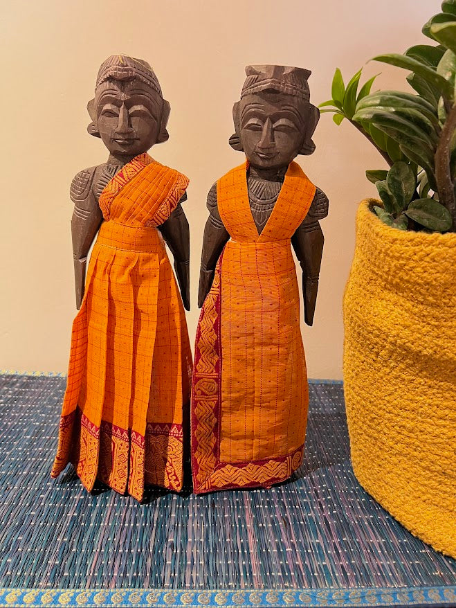 A pair of handcrafted wooden marapatchi dolls , with cotton outfits for Him and Her. Outfits are handwoven, upcycled fabrics from the Aavaranaa range