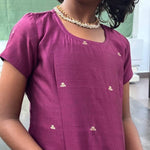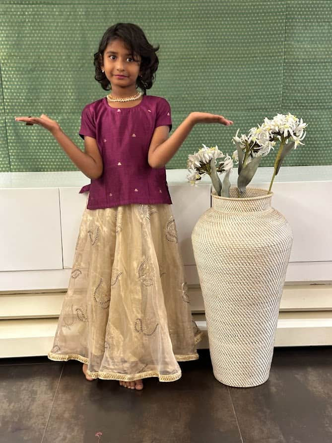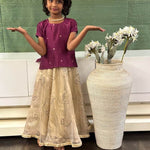 Magenta silk top with gold tissue embroidered skirt. The skirt and blouse are lined with soft mul cotton.