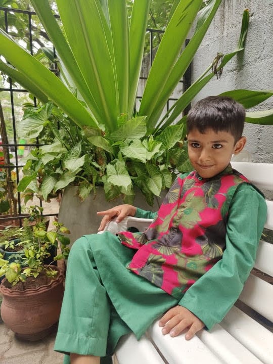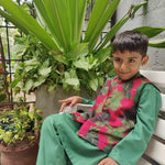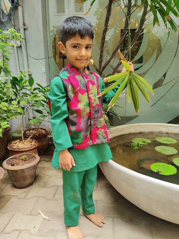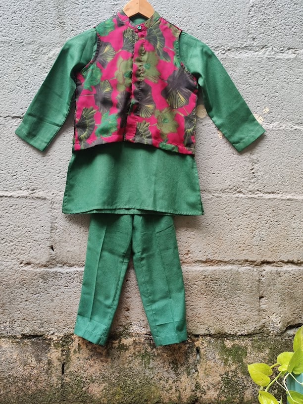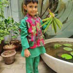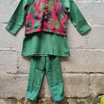 Pink and green printed satin jacket paired with? green cotton tussar kurta and pants.