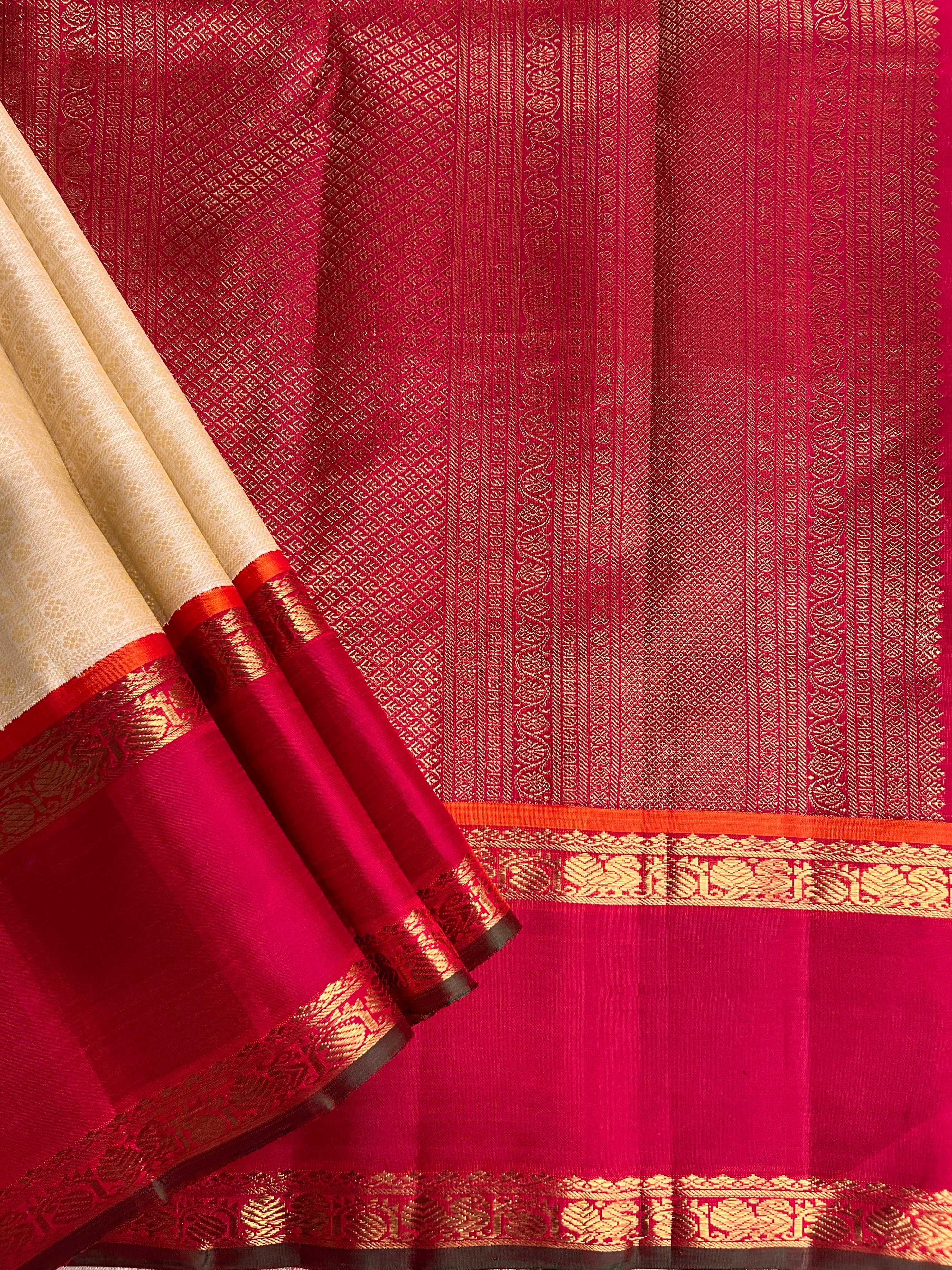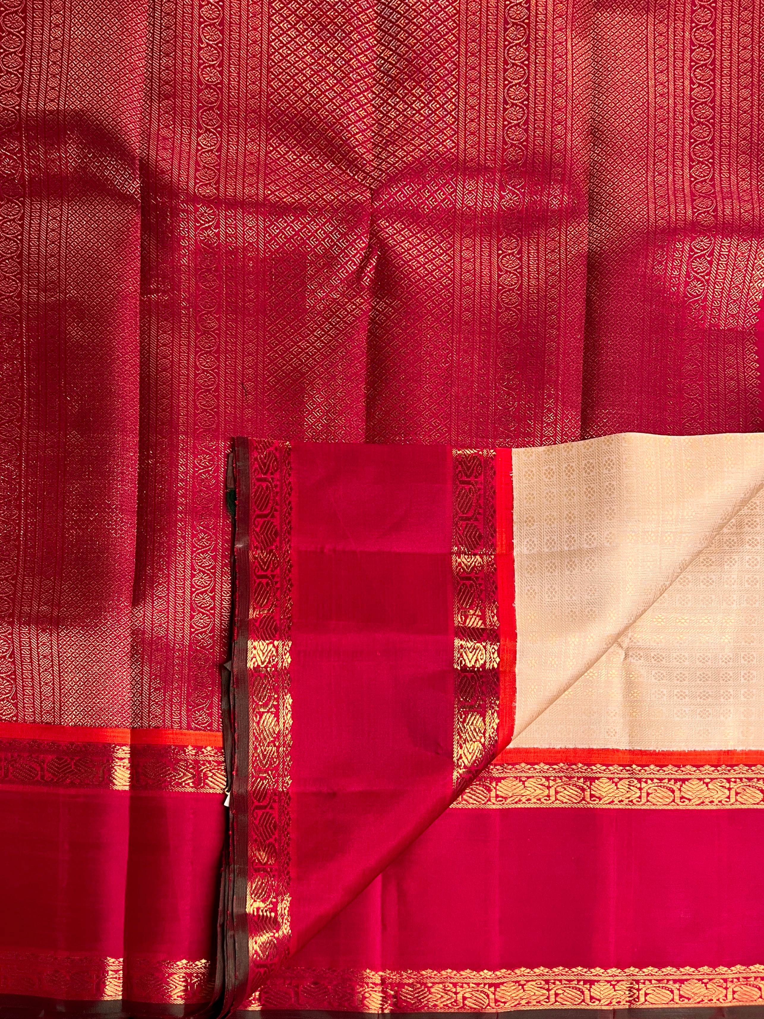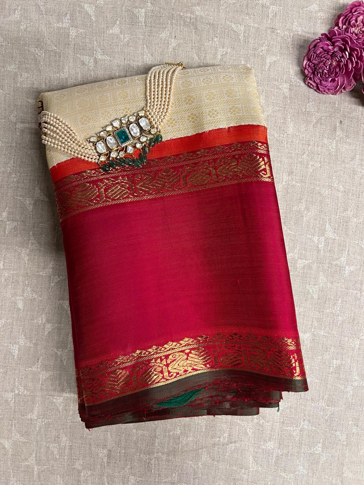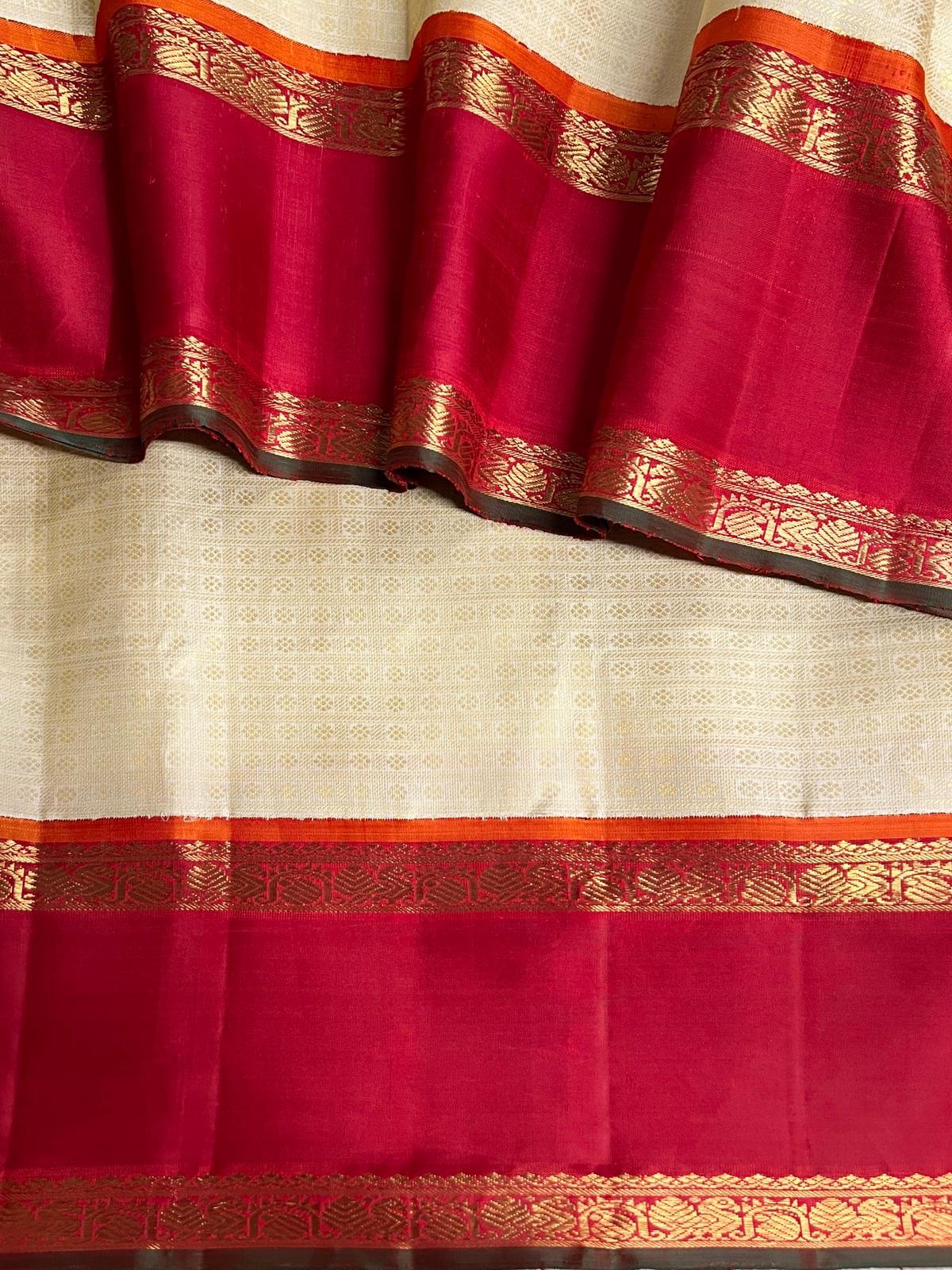 - The pallu is richly woven with classic patterns , like the thuthiripoo and paisly , in pure zari