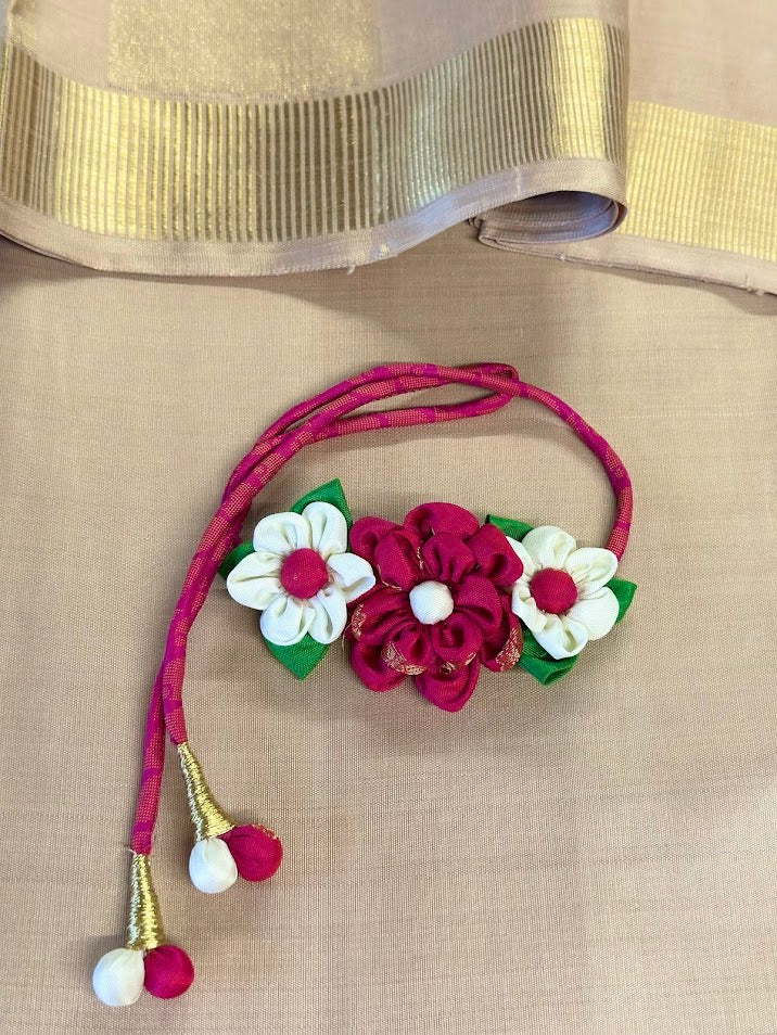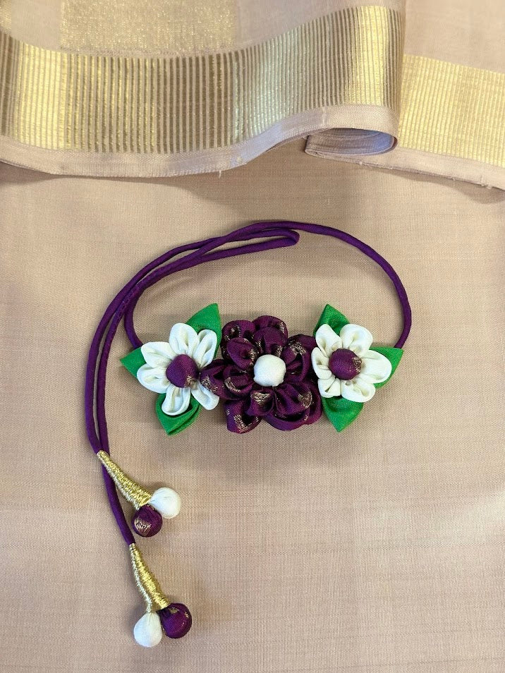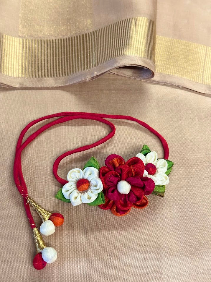 A beautifully upcycled hair accessory,made from tiny silk fabrics. These are carefully crafted by hand by skilled artisans with attention to detail,They can be worn as hair accessories, necklace or used as curtain ties also.